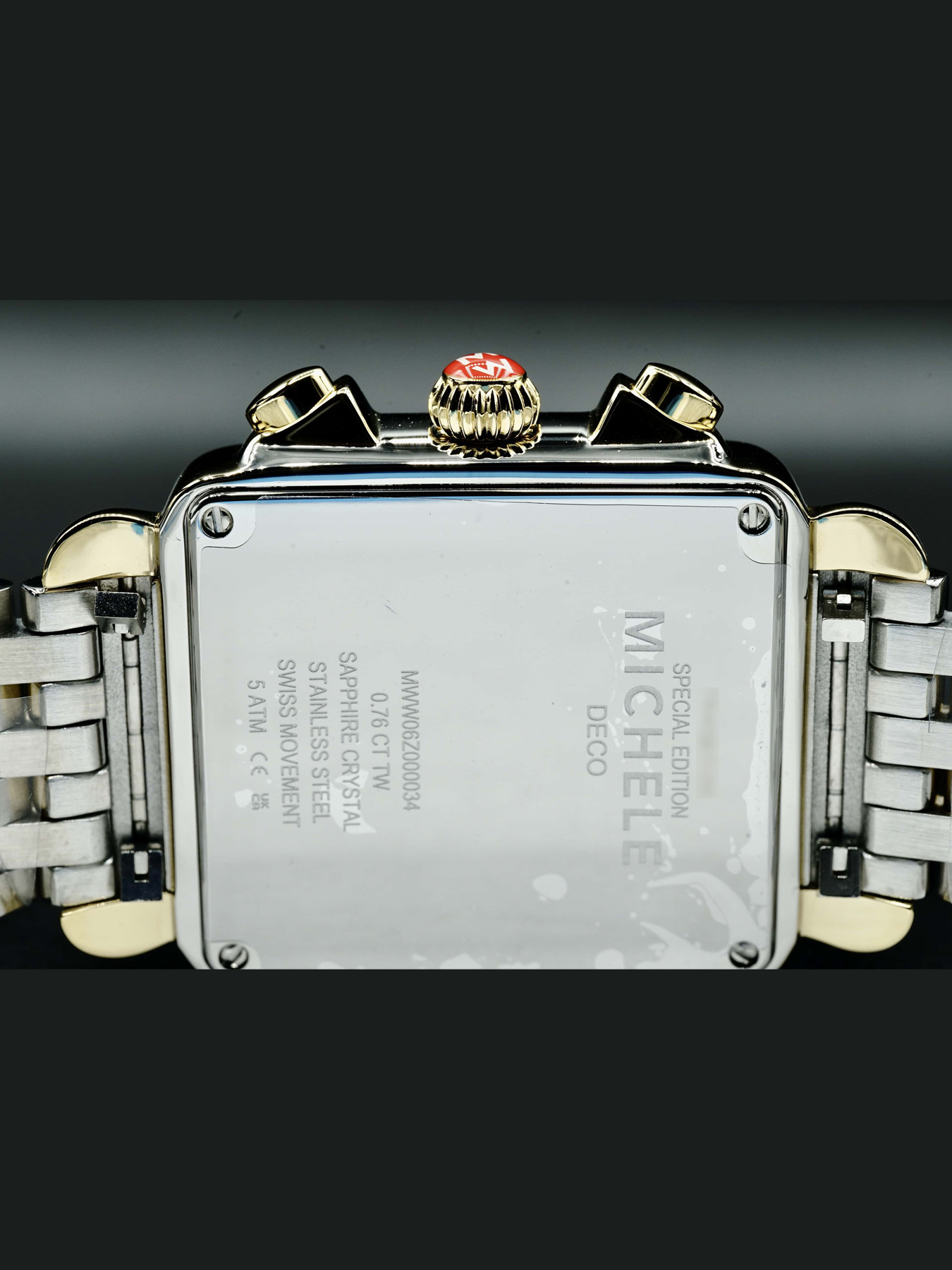 This Michele Deco XL Two-Tone 18k Gold features a 36mm stainless steel case with a diamond-set bezel on a stainless steel two-tone silver/gold-tone bracelet. This watch also sports a white mother of pearl dial with luminous yellow gold-tone hands and diamond dial markers covered by scratch resistant sapphire crystal.