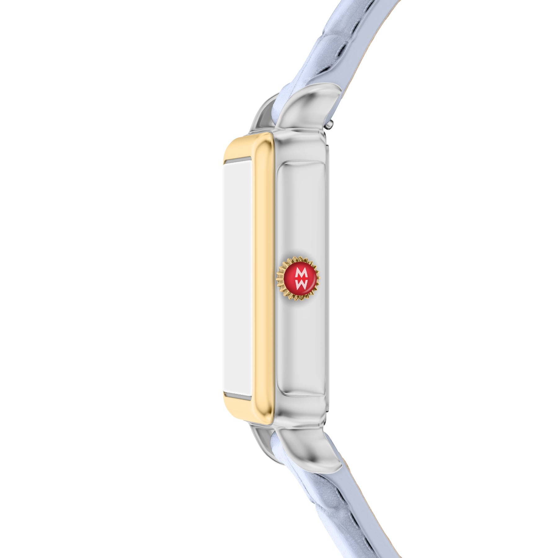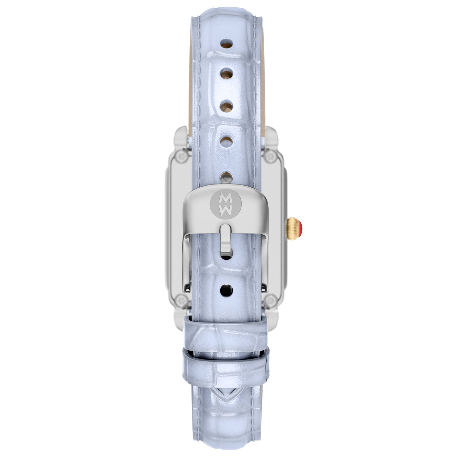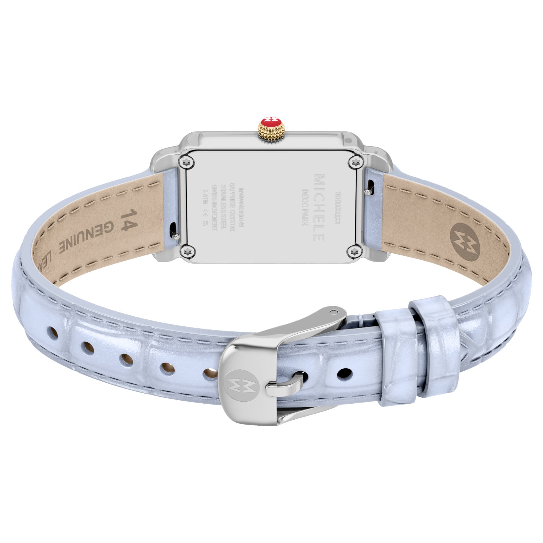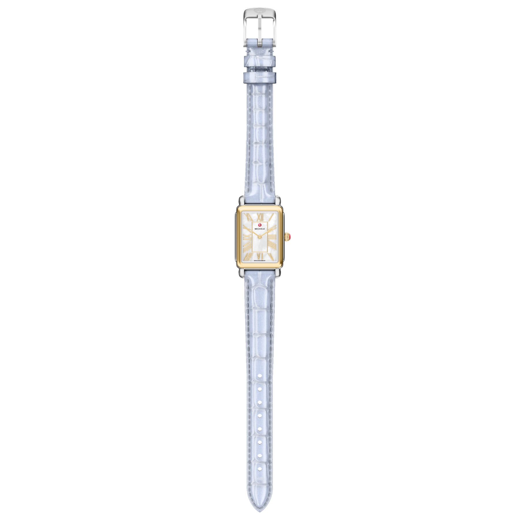 Elegant and architectural, this rectangular watch from the Deco Park collection perfectly balances form and function. The glossy white mother-of-pearl dial is housed within a 18K gold-plated and stainless steel case and Swiss movement. The pastel blue croco-calf leather strap is made specifically for the Deco Park collection and is interchangeable with any 14 mm MICHELE strap.
