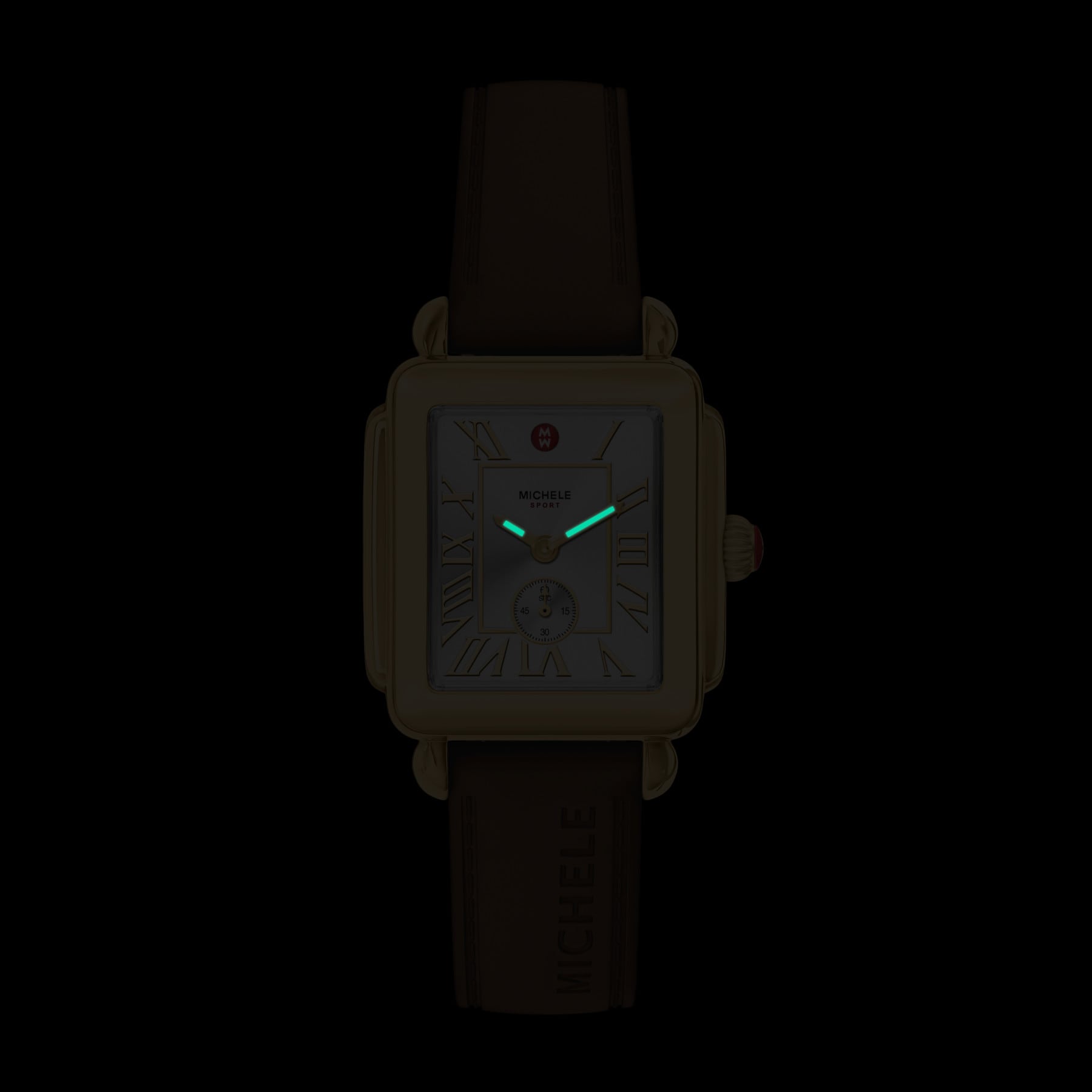 The Deco Sport Mid combines a brown colour with refined design. Its 31 mm rectangular stainless steel case frames a white sunray dial, accented with polished roman numeral indexes and a sub-second movement. The brown silicone strap, is interchangeable with any 16 mm strap from MICHELE's collection, adding versatility to the design.
