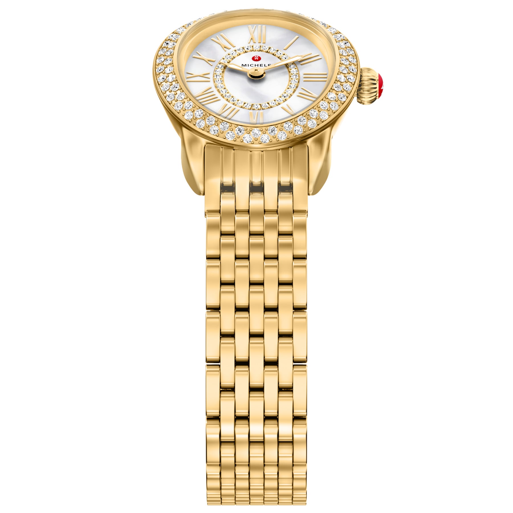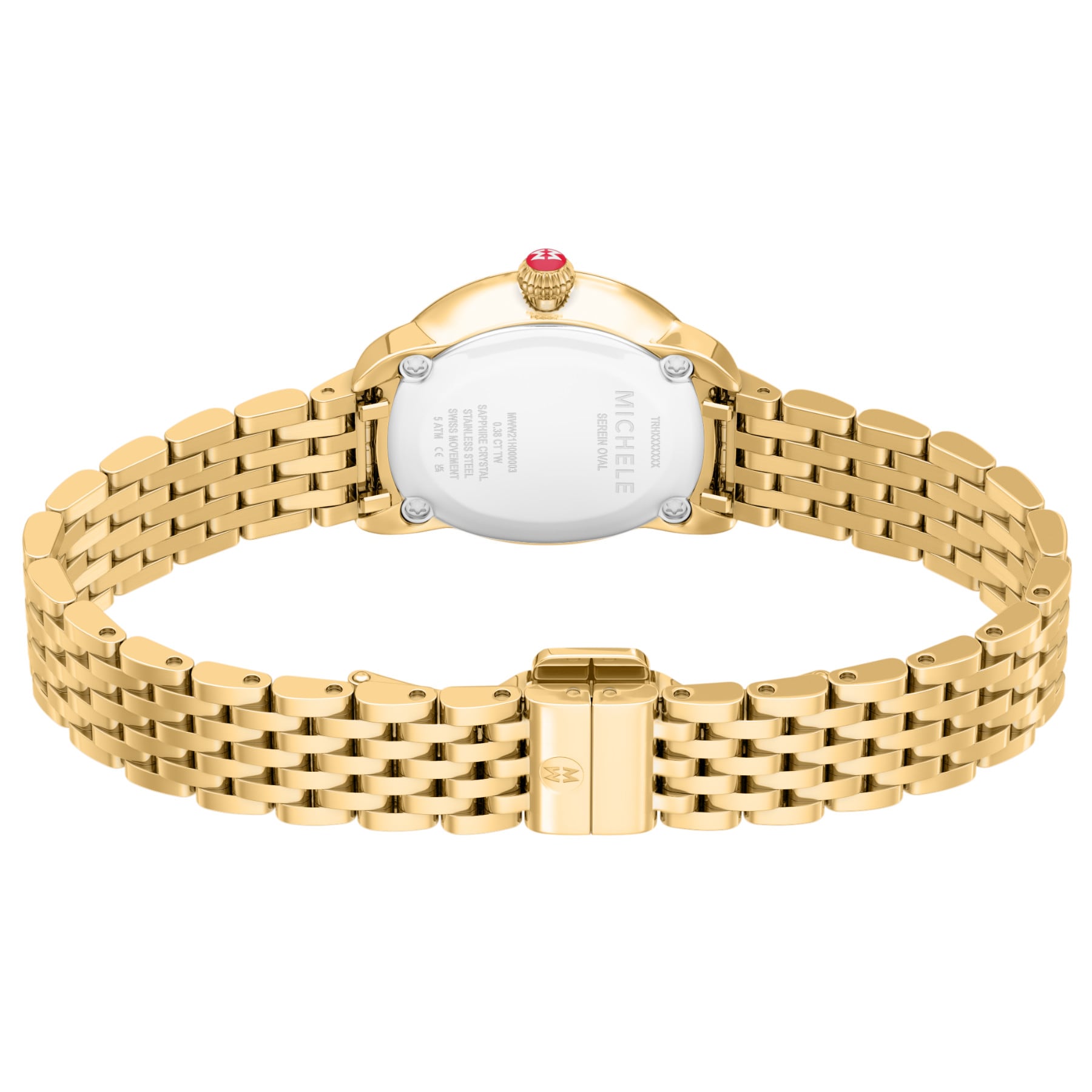 This petite 18K gold-plated oval timepiece perfectly balances vintage-inspired style with a modern edge. The white mother-of-pearl dial shines with 112 diamond accents (0.38 carat weight) and Swiss movement. The 18K gold-plated bracelet is made specifically for the Serein Oval collection and is interchangeable with any 12 mm MICHELE strap.