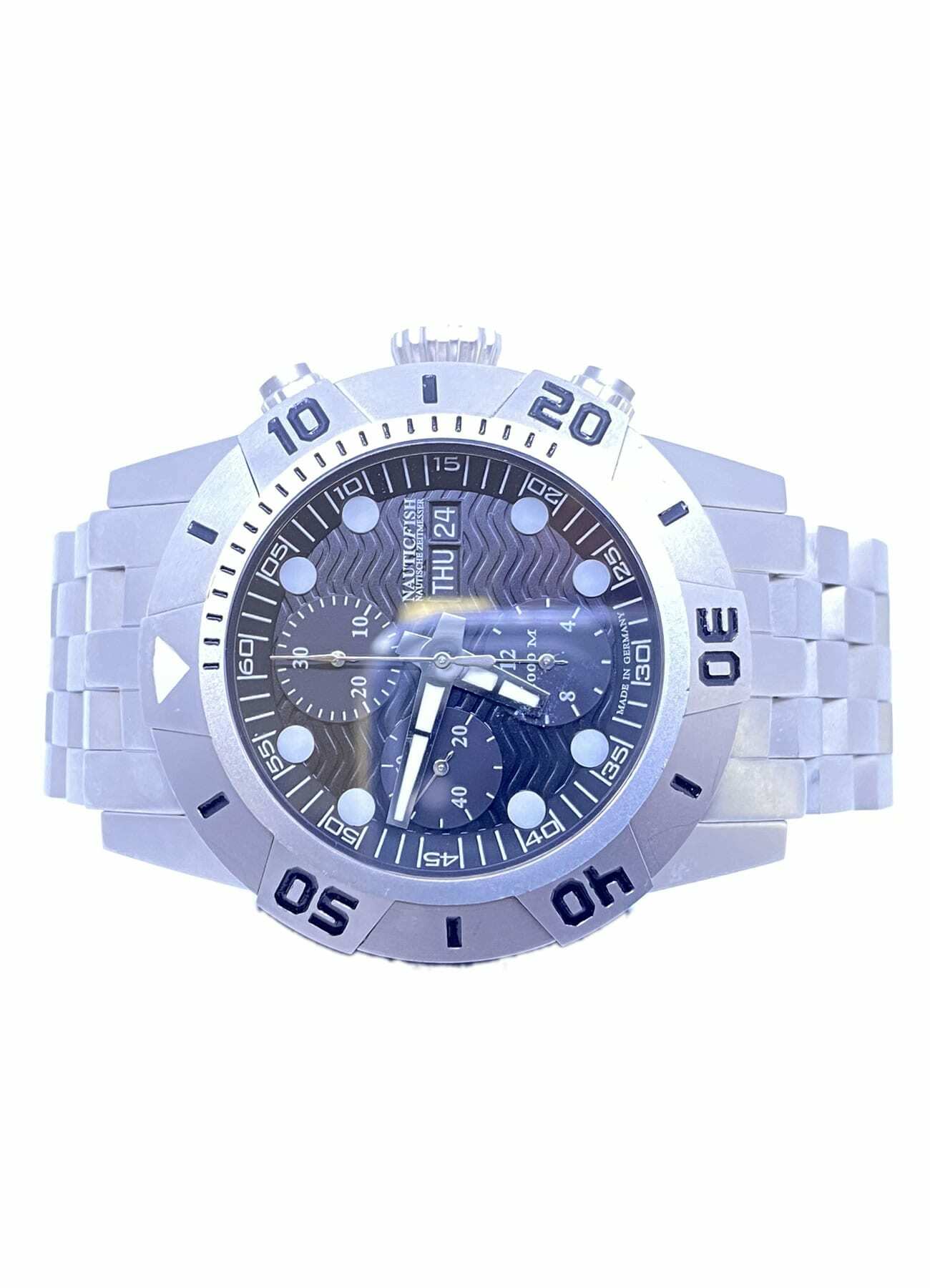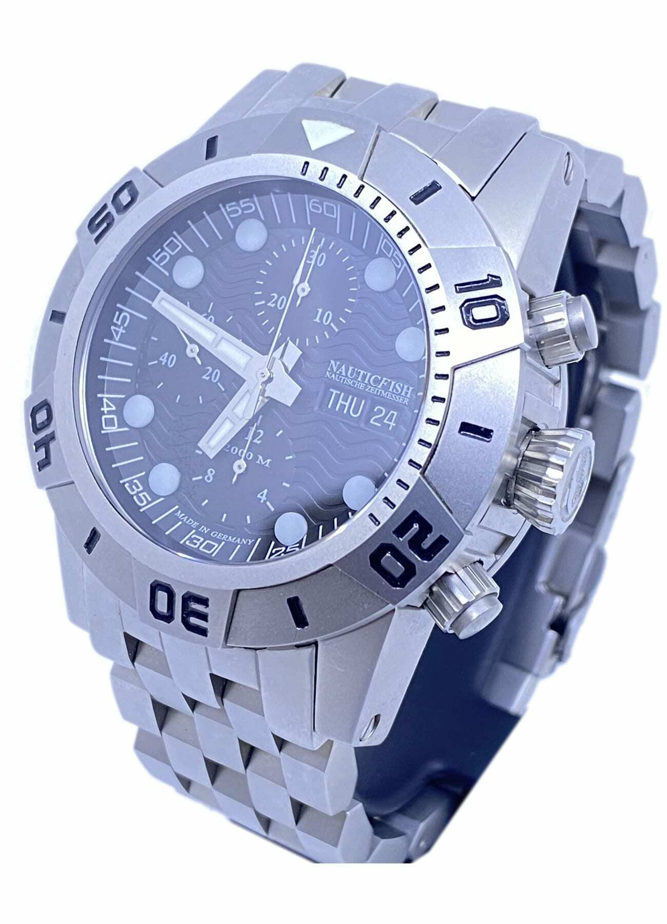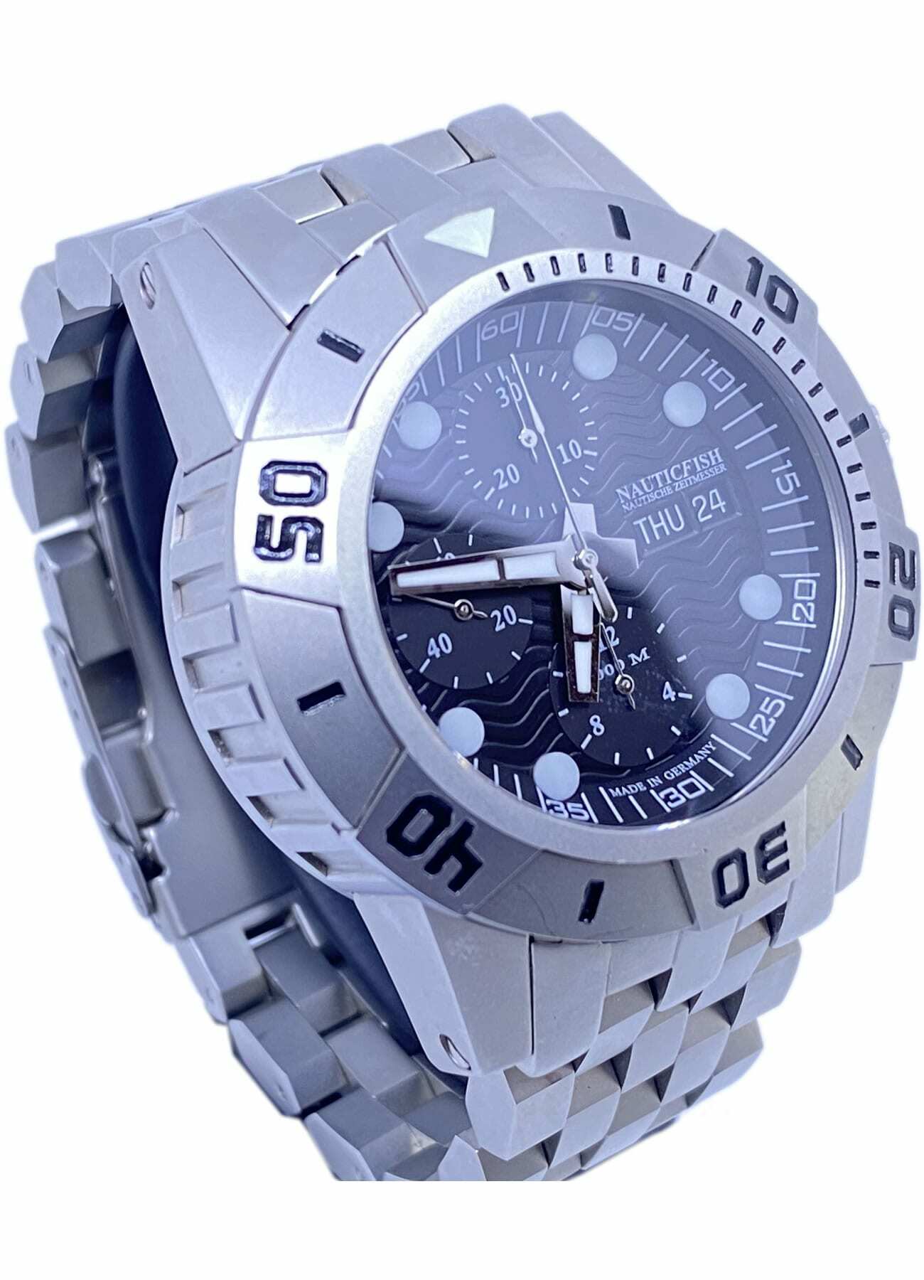 - This timepiece features a 45mm steel case paired with a high quality steel bracelet. It showcases a distinctive black dial and is powered by a precise automatic winding movement. The watch is designed with a water resistance of up to 2000m.