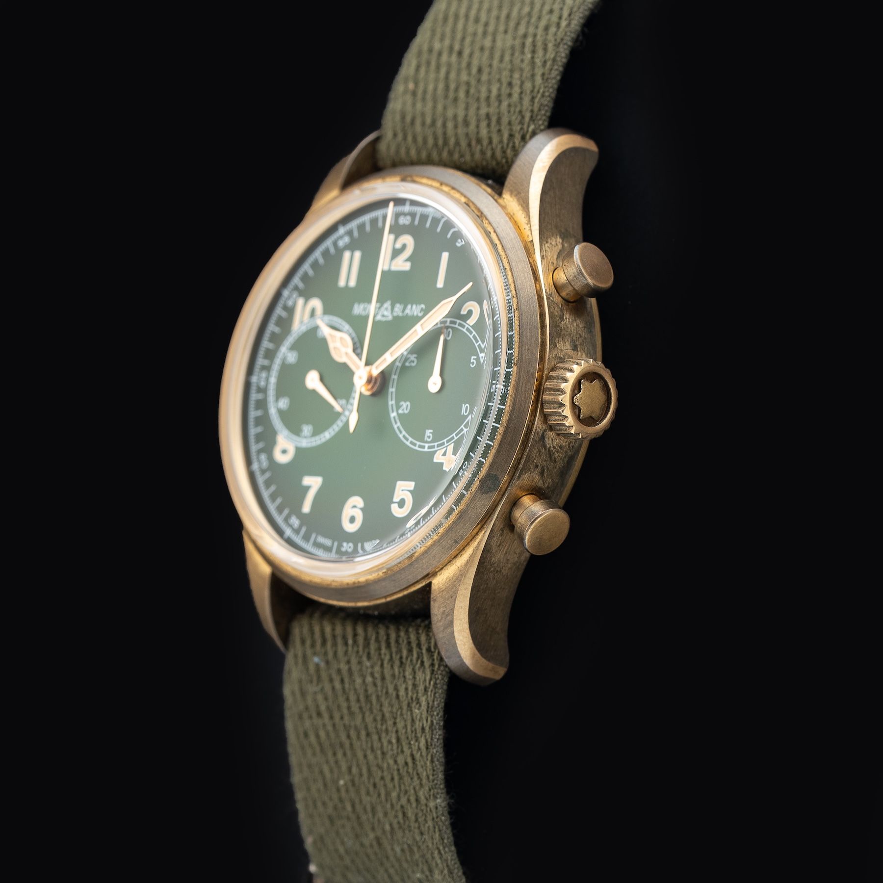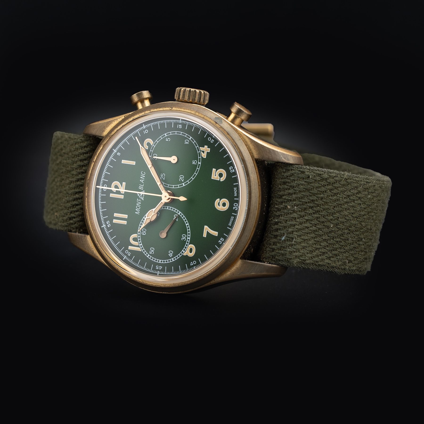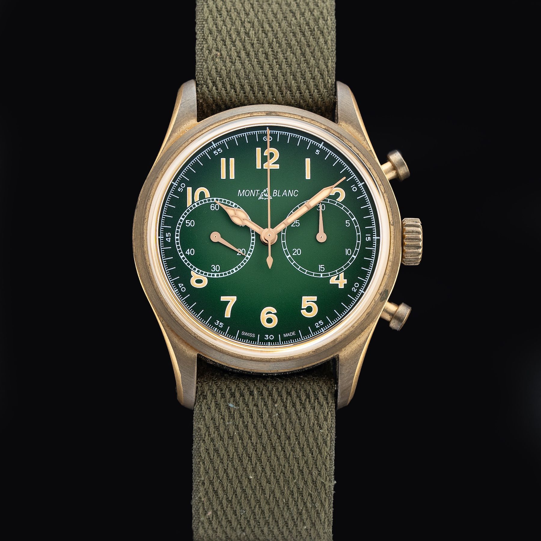 This watch features a 42mm bronze case on woven khaki-green NATO strap. This watch also sports a green dial. Powered by an automatic movement. Water resistance up to 100 meters.