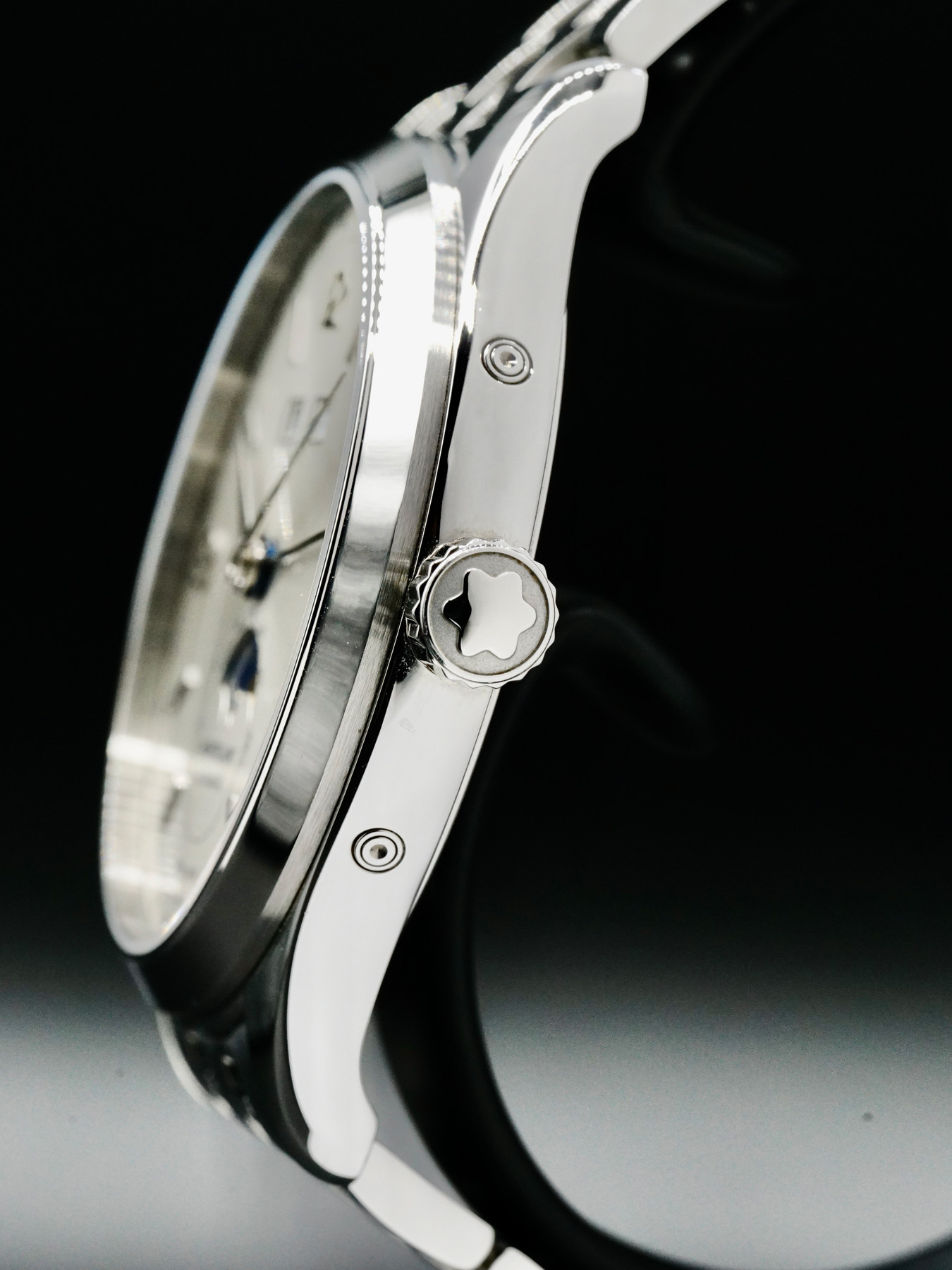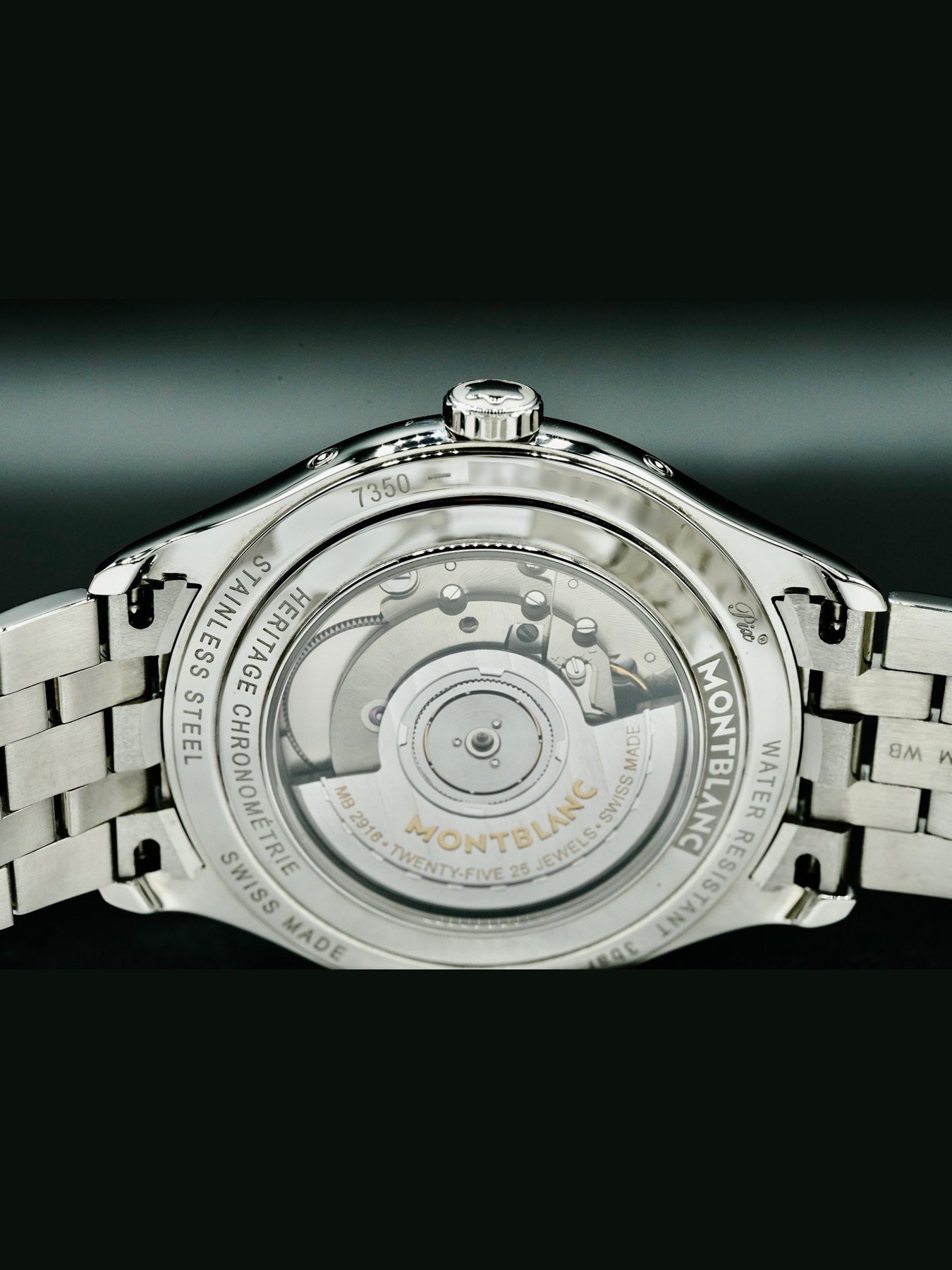 This Montblanc Heritage Chronometre 112647 features a 40mm steel case on bracelet. This watch also sports a silver dial.