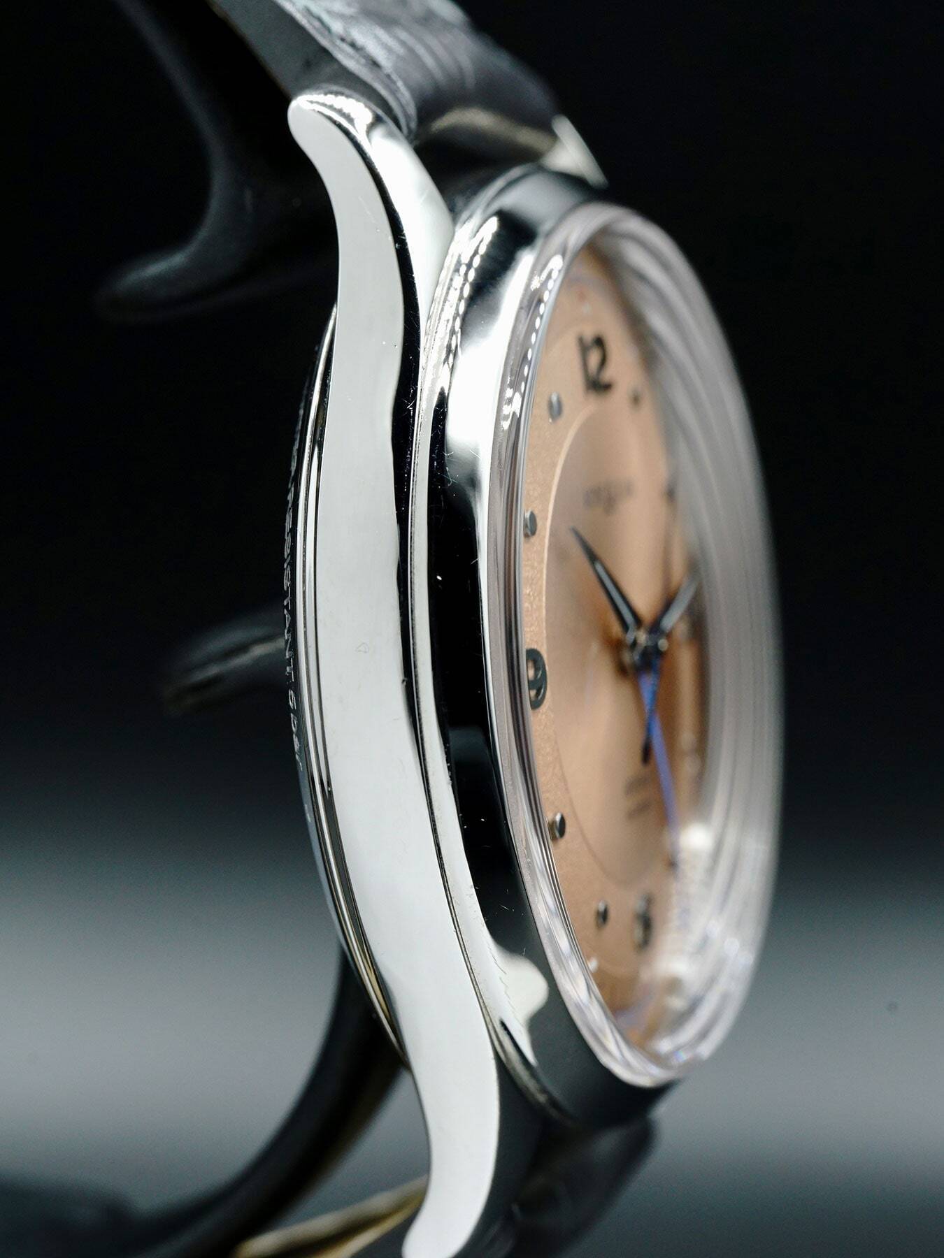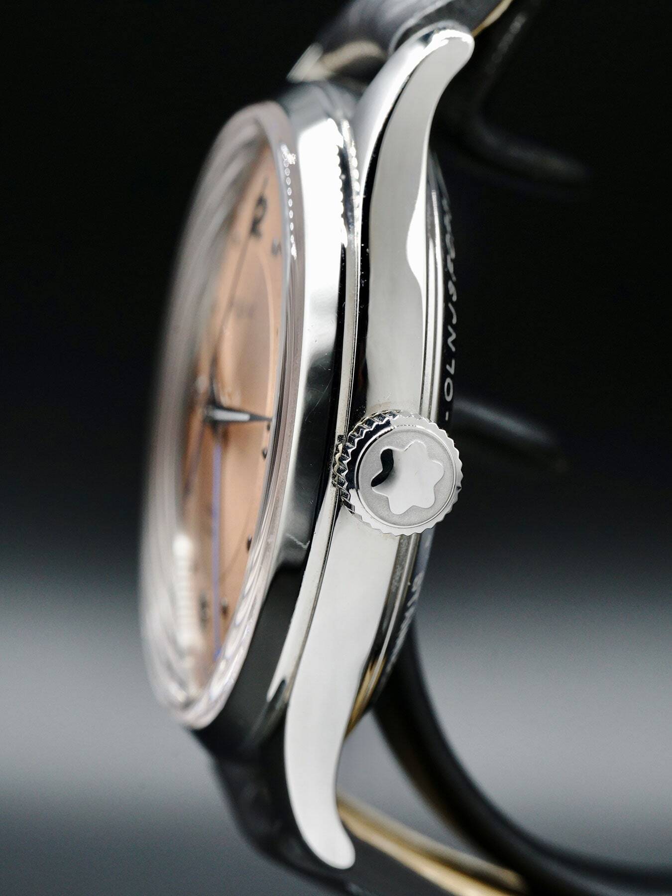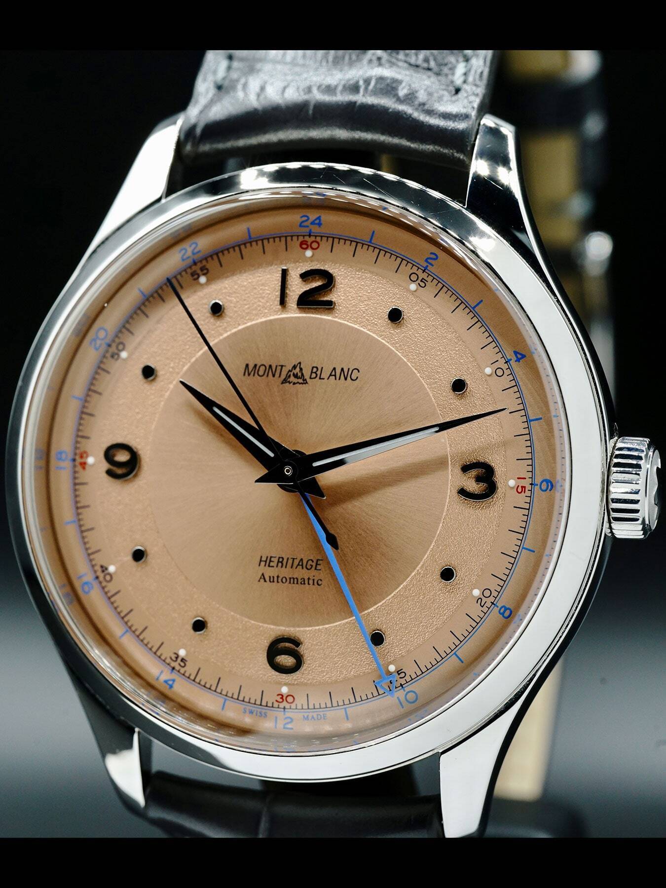 This Montblanc Heritage GMT features a 40mm fully polished stainless steel case and bezel with a sapphire crystal case back on a grey leather strap. This watch also showcases a salmon colored dial with black rhodium-coated Arabic numeral and indexes covered by domed anti-reflective, scratch resistant sapphire crystal.