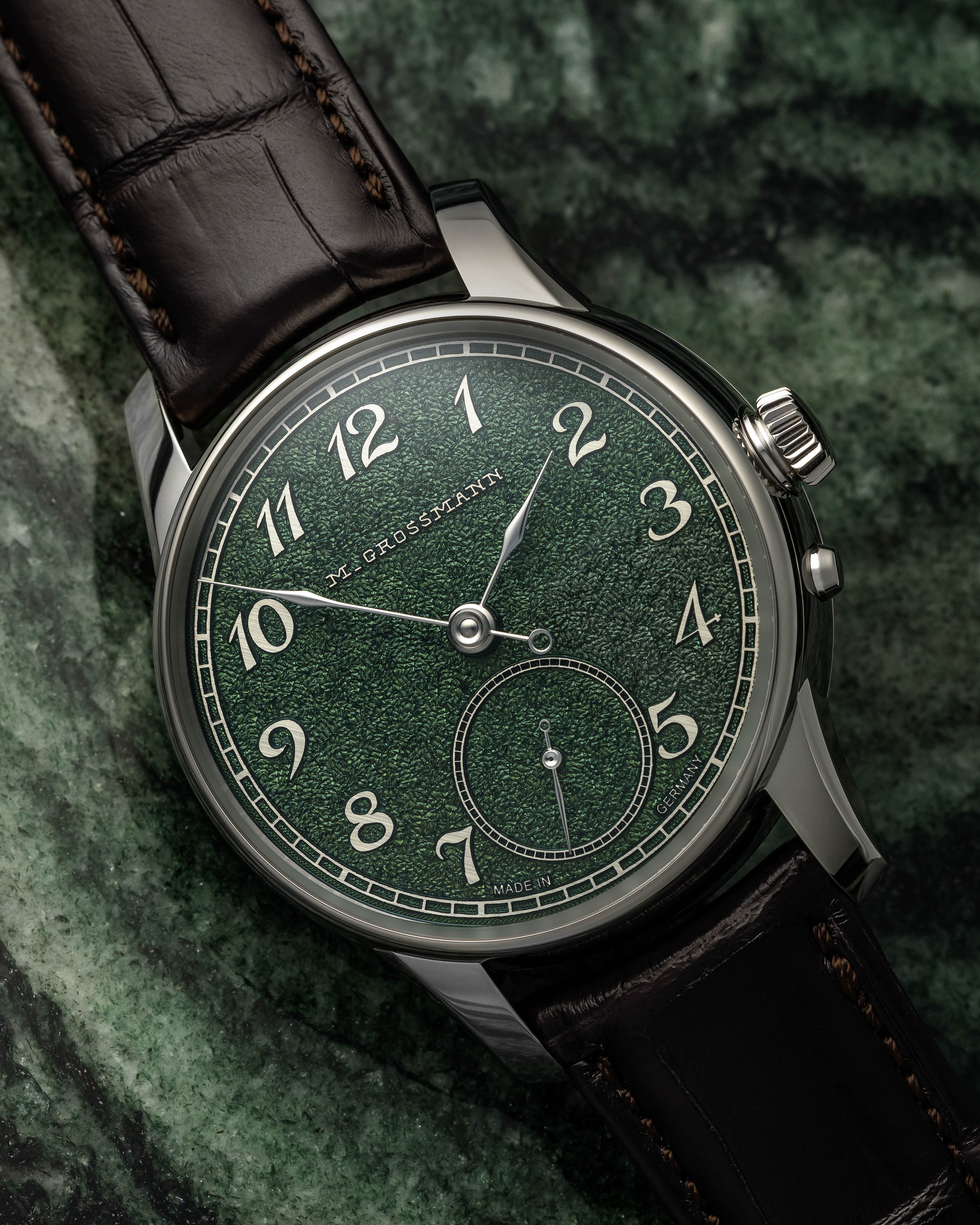 Its dial, engraved by hand in the traditional tremblage technique, showcases a meditative green hue with a matte texture that subtly shifts in the light. The sleek white gold case is contrasted by hand-polished steel hands, offering sharp clarity and sophistication.