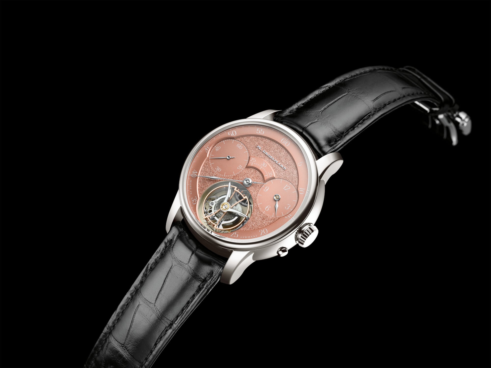 The impression is further reinforced through Moritz Grossmann’s use of colour to showcase the engraving technique, with the hand-crafted surface being finished in a vibrant rose shade. The colour has a warm and exceedingly contemporary quality to it. It also emphasises the three-dimensionality of the dial, where the hour numerals and small seconds circle arise from the surface along with the historical ‘M. Grossmann’ logo dating from 1875.