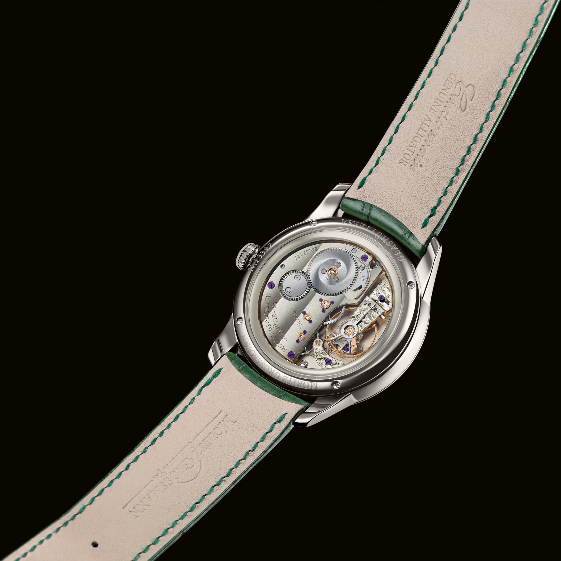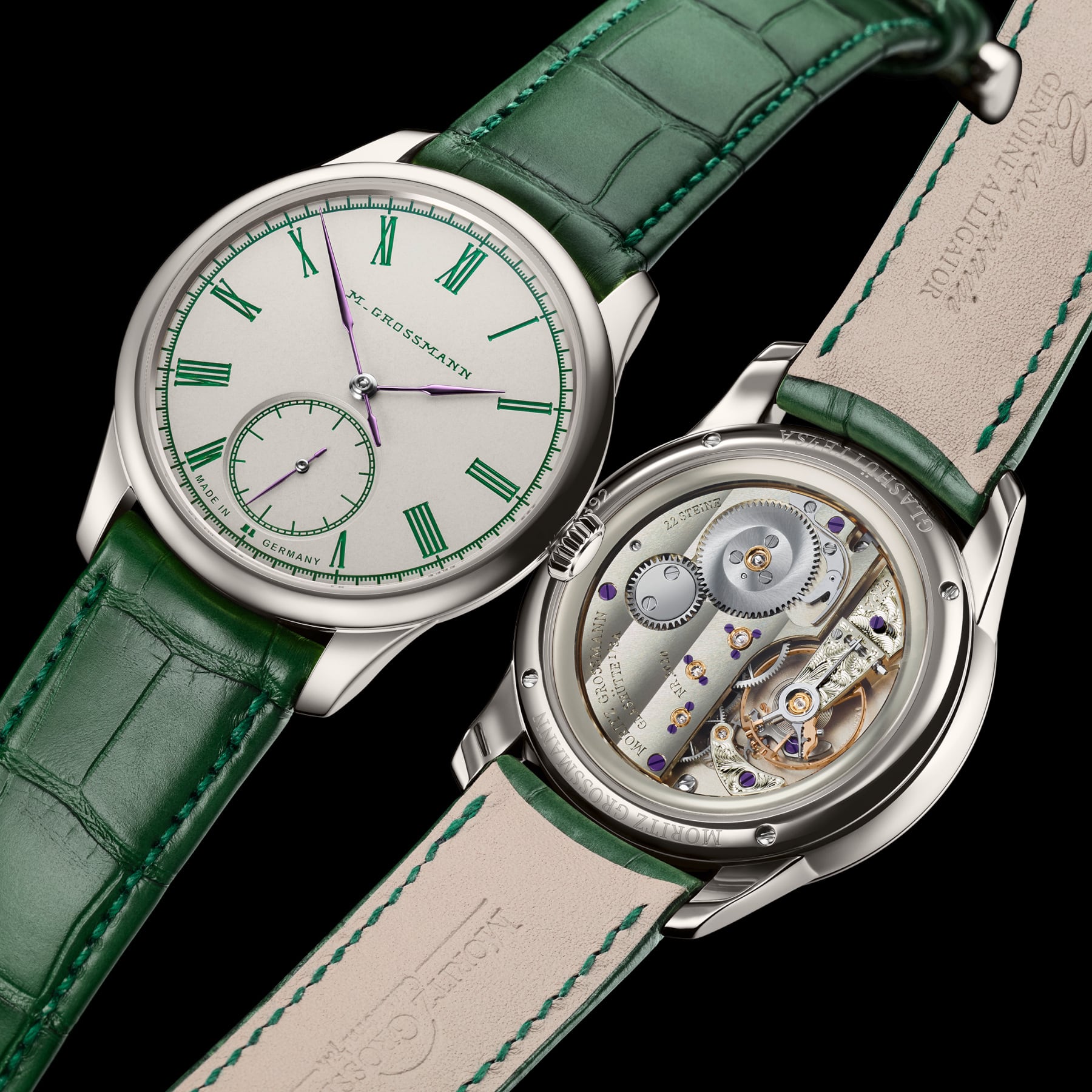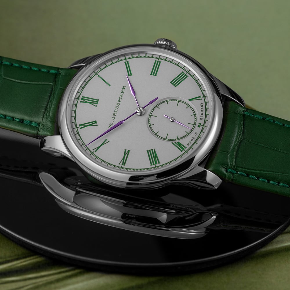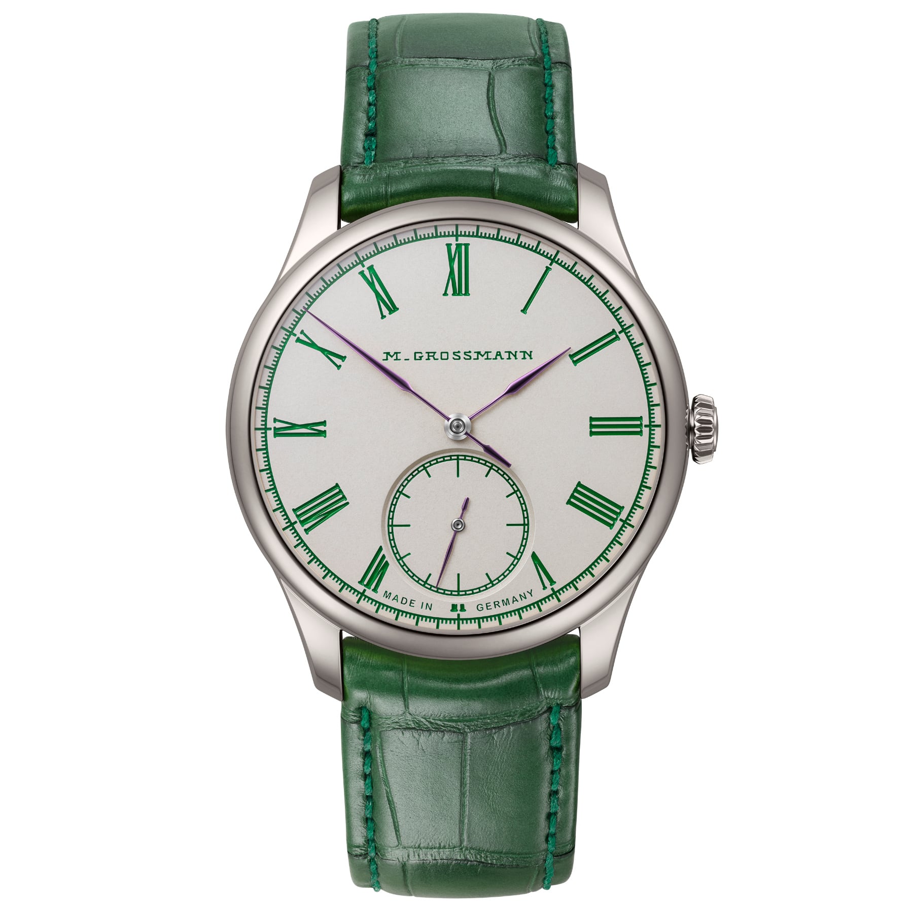Contrasting elements in a fresh colour highlight the dial: all numerals and lettering, the minute scale and historic ‘M. Grossmann’ logo dating from 1875 are set in green. Above them sweep extraordinarily fine, lance-shaped hands crafted by hand at the manufactory. These are created in a series of elaborate steps. Their gently rounded lines and delicate tip catch the eye of any beholder.