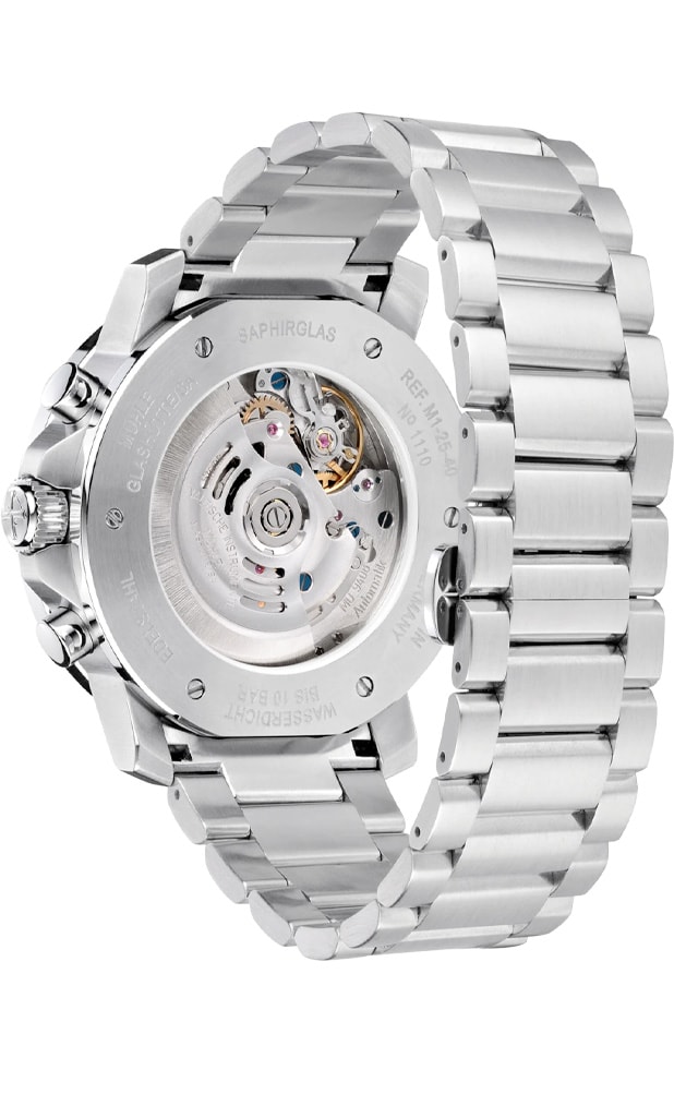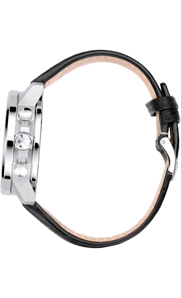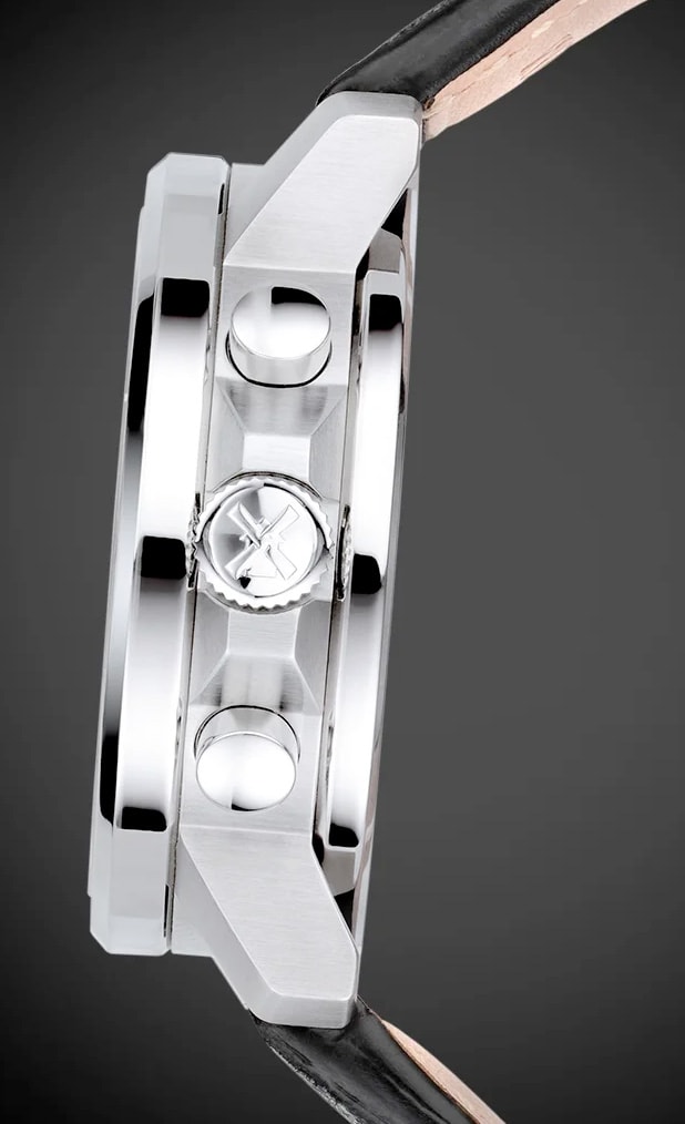 The stop hand on the chronograph is red, which not only gives it a sporty look, but above all it makes it very easy to read the stopped time in seconds. The side protection of the screw-in crown also performs a double function. It adds to the dynamic appearance of the watch and effectively protects the crown from side knocks.