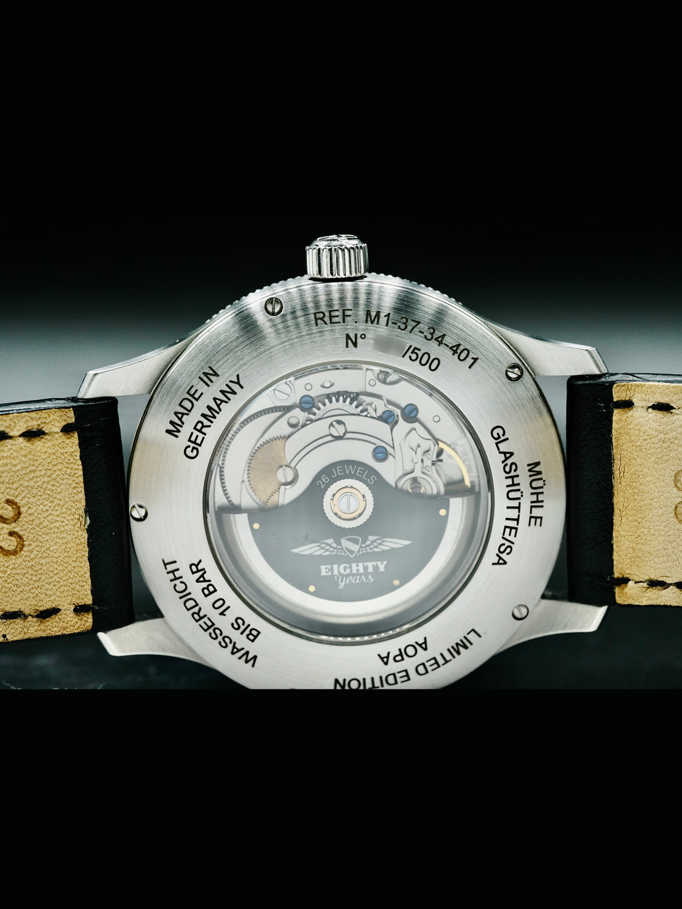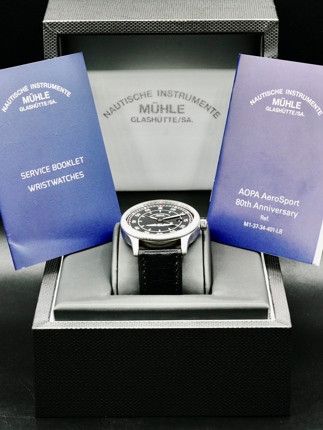 This Mühle Glashütte M1-37-34-401-LB Aerosport Limited Edition is in LIKE NEW condition. It has box and papers. Limited Edition of 500 Pieces. Guarantee certificate dated for January 2022.