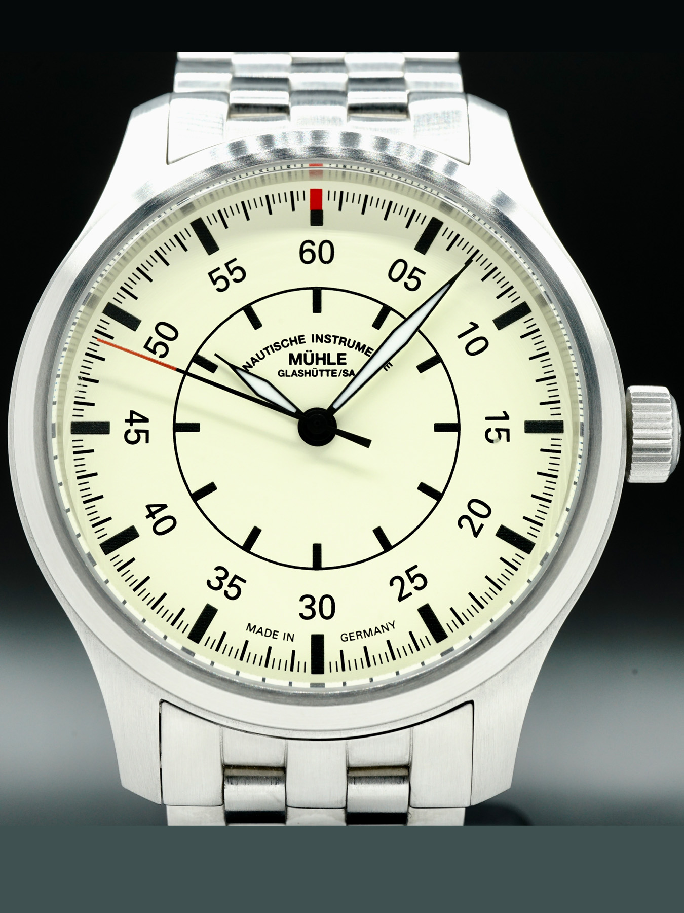 This Mühle Glashütte Terrasport I Beobachter Cream features a 44mm stainless steel case with an exhibition case back on a stainless steel bracelet. This watch also sports a cream dial with luminous hands and index dial markers covered by sapphire crystal.