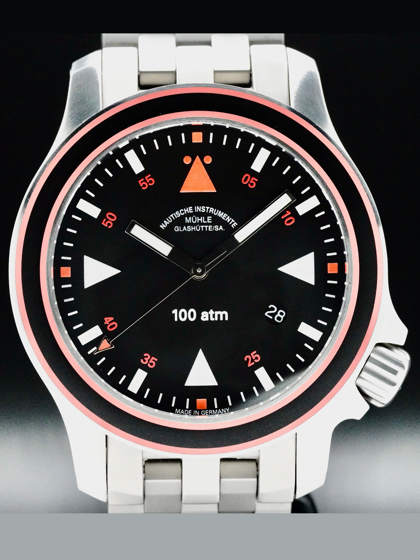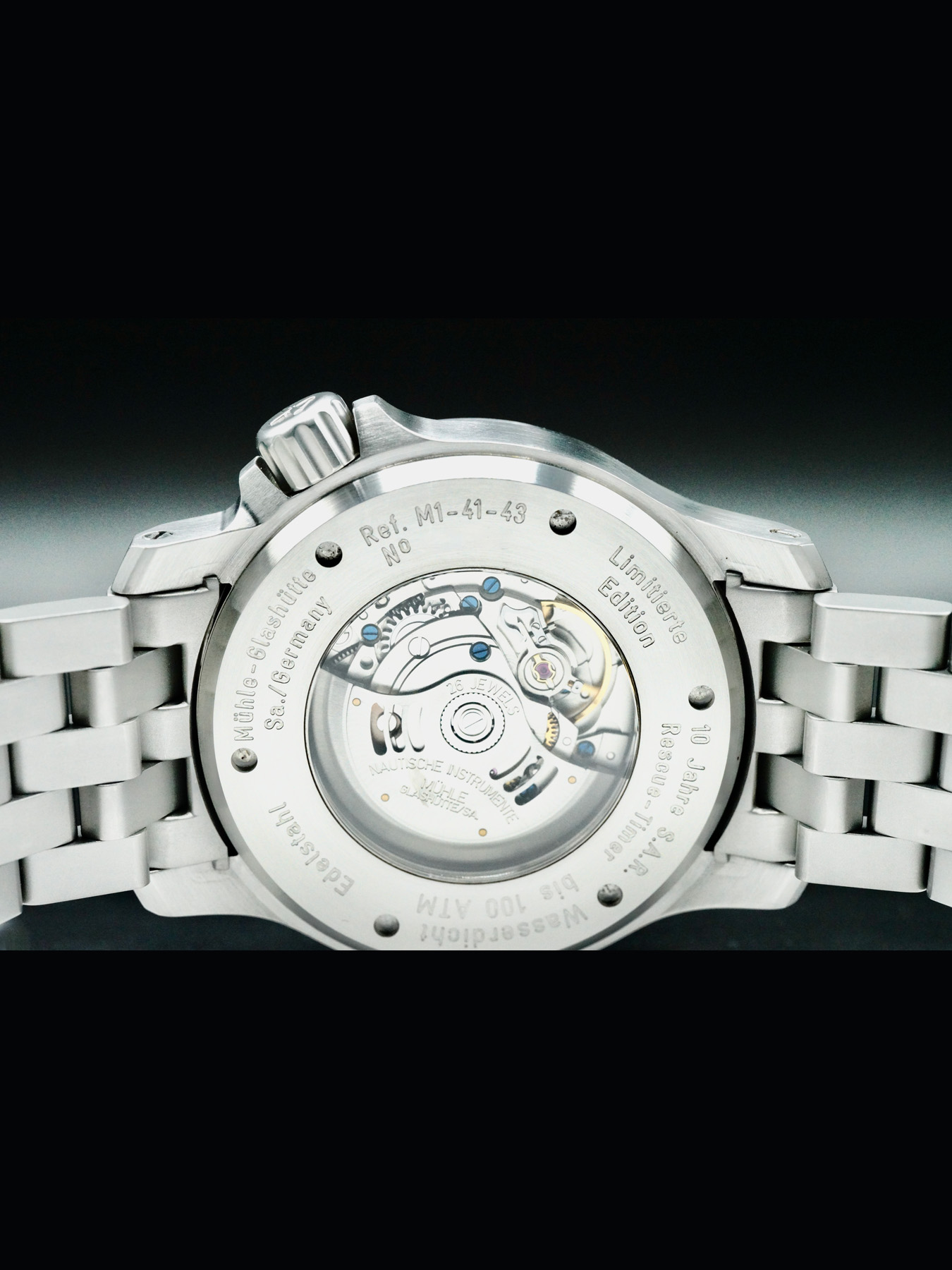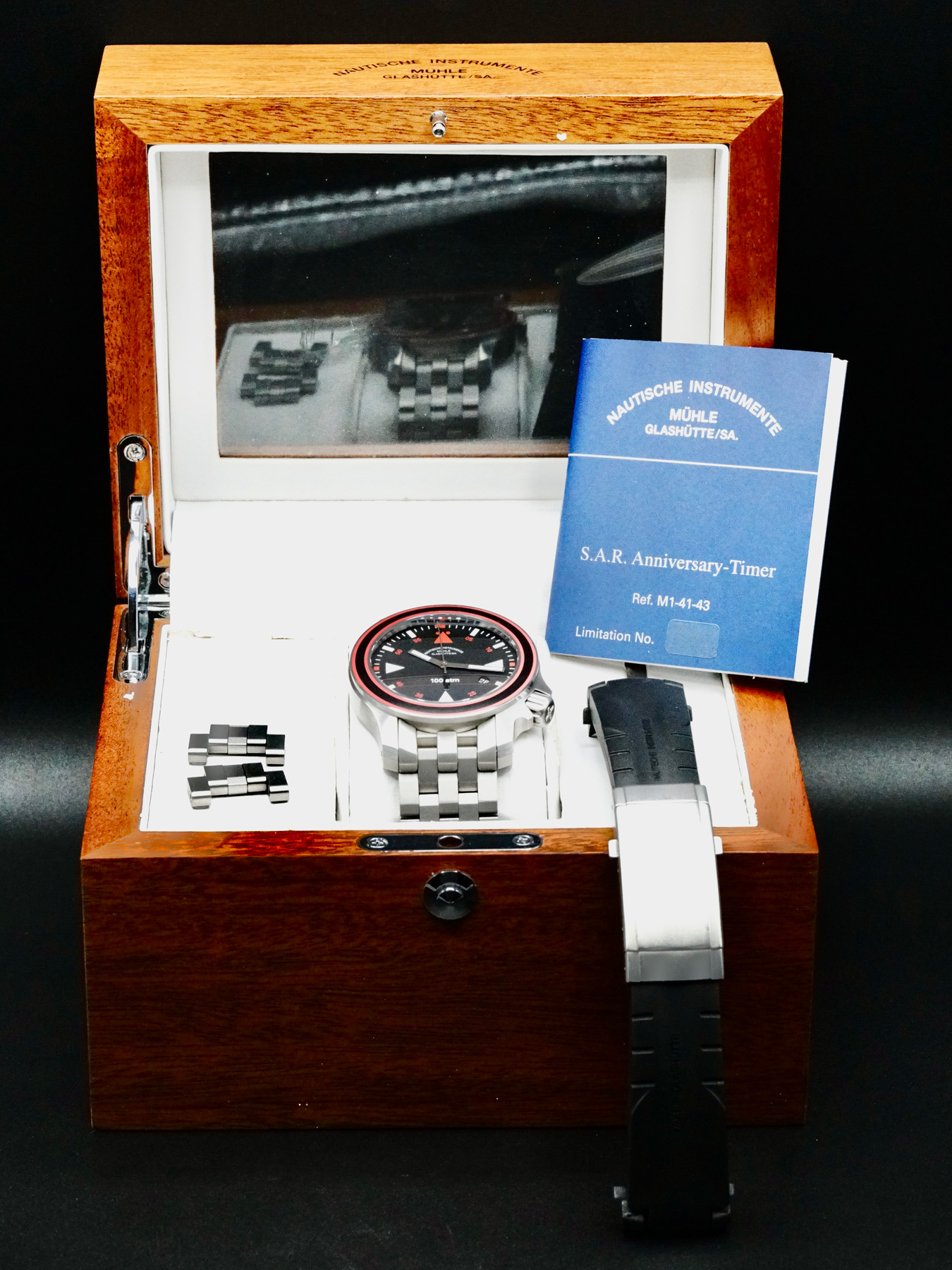 This Mühle Glashütte M1-41-43-KB S.A.R Anniversary Timer is in GREAT condition. This watch includes original box, instructions, warranty card dated 2014. Extra black rubber strap and stainless steel bracelet links.This watch has been fully authenticated and certified by Exquisite Timepieces.