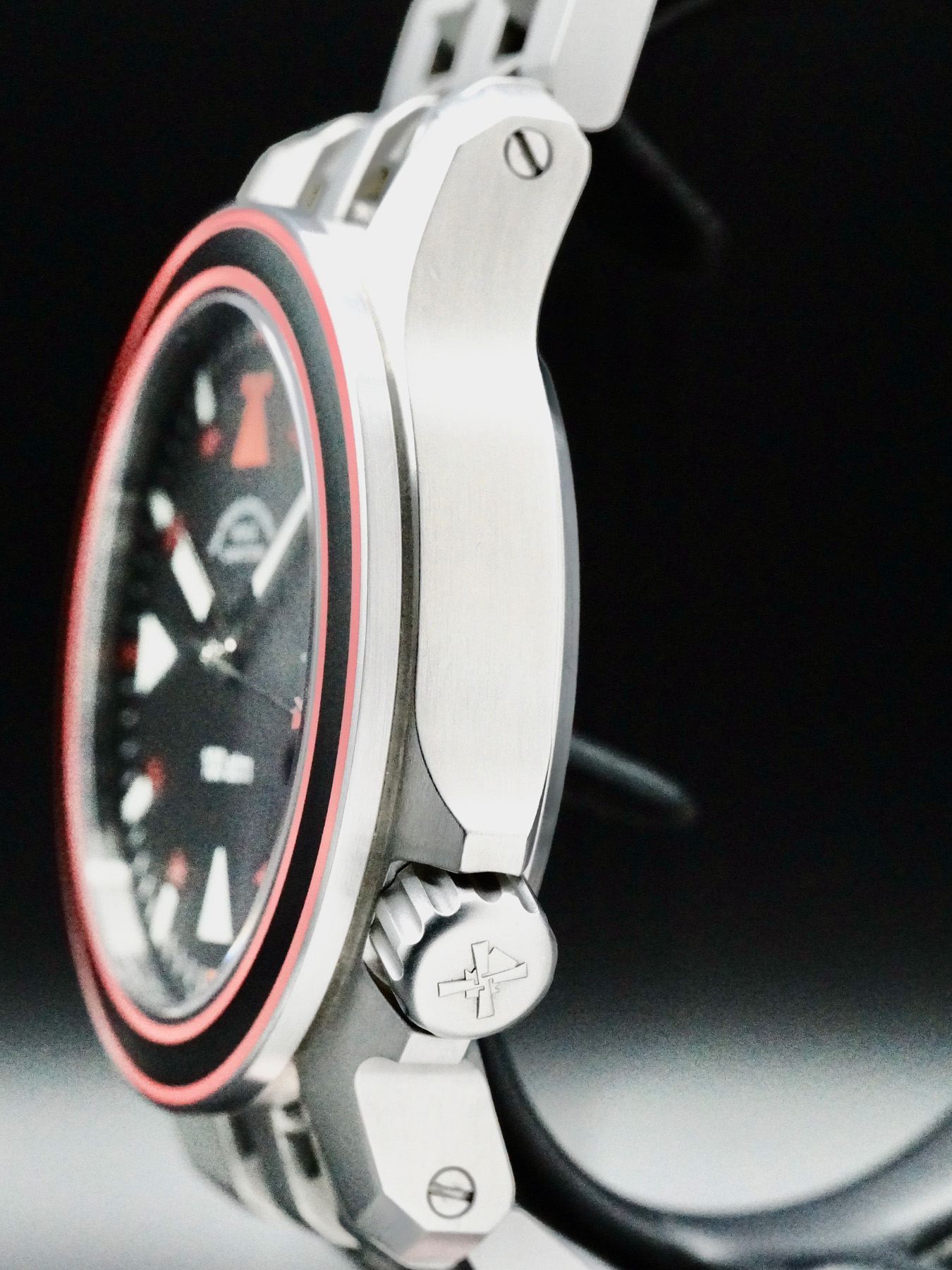 This watch features a 44 mm steel case on rubber strap. This watch also sports a black dial. Powered by an automatic movement. Water resistance up to 100 meters.