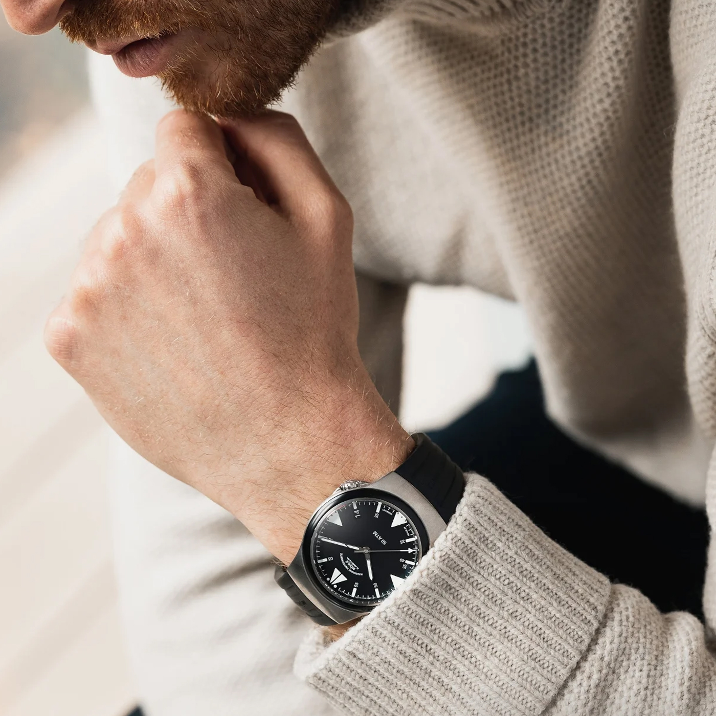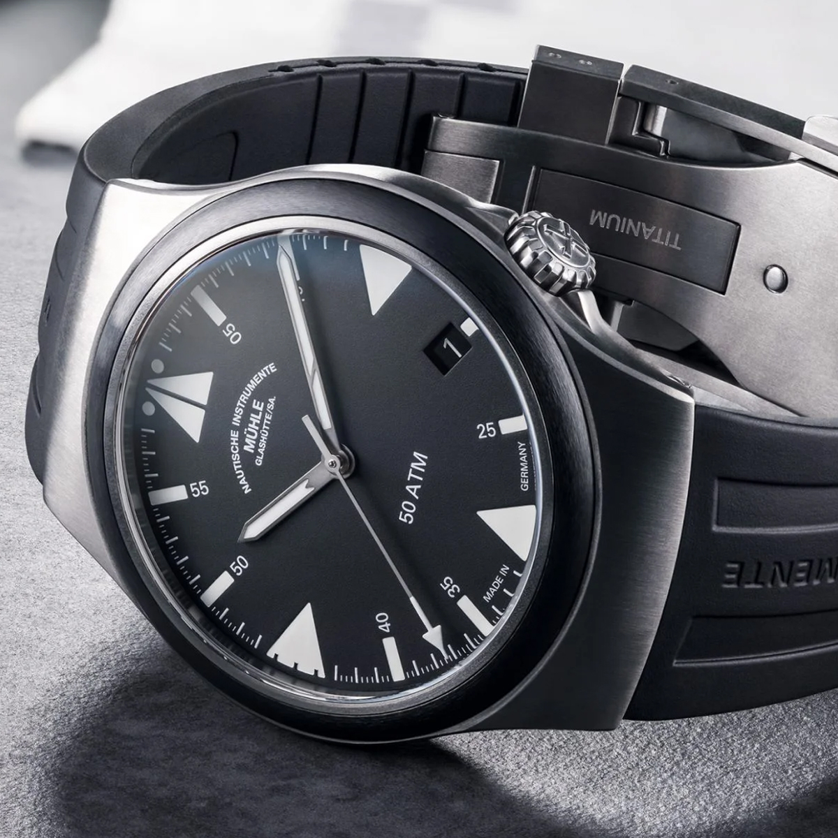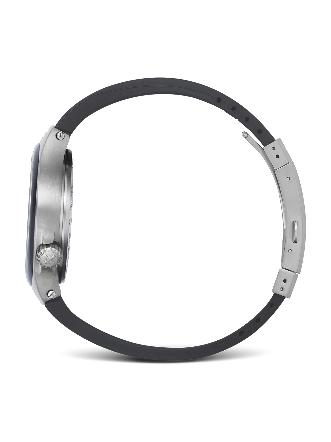 - This timepiece features a 43mm titanium case paired with a high quality rubber strap. It showcases a distinctive black dial and is powered by a precise automatic winding movement. The watch is designed with a water resistance of up to 500m.