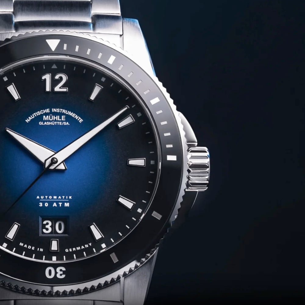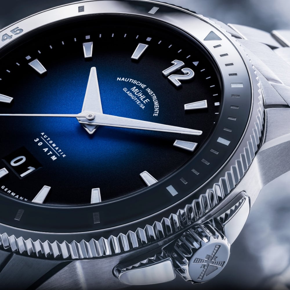 The “12,” the Mühle logo, and the prominent big date at 6 o’clock are positioned in perfect harmony on the dial. This balanced layout gives the watch a sense of calm and clarity – sporty in presence, precise in expression.