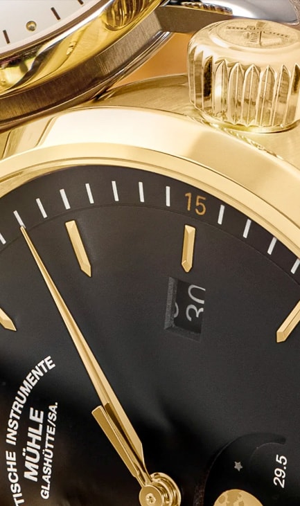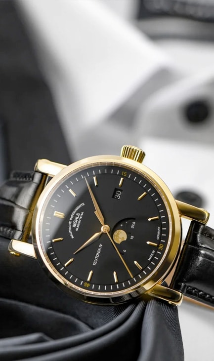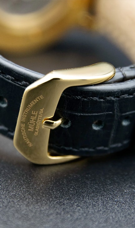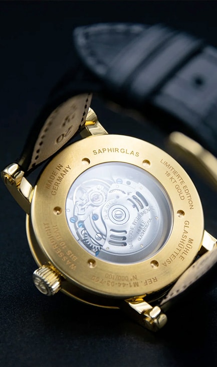 The case material of the Teutonia IV Moonphase GOLD represents the ultimate combination of rarity and value. It is made of 750 yellow gold and thus provides the appropriate setting for a Mühle watch of which only 100 exclusive pieces are manufactured.
