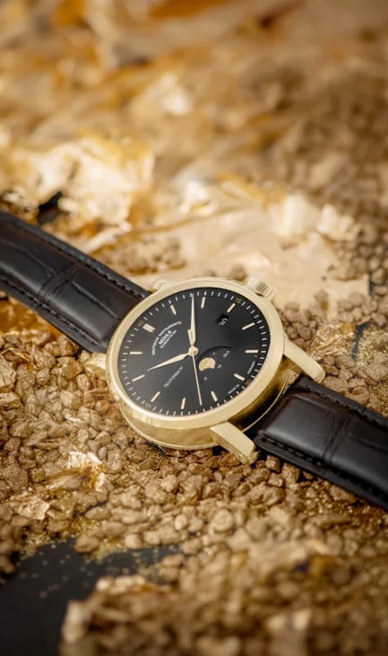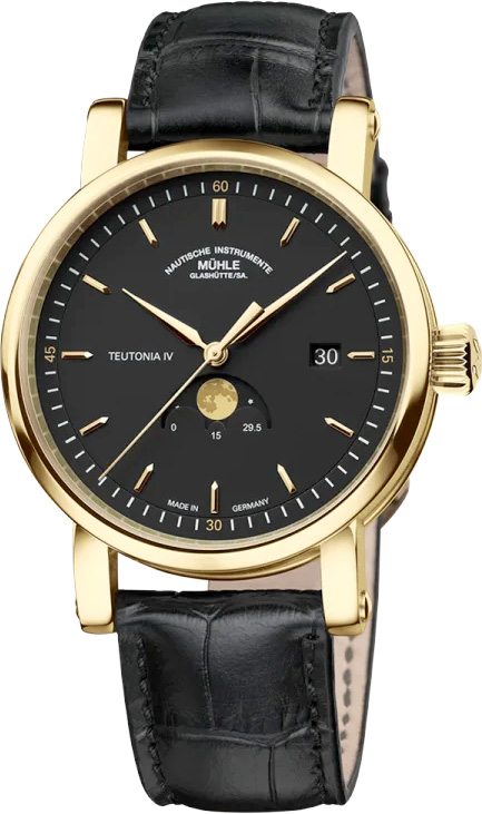 The elegant shine of the valuable case is complemented by its contrast with the matt black face of the Teutonia IV Moonphase GOLD. Against the face as black as the night sky, applied and gold-plated indices sparkle like shooting stars, reflecting the case material just like the gold-plated, lance-shaped hands for the hours, minutes and seconds.