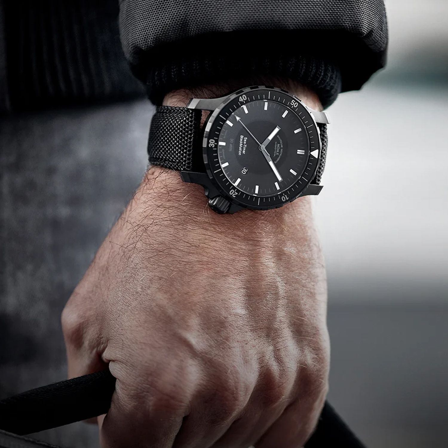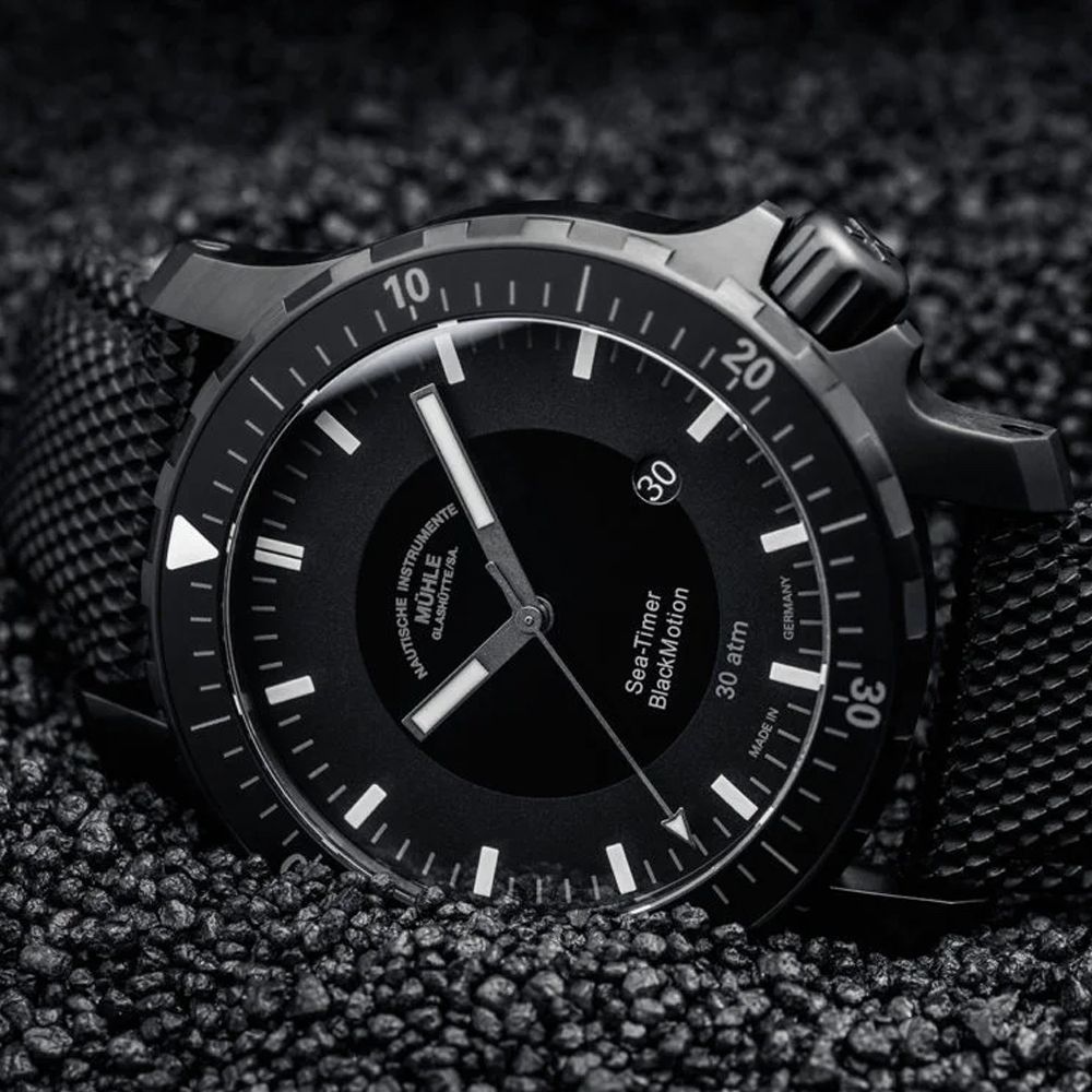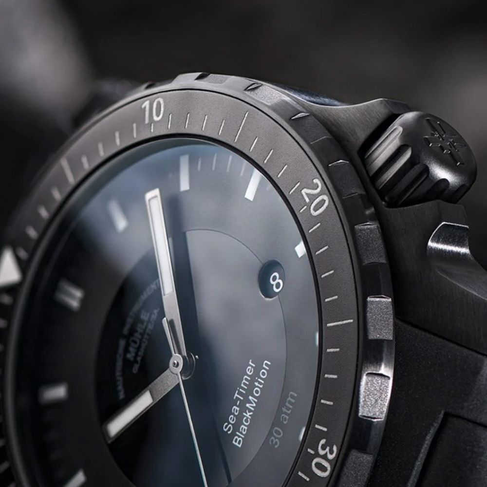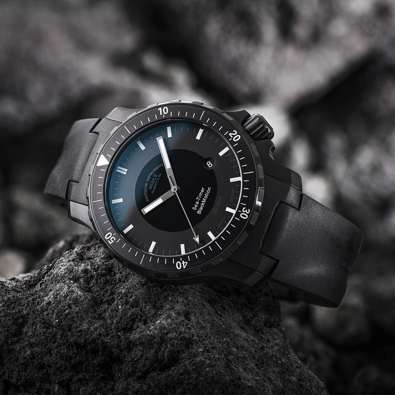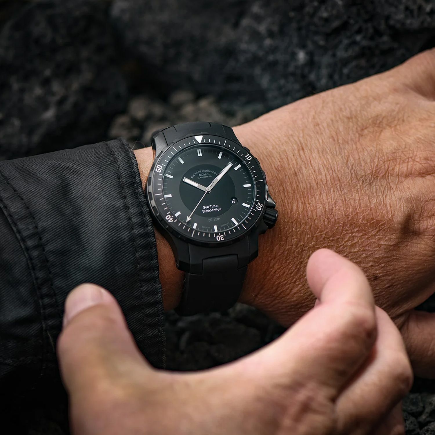 Do we only buy sun lotion in extra-large bottles, barely even notice if we get salt water in our eyes and simply grab a jetboard when the wind isn’t on our side? If so, there’s no doubt about it: We’re a perfect match for the Sea-Timer BlackMotion! This new Mühle sports watch is an absolute must for anyone who is always on the move and simply cannot wait to try out new fun sports activities. Its black stainless steel case reveals at a glance that the Sea-Timer BlackMotion is the ideal companion for all sports adventures. The high-quality case not only features a 2.5-millimetre-thick double anti-glare sapphire crystal but also boasts a solid screw-in crown with extra side protection. These highlights are joined by an elaborate TiC coating (titanium carbide), which transforms the watch from a sophisticated timepiece into a cool-looking companion for your wrist.