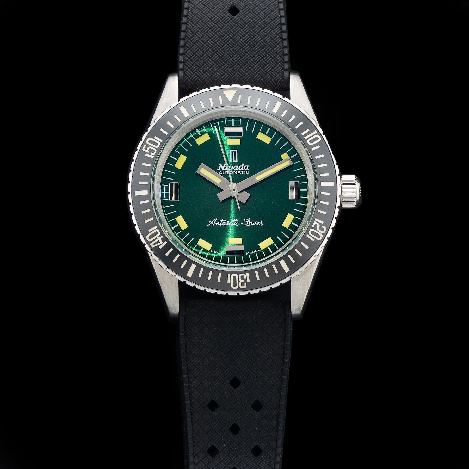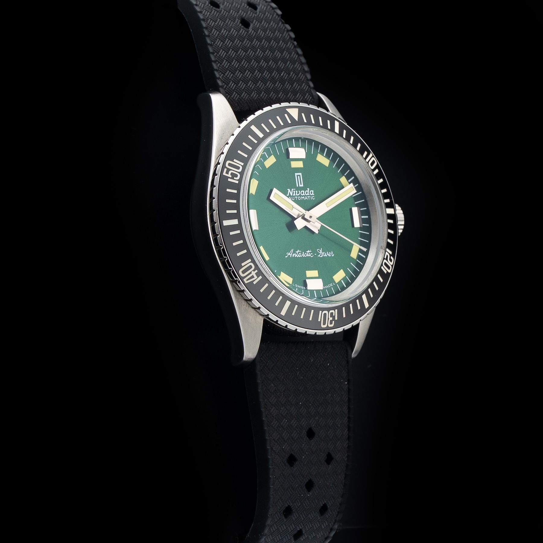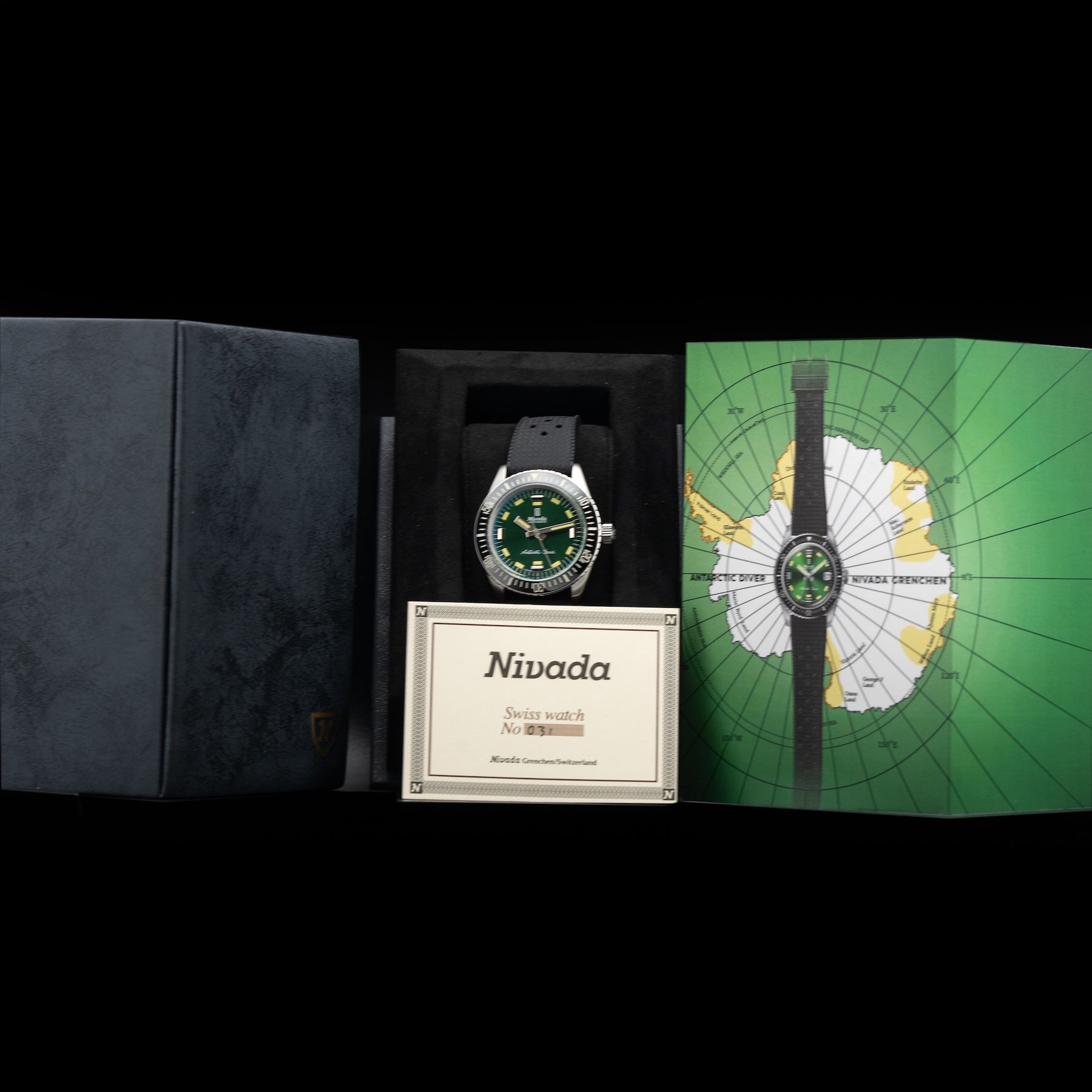 This Nivada Grenchen 32059A01 Antarctic Diver Green No Date is in GREAT condition. This watch includes its Original Box, Original Papers and Warranty Card Dated 2/21/25. This watch has been fully authenticated and certified by Exquisite Timepieces.