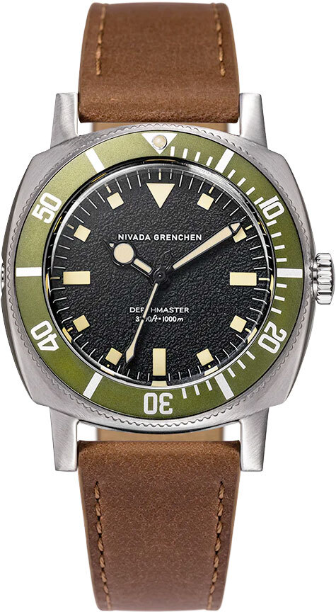 - This timepiece features a 39mm steel case paired with a high quality leather strap. It showcases a distinctive black and green dial and is powered by a precise automatic winding movement. The watch is designed with a water resistance of up to 1000m.