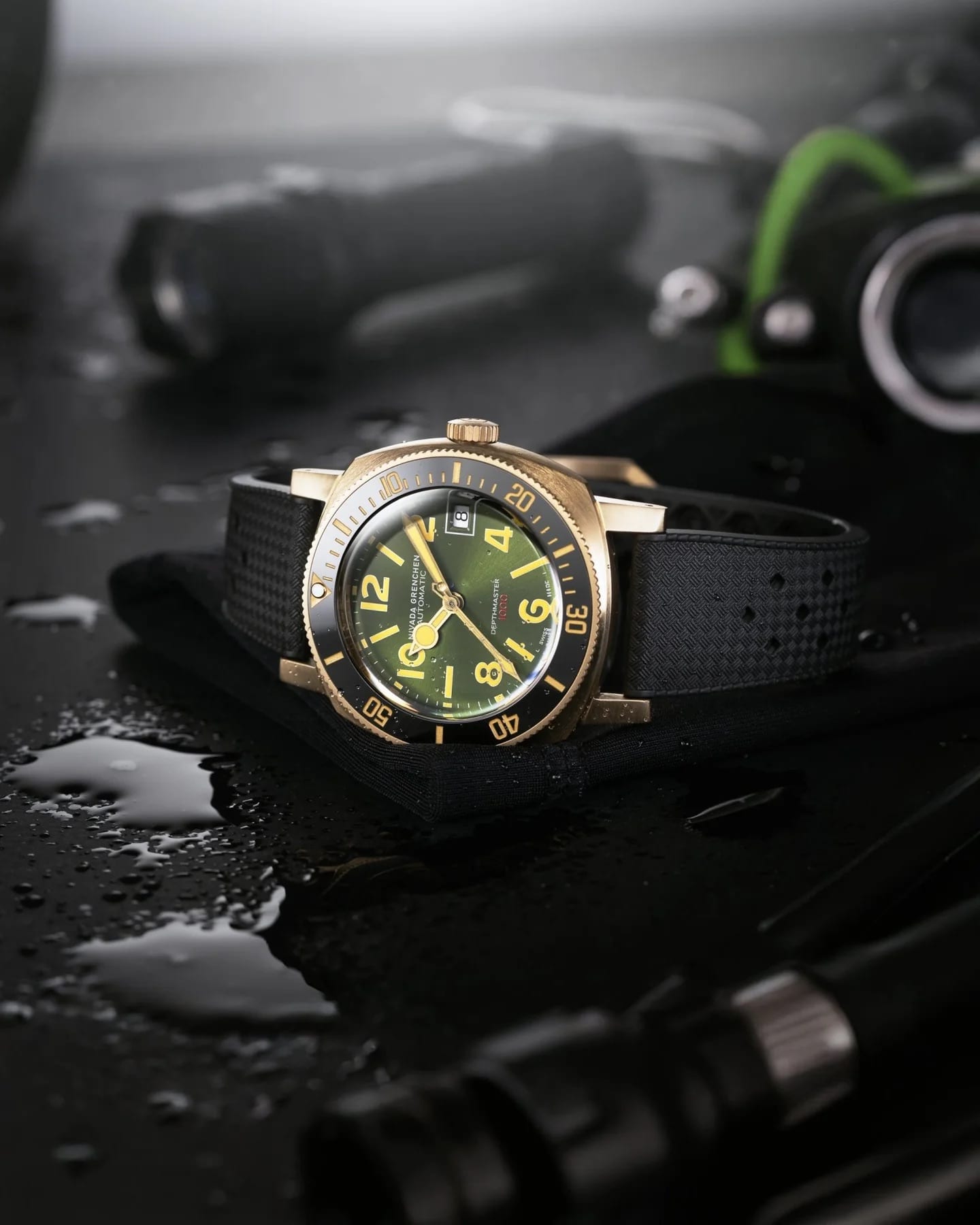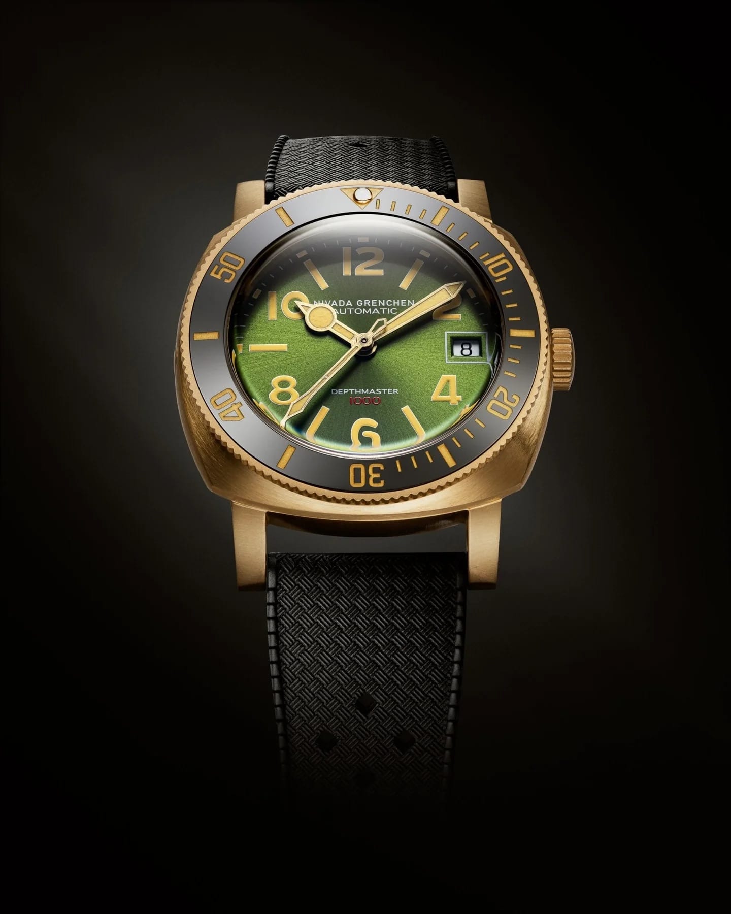For its latest release, Nivada Grenchen has developed a bronze version of the Depthmaster, still waterproof to 1,000 meters but with a ceramic bezel, not only content with the deep sea but also enjoying urban diving. Versatile, it transitions from sea to land and adorns the wrist elegantly. Playing with a wide choice of straps, it transforms itself; during the day in sport mode ready to dive with a Rubber Tropic strap and in the evening in a dressed-up mode with a leather strap. There are no less than 7 interchangeable straps offered to match your desires.