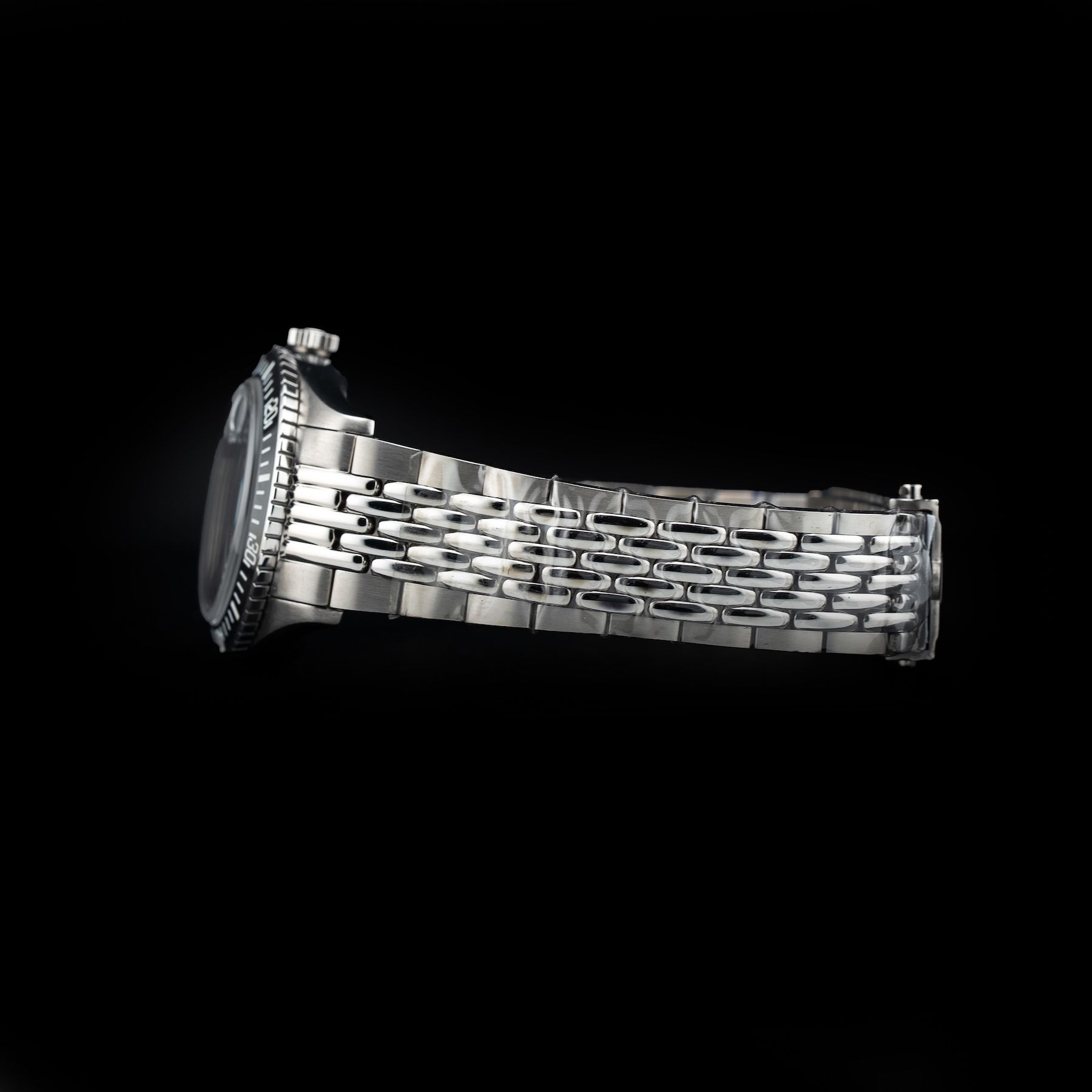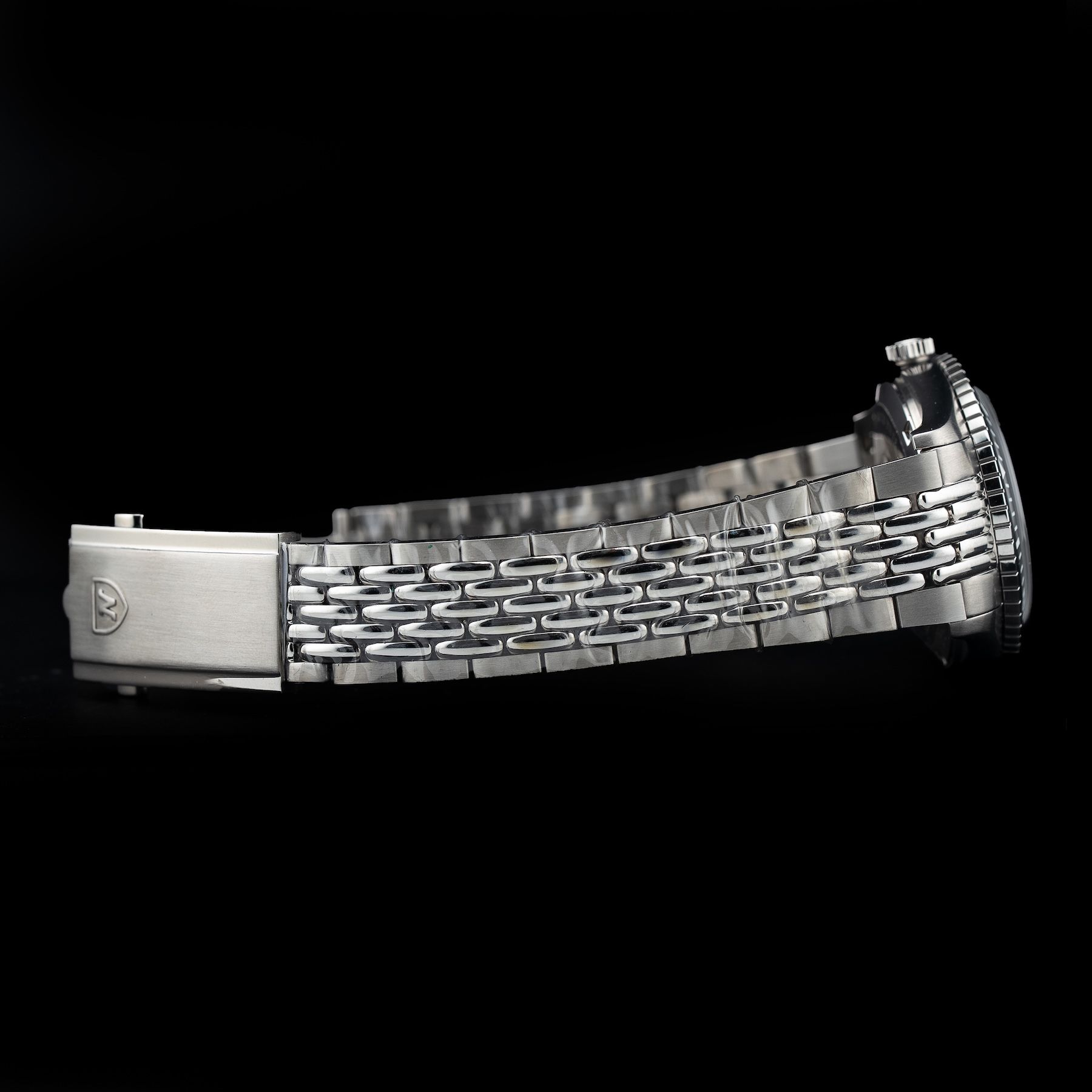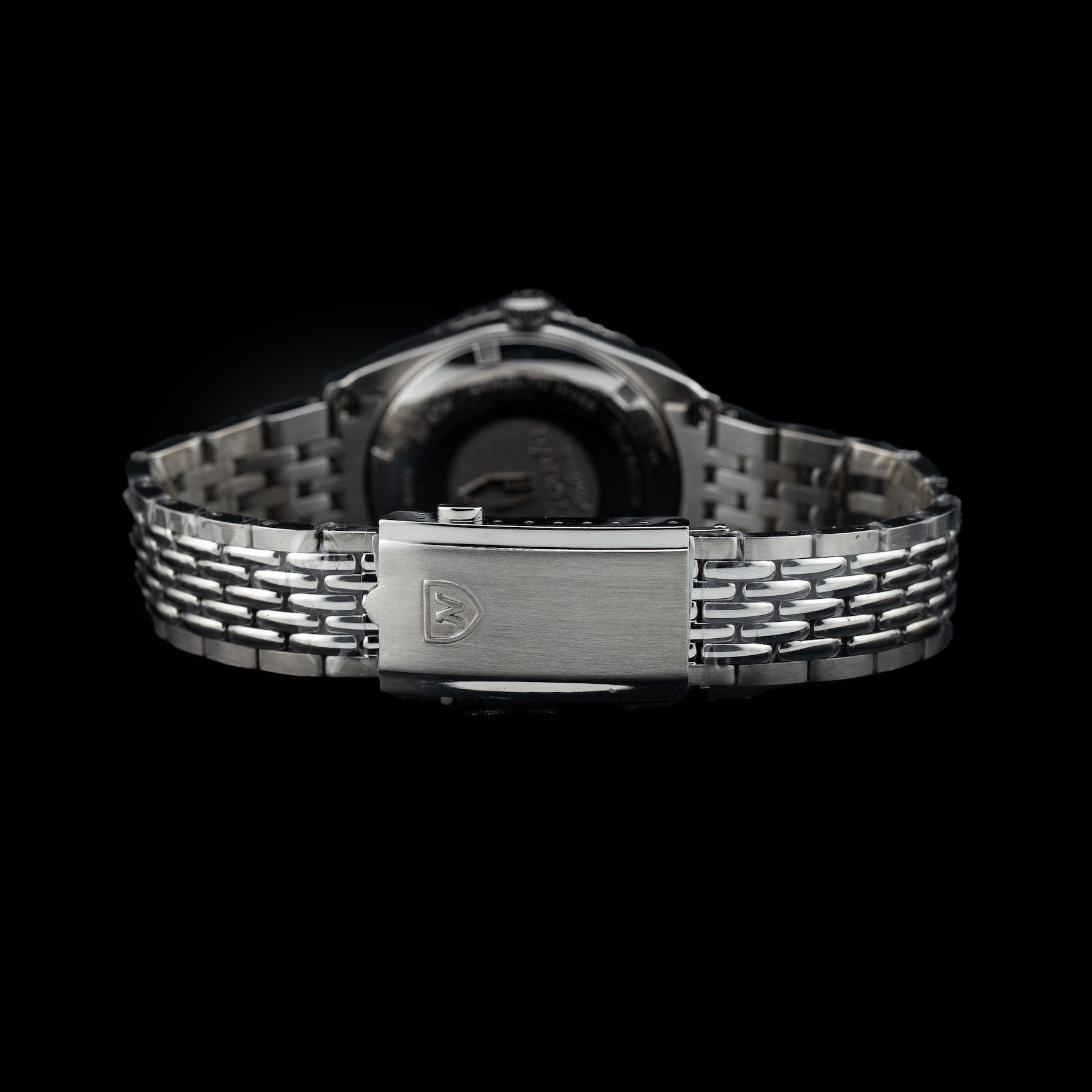 This watch features a 38mm stainless steel case on beads of rice bracelet. This watch also sports a black dial. Powered by a mechanical automatic movement. Water resistance up to 200 meters.