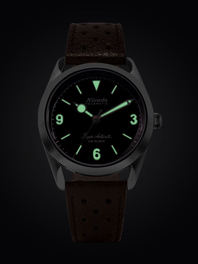 A faithful, modern take on Nivada’s 1950s Antarctic 3-6-9, featuring a black dial with beige Super-LumiNova and the iconic Arabic numerals layout.