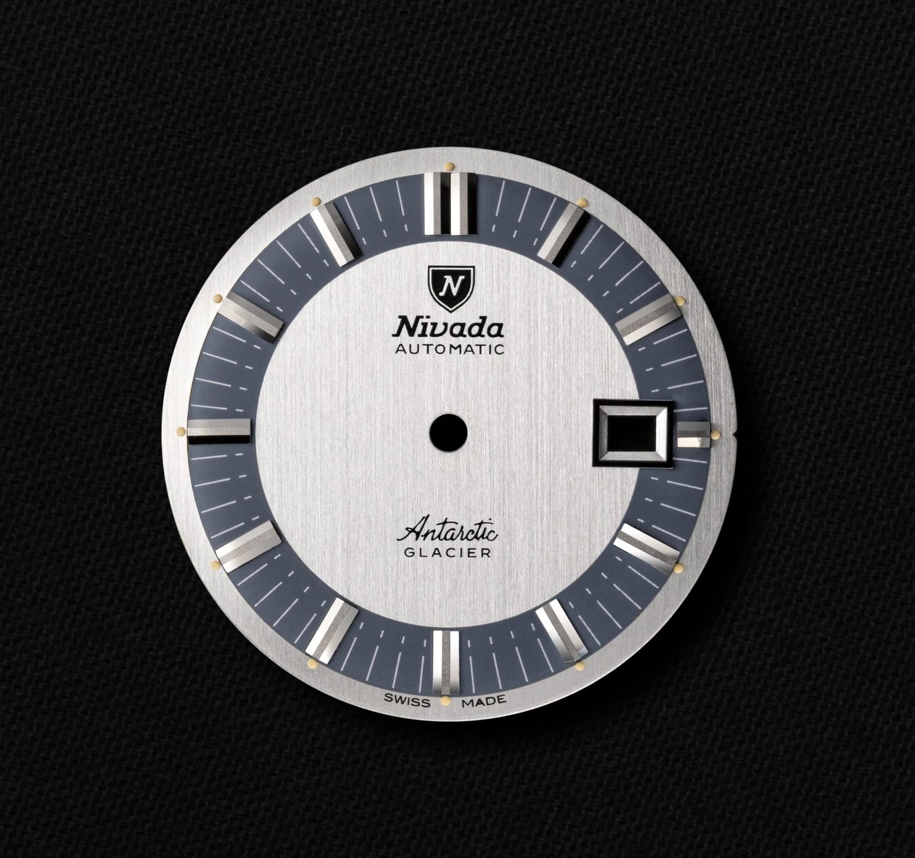 The Antarctic Glacier 38mm captures the luminous elegance of ice and the enduring legacy of Nivada Grenchen’s Antarctic series. Its vertically brushed silver dial, accentuated by an anthracite ring and applied indexes, evokes depth and movement.