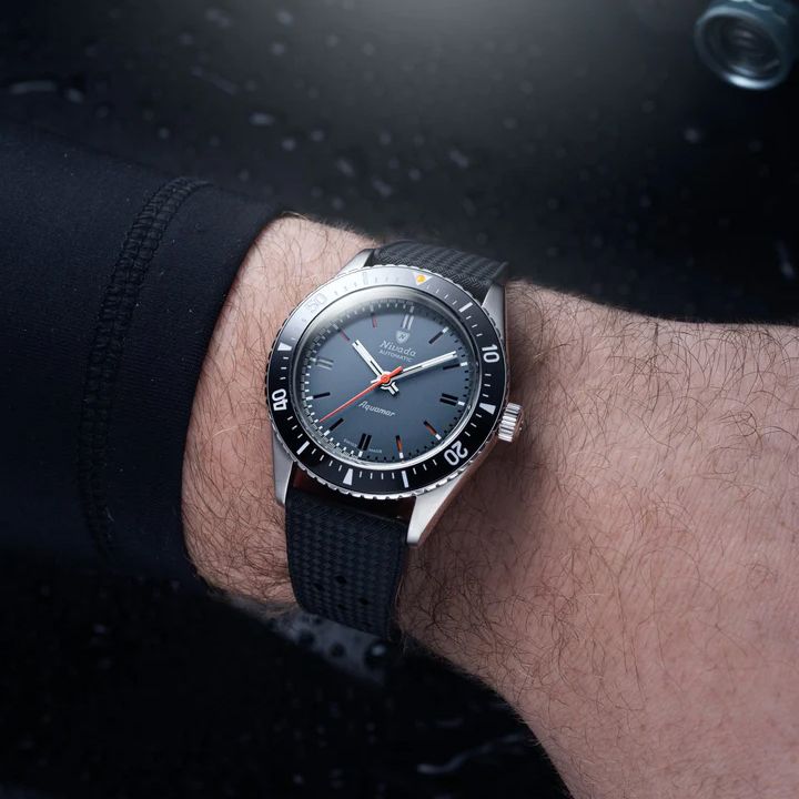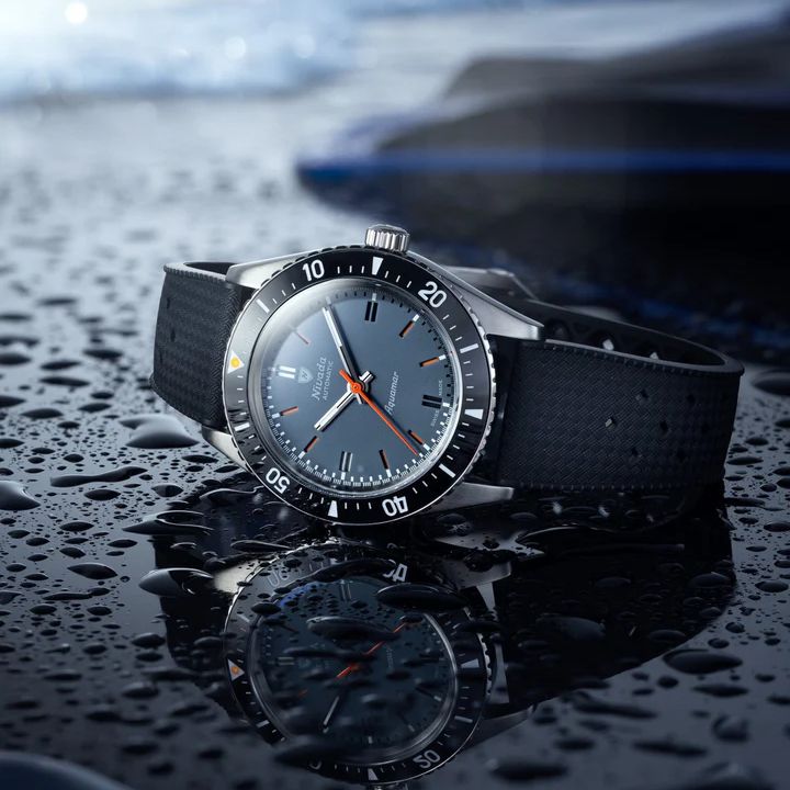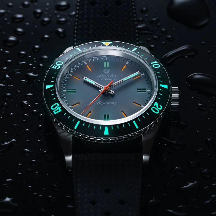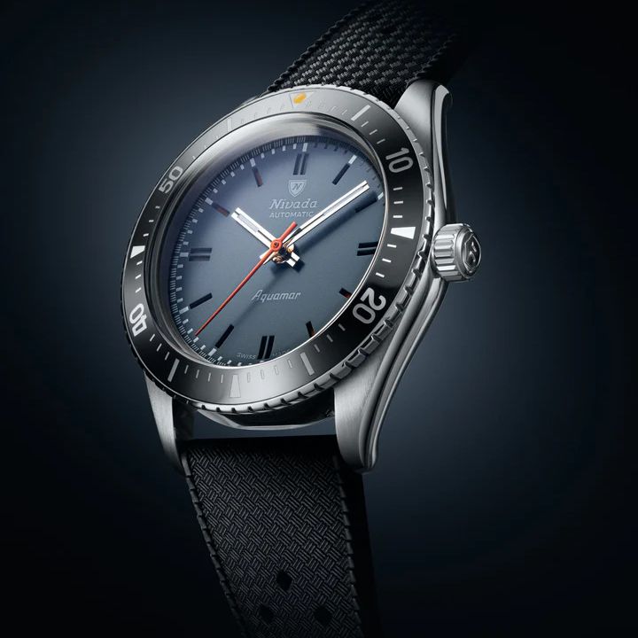 The Aquamar collection is Nivada Grenchen’s modern revival of a lesser-known but charismatic dive watch from the late 1960s. Rooted in the Antarctic family, each Aquamar model blends vintage charm with professional-grade technical features, making it a highly versatile and collectible timepiece. Faithful to its original proportions, the Aquamar features a 38 mm stainless steel case, double-domed sapphire crystal, and a 200-meter water resistance rating, making it perfectly suited for both diving adventures and everyday wear. Its bi-directional ceramic bezel and sandwich-style dial offer depth, legibility, and distinctive character. A signature feature of the collection is the bi-color roulette-style date disc, which brings a whimsical, collector-friendly touch to the otherwise tool-oriented design. But what truly sets the Aquamar apart is its innovative changing lume system: the date disc itself is infused with two different Super-LumiNova tones—white and vintage beige. As the date changes, so does the glow, giving the watch a subtly shifting appearance between a crisp modern look and a warm, aged aesthetic. This clever feature transforms the Aquamar into a dynamic visual experience that evolves daily on the wrist. The dials—available in Matte Blue, Black, and Grey—are paired with white and faux patina options Super-LumiNova indices, further echoing the charm of aged tritium found on vintage divers. Powering the watch is the SOPROD P024 automatic movement, offering reliable Swiss precision and a 38-hour power reserve. Completing the package is an engraved caseback featuring the emblematic Antarctic penguin—a symbol of the collection’s enduring spirit and roots in exploration.