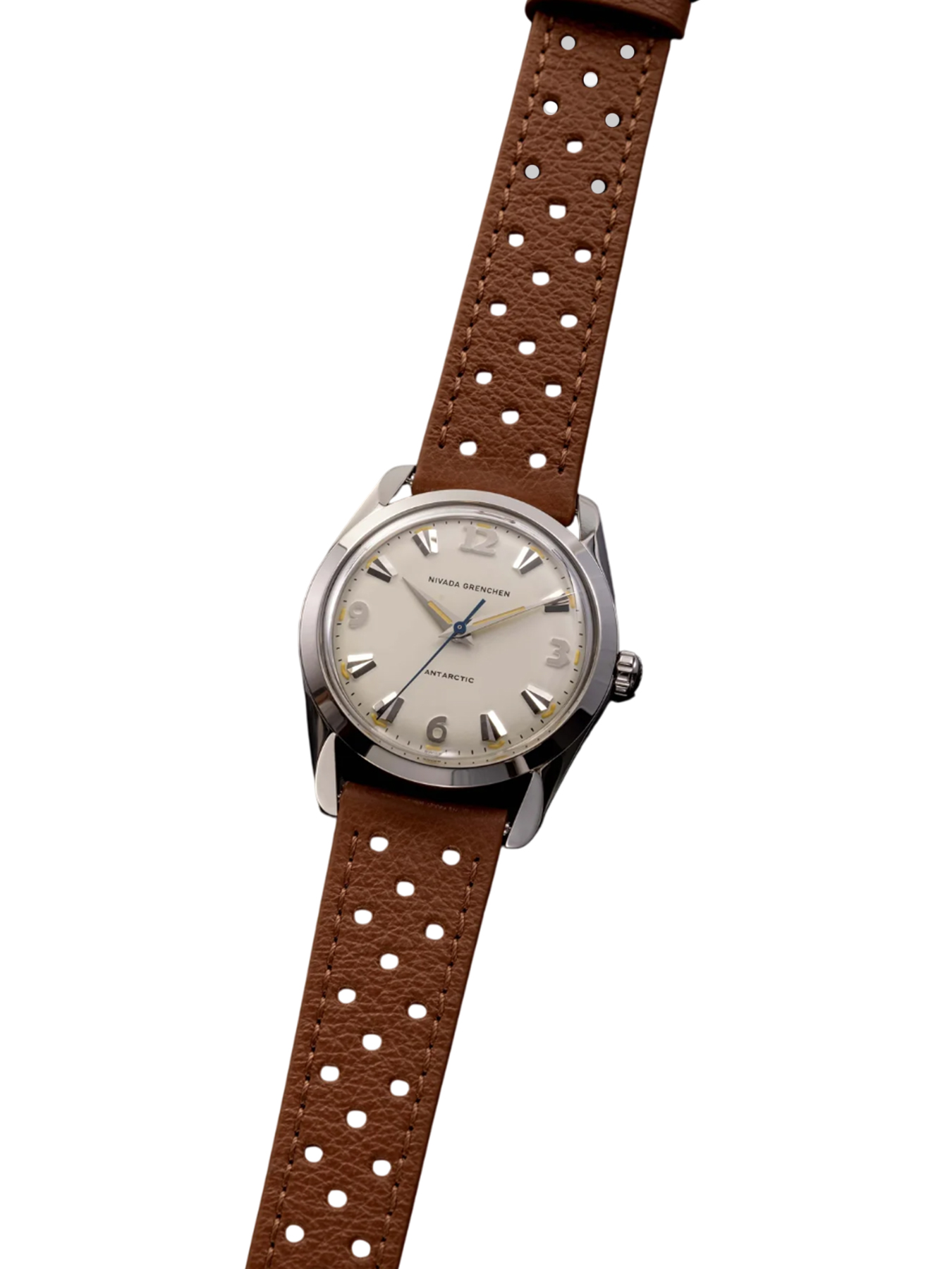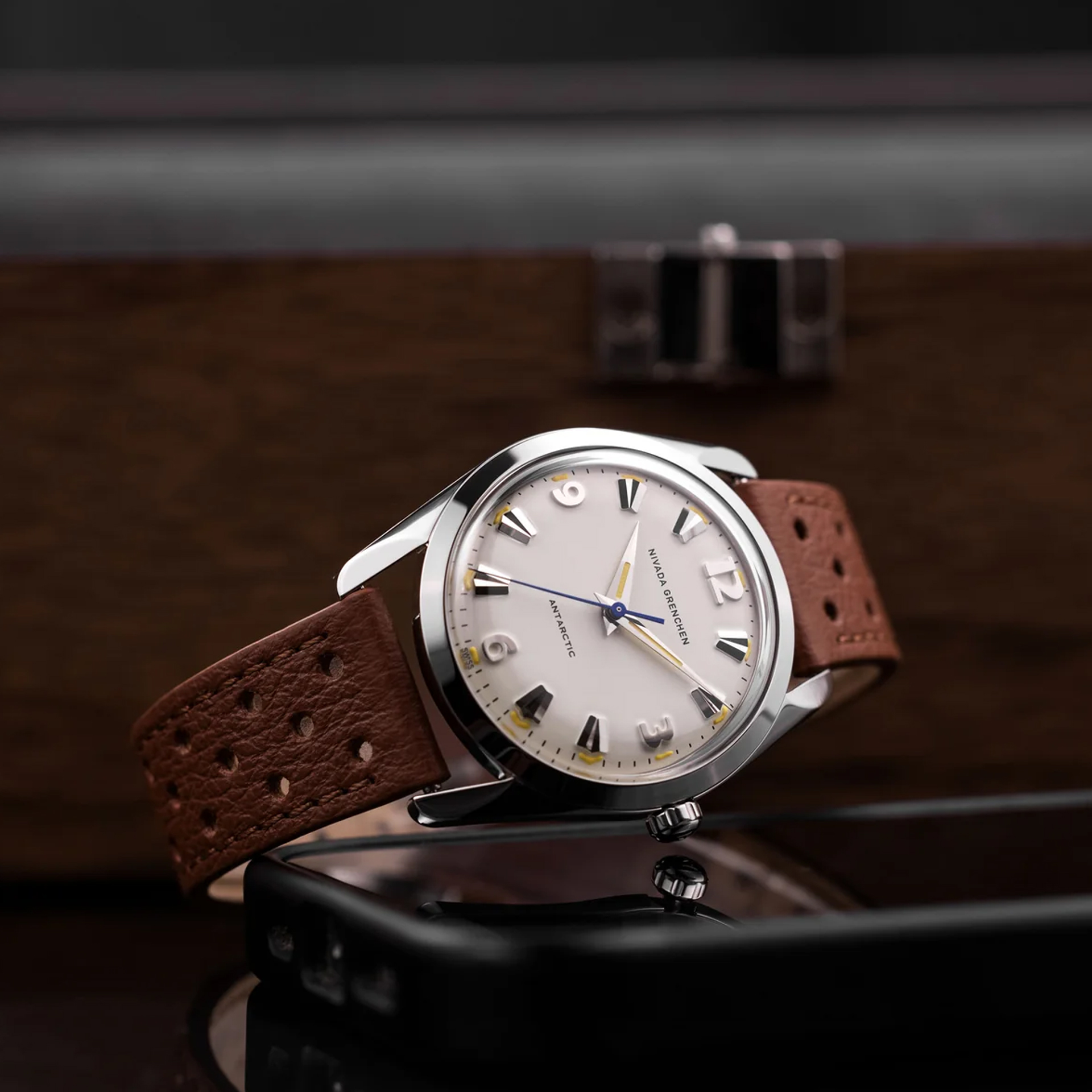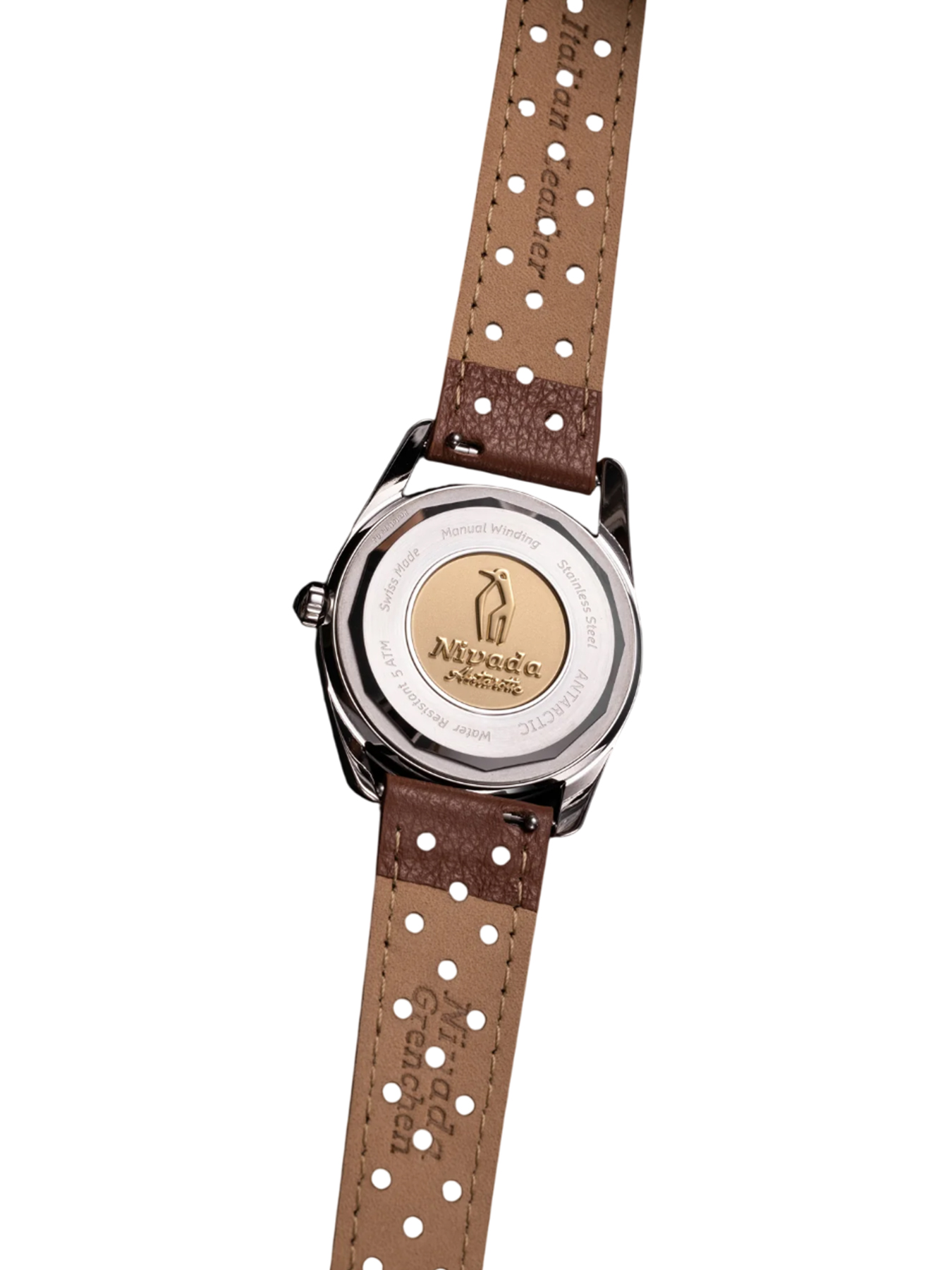 The dial proudly bears the ‘Nivada Grenchen’ signature below the 12, with «Antarctic» just above the 6. Beneath it, hugging the outer edge of the minute track, a discreet ‘Swiss’. The steel hands are of the classic dauphine style, with a slim luminescent band at their center. The elongated second hand, crafted in blued steel, adds an extra touch of elegance. On the caseback, an embossed, stylized penguin on a gold medaillon serves as a nod to the watch’s heritage. Altogether, this blend of design elements crafts a remarkable timepiece, with a unique look and feel that takes you back to the 1950s at a flick of the wrist.