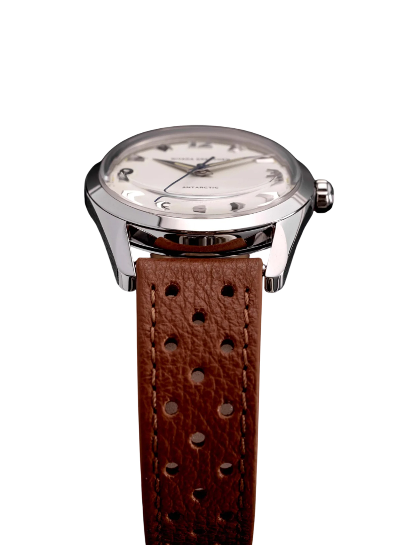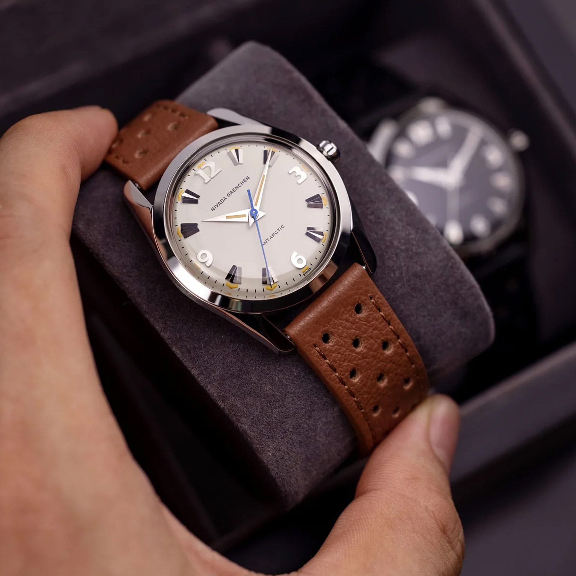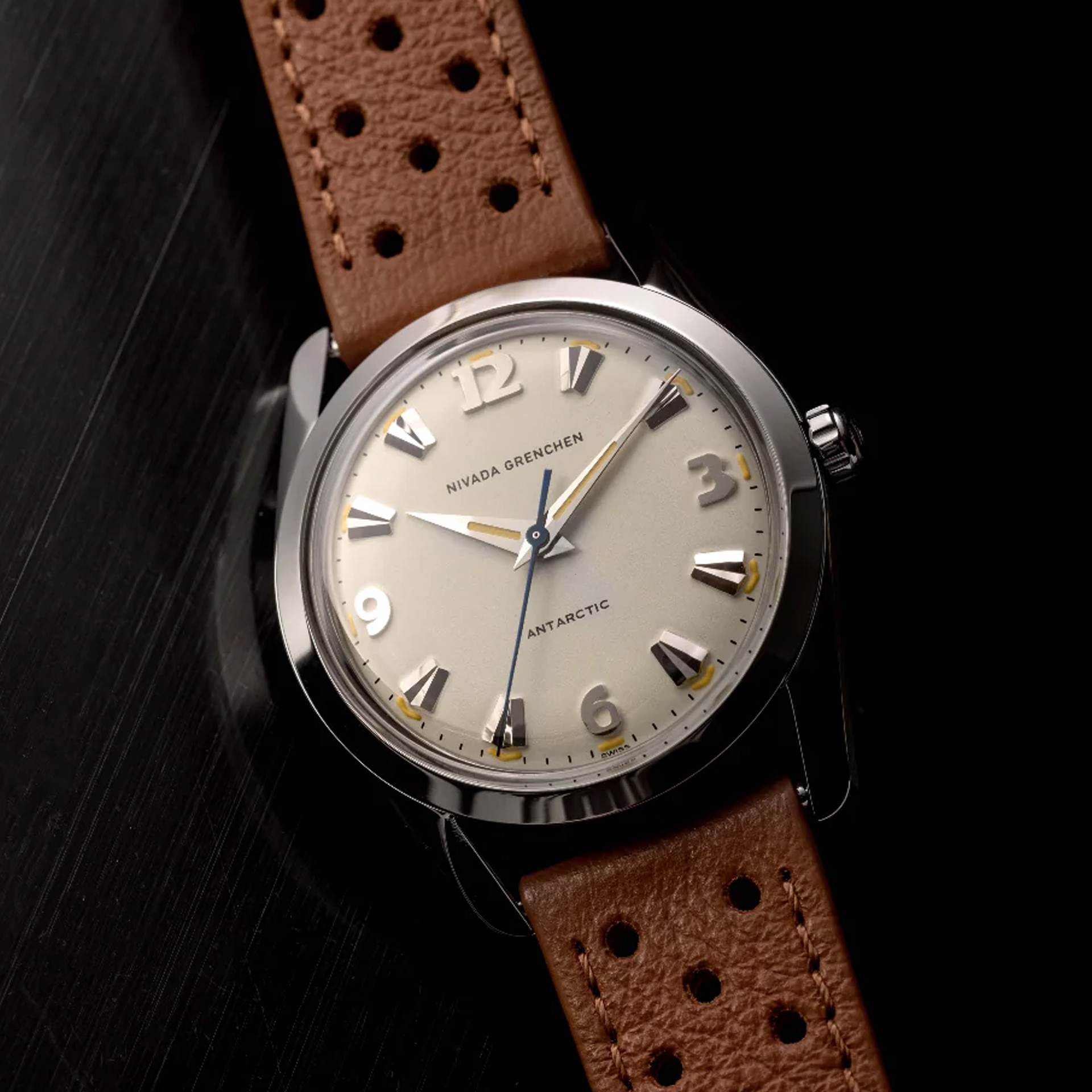 While the Antarctic’s case and crown are undeniably elegant, it’s the dial that truly stands out as the watch’s centerpiece. Available in three distinct colors — black, white, and eggshell/off-white — the dial boasts applied steel indexes. At the 12, 3, 6, and 9 o’clock positions we have Art Deco-style numerals, while arrowheads (you could say faceted icicles) serve as indexes. Brilliant details, both literally and figuratively. Instead of the conventional luminescent dots, we have curved, slightly orange luminescent arcs painted on the outer edge of the hour markers.