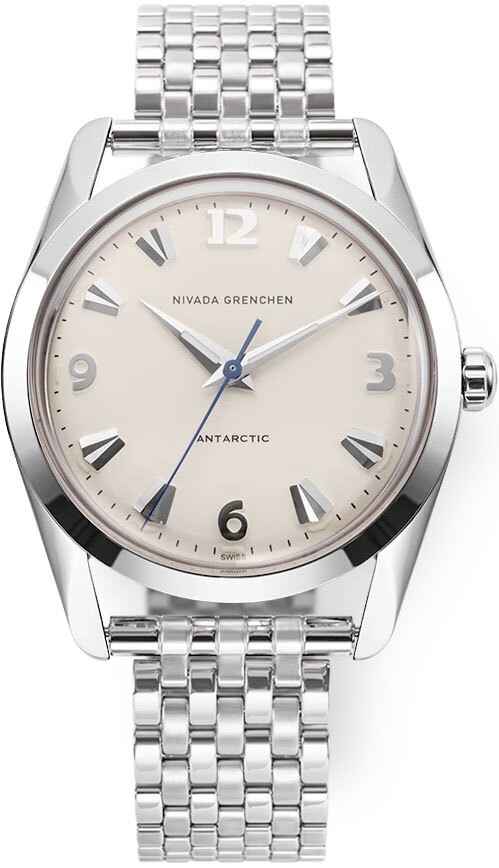 Returning to the basics, embracing all-time favorites, and capturing timeless elegance. As the trend of oversized watches wanes, Nivada Grenchen delves deep into its rich heritage to present a renewed expression of masculine watchmaking. This comes complete with impeccable, artfully crafted finishes, all housed in a 35mm case that epitomizes slender elegance. While the Antarctic’s case and crown are undeniably elegant, it’s the dial that truly stands out as the watch’s centerpiece. Available in three distinct colors — black, white, and eggshell/off-white — the dial boasts applied steel indexes. At the 12, 3, 6, and 9 o’clock positions we have Art Deco-style numerals, while arrowheads (you could say faceted icicles) serve as indexes. Brilliant details, both literally and figuratively. Instead of the conventional luminescent dots, we have curved, slightly orange luminescent arcs painted on the outer edge of the hour markers. The dial proudly bears the ‘Nivada Grenchen’ signature below the 12, with «Antarctic» just above the 6. Beneath it, hugging the outer edge of the minute track, a discreet ‘Swiss’. The steel hands are of the classic dauphine style, with a slim luminescent band at their center. The elongated second hand, crafted in blued steel, adds an extra touch of elegance. On the caseback, an embossed, stylized penguin on a gold medaillon serves as a nod to the watch’s heritage. Altogether, this blend of design elements crafts a remarkable timepiece, with a unique look and feel that takes you back to the 1950s at a flick of the wrist.