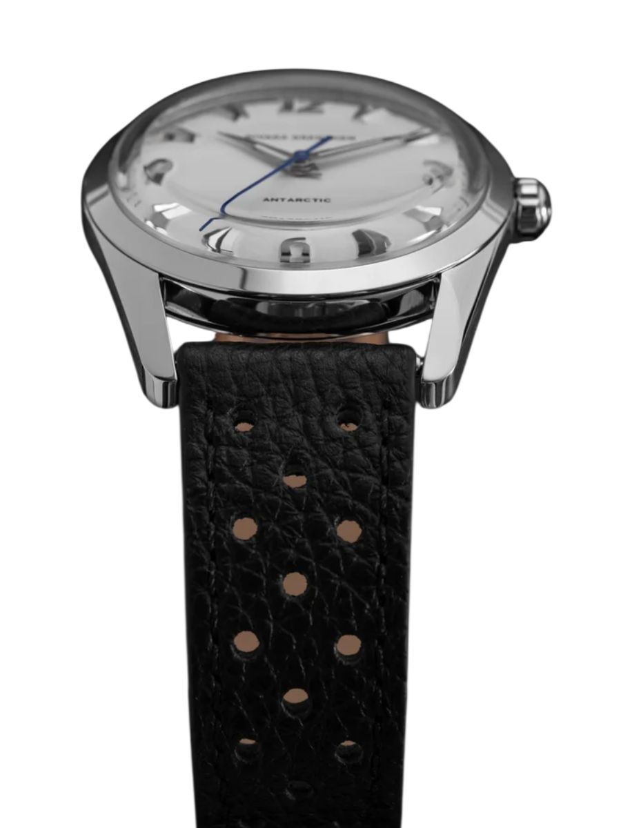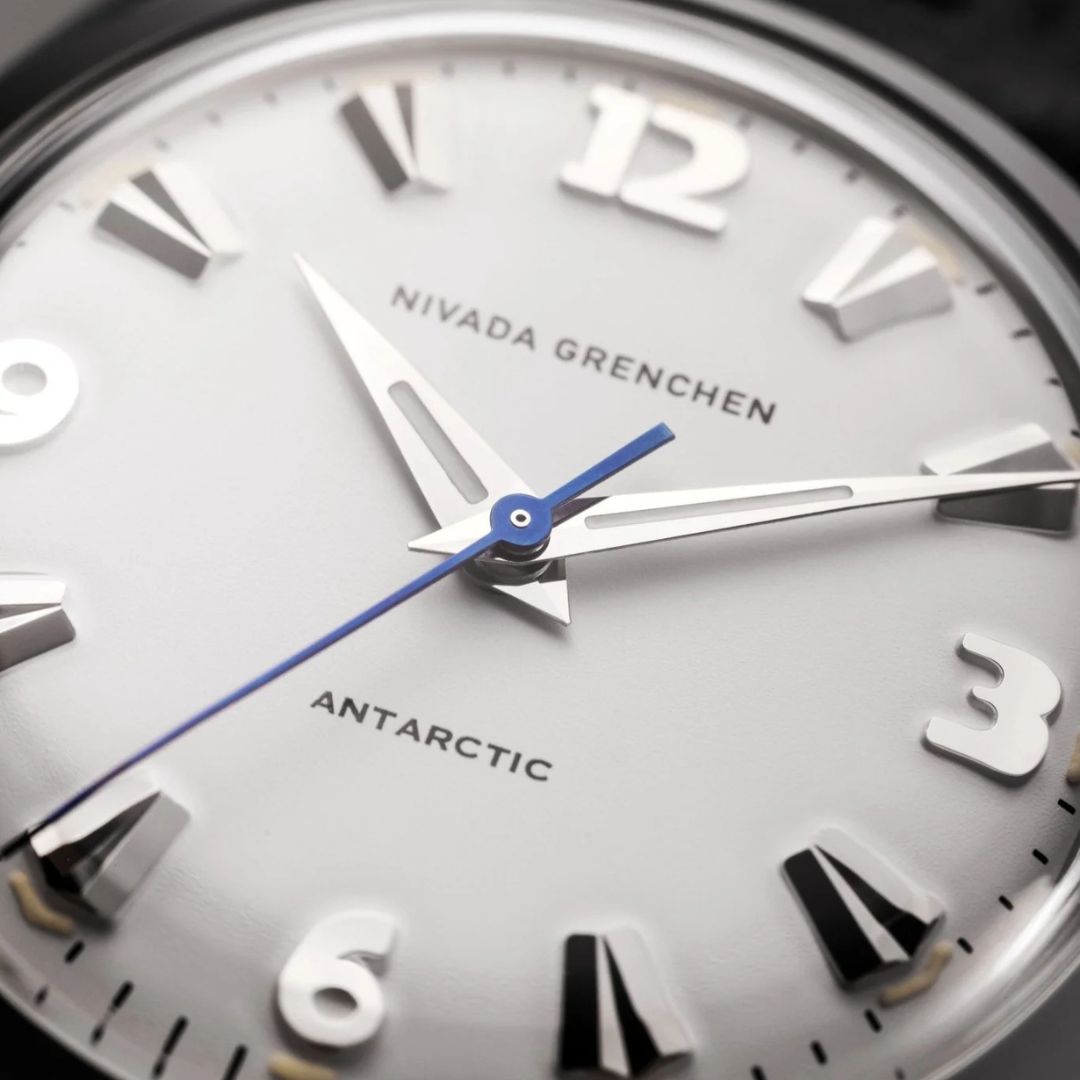 Returning to the basics, embracing all-time favorites, and capturing timeless elegance. As the trend of oversized watches wanes, Nivada Grenchen delves deep into its rich heritage to present a renewed expression of masculine watchmaking. This comes complete with impeccable, artfully crafted finishes, all housed in a 35mm case that epitomizes slender elegance. While the Antarctic’s case and crown are undeniably elegant, it’s the dial that truly stands out as the watch’s centerpiece. Available in three distinct colors — black, white, and eggshell/off-white — the dial boasts applied steel indexes. At the 12, 3, 6, and 9 o’clock positions we have Art Deco-style numerals, while arrowheads (you could say faceted icicles) serve as indexes. Brilliant details, both literally and figuratively. Instead of the conventional luminescent dots, we have curved, slightly orange luminescent arcs painted on the outer edge of the hour markers. The dial proudly bears the ‘Nivada Grenchen’ signature below the 12, with «Antarctic» just above the 6. Beneath it, hugging the outer edge of the minute track, a discreet ‘Swiss’. The steel hands are of the classic dauphine style, with a slim luminescent band at their center. The elongated second hand, crafted in blued steel, adds an extra touch of elegance. On the caseback, an embossed, stylized penguin on a gold medaillon serves as a nod to the watch’s heritage. Altogether, this blend of design elements crafts a remarkable timepiece, with a unique look and feel that takes you back to the 1950s at a flick of the wrist.