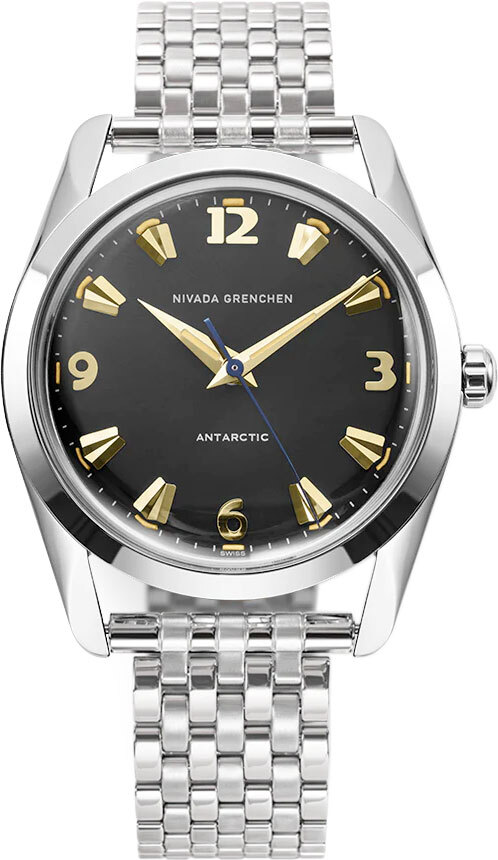Returning to the basics, embracing all-time favorites, and capturing timeless elegance. As the trend of oversized watches wanes, Nivada Grenchen delves deep into its rich heritage to present a renewed expression of masculine watchmaking. This comes complete with impeccable, artfully crafted finishes, all housed in a 35mm case that epitomizes slender elegance. While the Antarctic’s case and crown are undeniably elegant, it’s the dial that truly stands out as the watch’s centerpiece. Available in three distinct colors — black, white, and eggshell/off-white — the dial boasts applied steel indexes. At the 12, 3, 6, and 9 o’clock positions we have Art Deco-style numerals, while arrowheads (you could say faceted icicles) serve as indexes. Brilliant details, both literally and figuratively. Instead of the conventional luminescent dots, we have curved, slightly orange luminescent arcs painted on the outer edge of the hour markers. The dial proudly bears the ‘Nivada Grenchen’ signature below the 12, with «Antarctic» just above the 6. Beneath it, hugging the outer edge of the minute track, a discreet ‘Swiss’. The steel hands are of the classic dauphine style, with a slim luminescent band at their center. The elongated second hand, crafted in blued steel, adds an extra touch of elegance. On the caseback, an embossed, stylized penguin on a gold medaillon serves as a nod to the watch’s heritage. Altogether, this blend of design elements crafts a remarkable timepiece, with a unique look and feel that takes you back to the 1950s at a flick of the wrist.