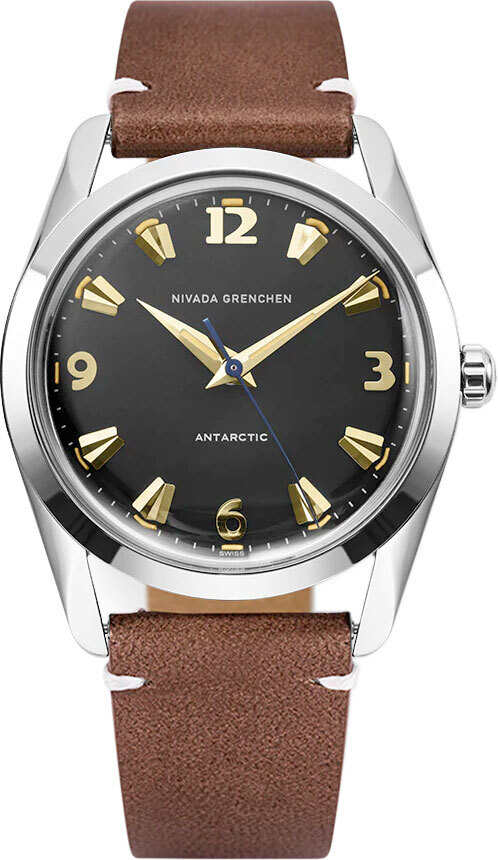 Returning to the basics, embracing all-time favorites, and capturing timeless elegance. As the trend of oversized watches wanes, Nivada Grenchen delves deep into its rich heritage to present a renewed expression of masculine watchmaking. This comes complete with impeccable, artfully crafted finishes, all housed in a 35mm case that epitomizes slender elegance. While the Antarctic’s case and crown are undeniably elegant, it’s the dial that truly stands out as the watch’s centerpiece. Available in three distinct colors — black, white, and eggshell/off-white — the dial boasts applied steel indexes. At the 12, 3, 6, and 9 o’clock positions we have Art Deco-style numerals, while arrowheads (you could say faceted icicles) serve as indexes. Brilliant details, both literally and figuratively. Instead of the conventional luminescent dots, we have curved, slightly orange luminescent arcs painted on the outer edge of the hour markers. The dial proudly bears the ‘Nivada Grenchen’ signature below the 12, with «Antarctic» just above the 6. Beneath it, hugging the outer edge of the minute track, a discreet ‘Swiss’. The steel hands are of the classic dauphine style, with a slim luminescent band at their center. The elongated second hand, crafted in blued steel, adds an extra touch of elegance. On the caseback, an embossed, stylized penguin on a gold medaillon serves as a nod to the watch’s heritage. Altogether, this blend of design elements crafts a remarkable timepiece, with a unique look and feel that takes you back to the 1950s at a flick of the wrist.