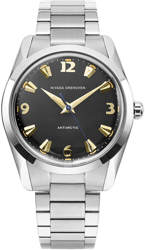 Returning to the basics, embracing all-time favorites, and capturing timeless elegance. As the trend of oversized watches wanes, Nivada Grenchen delves deep into its rich heritage to present a renewed expression of masculine watchmaking. This comes complete with impeccable, artfully crafted finishes, all housed in a 35mm case that epitomizes slender elegance. While the Antarctic’s case and crown are undeniably elegant, it’s the dial that truly stands out as the watch’s centerpiece. Available in three distinct colors — black, white, and eggshell/off-white — the dial boasts applied steel indexes. At the 12, 3, 6, and 9 o’clock positions we have Art Deco-style numerals, while arrowheads (you could say faceted icicles) serve as indexes. Brilliant details, both literally and figuratively. Instead of the conventional luminescent dots, we have curved, slightly orange luminescent arcs painted on the outer edge of the hour markers. The dial proudly bears the ‘Nivada Grenchen’ signature below the 12, with «Antarctic» just above the 6. Beneath it, hugging the outer edge of the minute track, a discreet ‘Swiss’. The steel hands are of the classic dauphine style, with a slim luminescent band at their center. The elongated second hand, crafted in blued steel, adds an extra touch of elegance. On the caseback, an embossed, stylized penguin on a gold medaillon serves as a nod to the watch’s heritage. Altogether, this blend of design elements crafts a remarkable timepiece, with a unique look and feel that takes you back to the 1950s at a flick of the wrist.