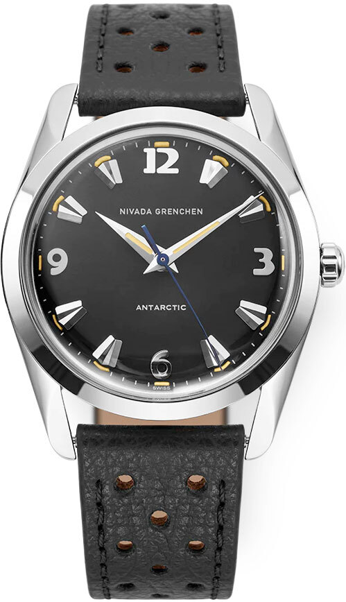 Returning to the basics, embracing all-time favorites, and capturing timeless elegance. As the trend of oversized watches wanes, Nivada Grenchen delves deep into its rich heritage to present a renewed expression of masculine watchmaking. This comes complete with impeccable, artfully crafted finishes, all housed in a 35mm case that epitomizes slender elegance. While the Antarctic’s case and crown are undeniably elegant, it’s the dial that truly stands out as the watch’s centerpiece. Available in three distinct colors — black, white, and eggshell/off-white — the dial boasts applied steel indexes. At the 12, 3, 6, and 9 o’clock positions we have Art Deco-style numerals, while arrowheads (you could say faceted icicles) serve as indexes. Brilliant details, both literally and figuratively. Instead of the conventional luminescent dots, we have curved, slightly orange luminescent arcs painted on the outer edge of the hour markers. The dial proudly bears the ‘Nivada Grenchen’ signature below the 12, with «Antarctic» just above the 6. Beneath it, hugging the outer edge of the minute track, a discreet ‘Swiss’. The steel hands are of the classic dauphine style, with a slim luminescent band at their center. The elongated second hand, crafted in blued steel, adds an extra touch of elegance. On the caseback, an embossed, stylized penguin on a gold medaillon serves as a nod to the watch’s heritage. Altogether, this blend of design elements crafts a remarkable timepiece, with a unique look and feel that takes you back to the 1950s at a flick of the wrist.
