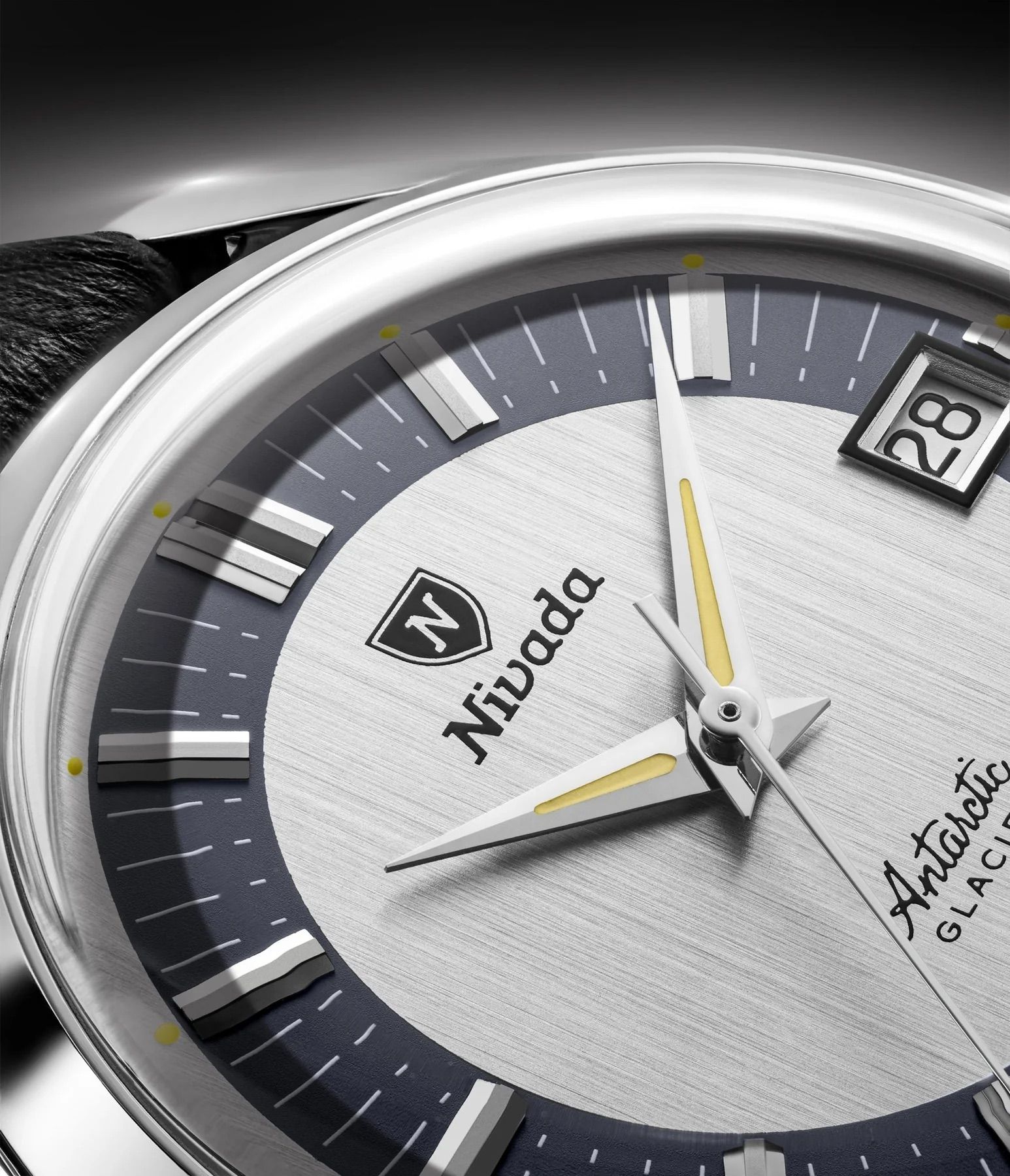 Drawing inspiration from the legendary Antarctic Glacier of the 1960s, the Antarctic Glacier 35mm with Tuxedo Dial reinterprets Nivada’s polar heritage for the modern explorer. Its vertically brushed silver and anthracite two-tone dial nicknamed the Tuxedo for its refined contrast features applied steel indexes on a dark outer ring, offering remarkable depth, contrast, and luminosity.