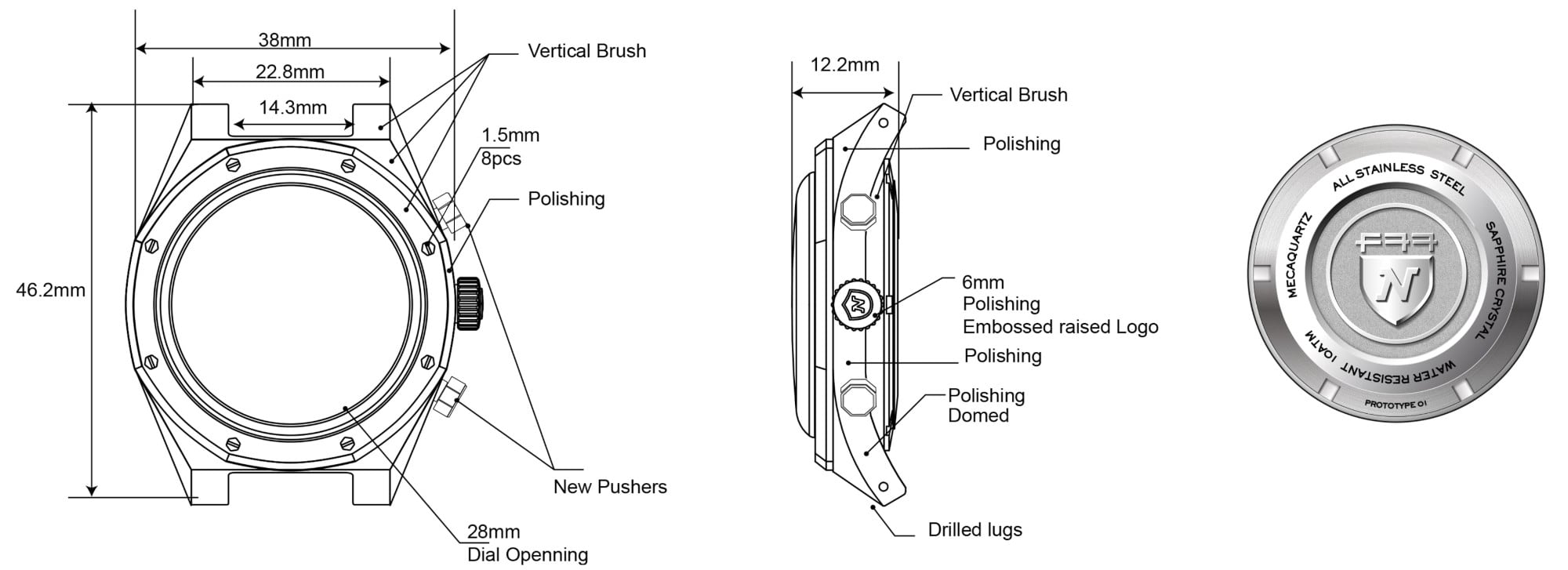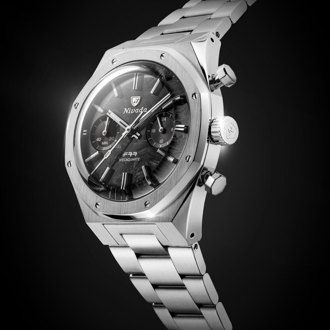 the first F77 Chrono Mecaquartz. Ever. The F77 has firmly earned its place in our modern collection, so evolving it into a chronograph felt both natural and true to our chronograph DNA. Because the F77 never existed as a Chrono Mecaquartz before, this is not a re-edition, it’s a brand-new creation. The F77 Chrono Mecaquartz Matte Carbon Dial is the most modern expression of the collection, swapping the historical woven texture for a stealthy matte carbon dial. The darker surface amplifies the contrast with the subdials, indexes and hands, giving the chronograph a more technical, contemporary character while preserving the F77 design codes: 38 mm 316L steel case, integrated bracelet, and riveted bezel. At its core beats the VK64 mecaquartz movement, a hybrid caliber that combines quartz precision with a mechanical chronograph module, allowing the central chronograph hand to sweep smoothly and the pushers to operate with a satisfying mechanical feel. Approximately three years of battery autonomy, a double-domed sapphire crystal, solid screw-down caseback and 10 ATM water resistance make this F77 as practical as it is sharp. Available on steel, Velcro canvas or rubber, it brings a more technical, urban look to the F77 Chrono Mecaquartz line-up.