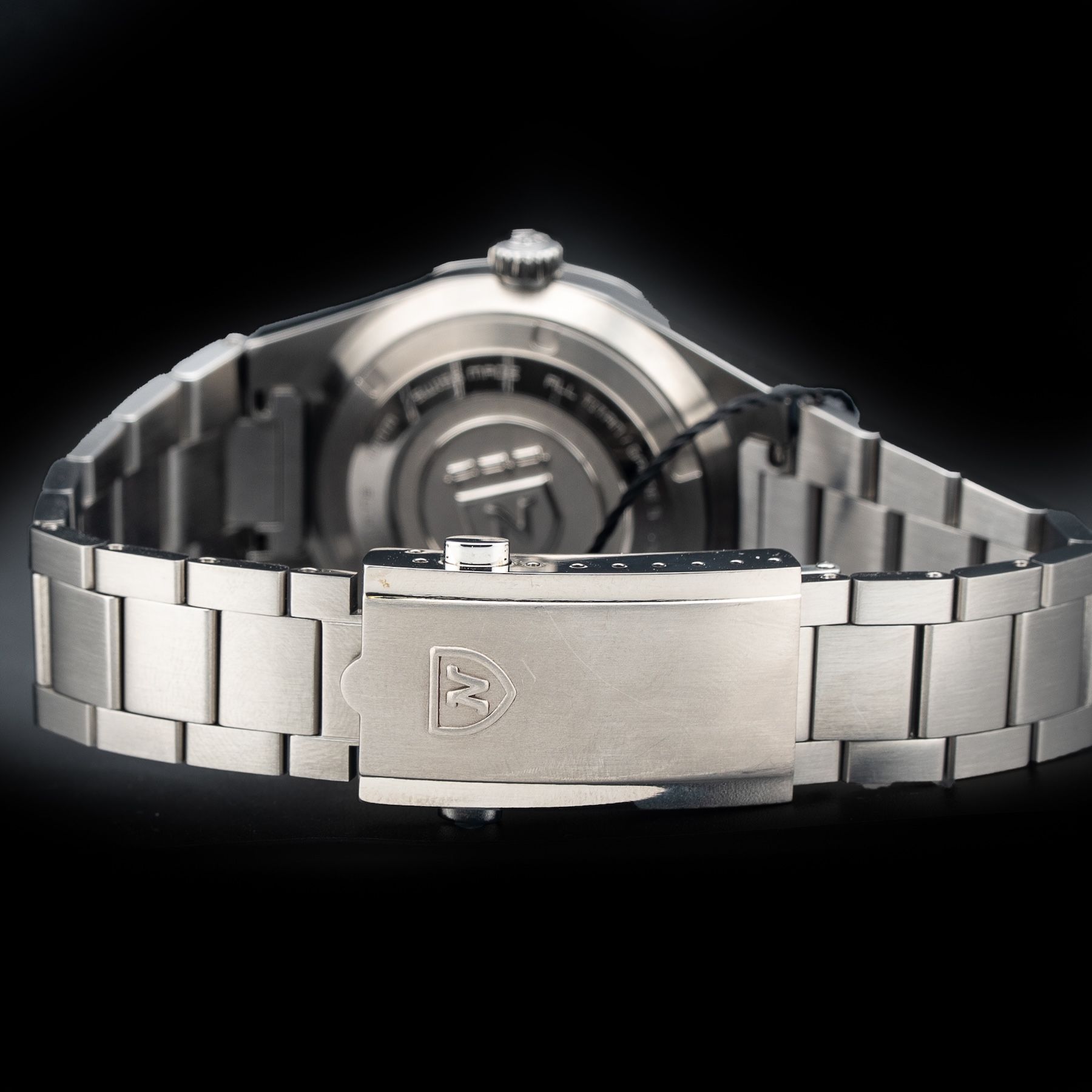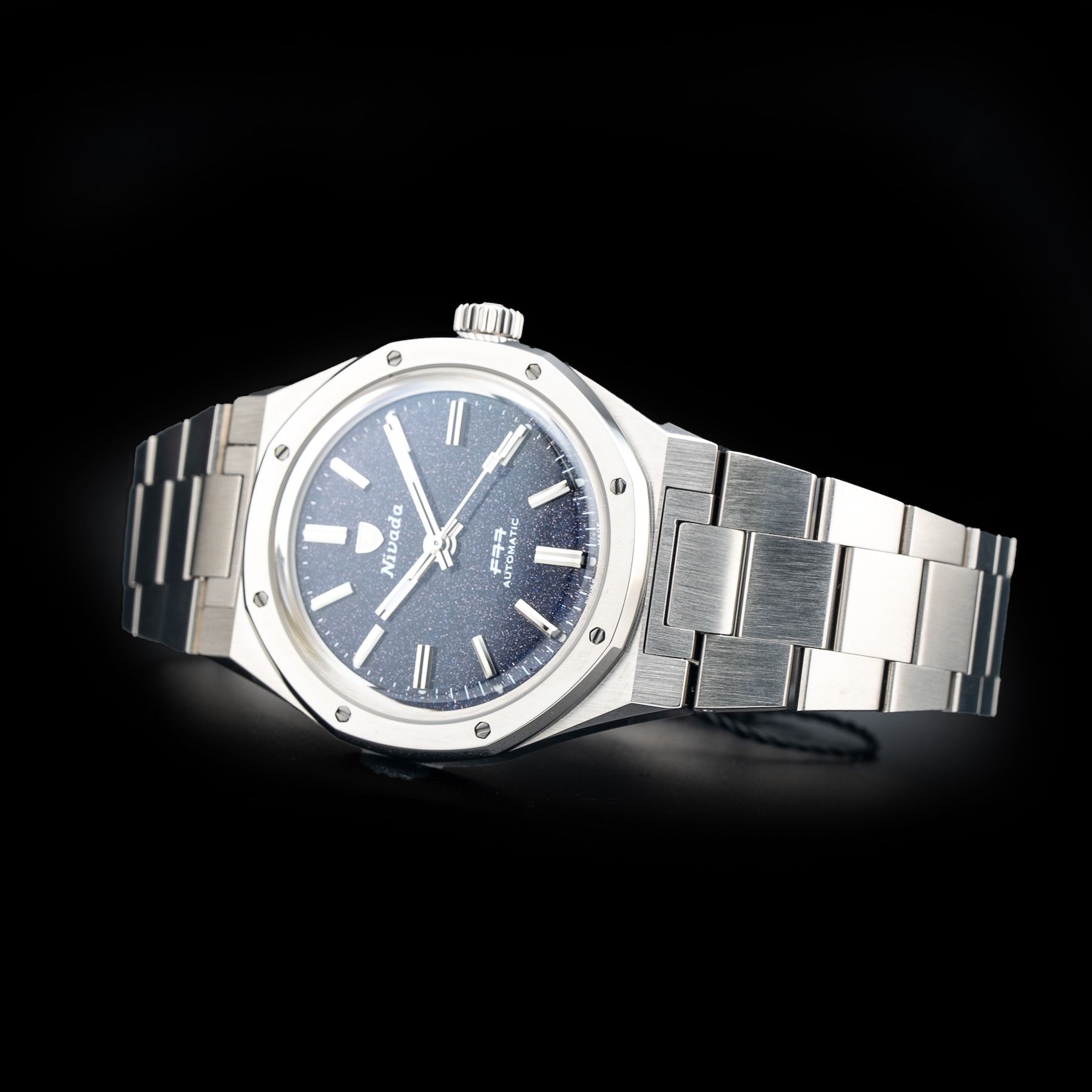 - This timepiece features a 37mm titanium case paired with a high quality titanium bracelet. It showcases a distinctive blue dial and is powered by a precise automatic winding movement. The watch is designed with a water resistance of up to 100m.