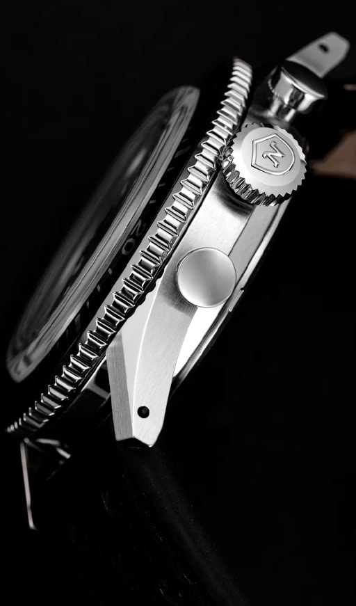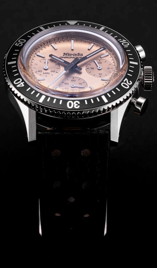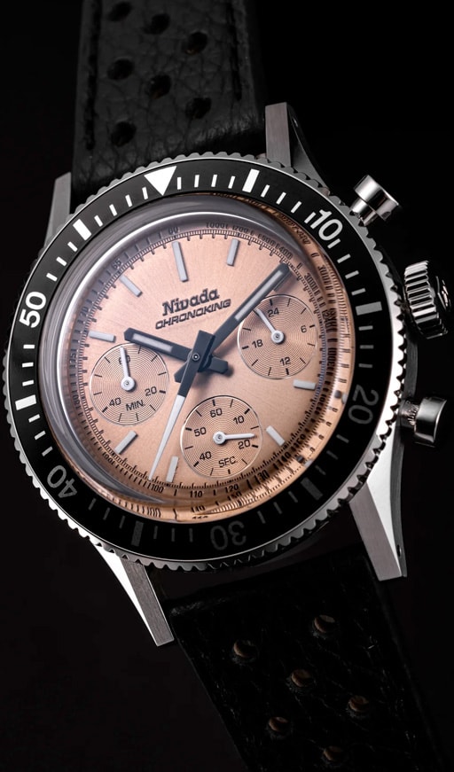 The Nivada Chronoking, assembled in Switzerland, houses the tried and trusted TMI VK63A meca-quartz movement. Press the stopwatch pusher and watch the chronograph hand sweep over the dial with that same smoothness we love in a mechanical watch. The meca-quartz movement combines the precision of quartz with the feel of a self-winding mechanical movement, the best of old-school and avant-garde. The quartz module keeps the time, while the mechanical assembly keeps the chronograph running smoothly. That’s why they are often referred to as hybrid movements.