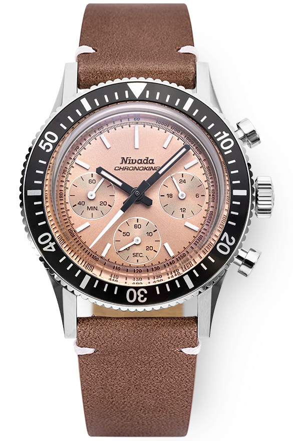 The Nivada Chronoking, assembled in Switzerland, houses the tried and trusted TMI VK63A meca-quartz movement. Press the stopwatch pusher and watch the chronograph hand sweep over the dial with that same smoothness we love in a mechanical watch. The meca-quartz movement combines the precision of quartz with the feel of a self-winding mechanical movement, the best of old-school and avant-garde. The quartz module keeps the time, while the mechanical assembly keeps the chronograph running smoothly. That’s why they are often referred to as hybrid movements.