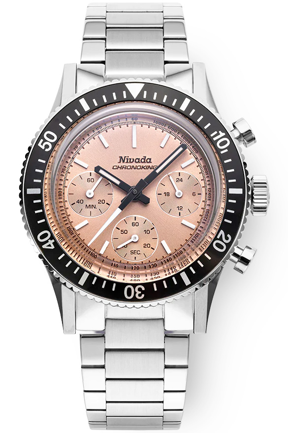 The Nivada Chronoking, assembled in Switzerland, houses the tried and trusted TMI VK63A meca-quartz movement. Press the stopwatch pusher and watch the chronograph hand sweep over the dial with that same smoothness we love in a mechanical watch. The meca-quartz movement combines the precision of quartz with the feel of a self-winding mechanical movement, the best of old-school and avant-garde. The quartz module keeps the time, while the mechanical assembly keeps the chronograph running smoothly. That’s why they are often referred to as hybrid movements.