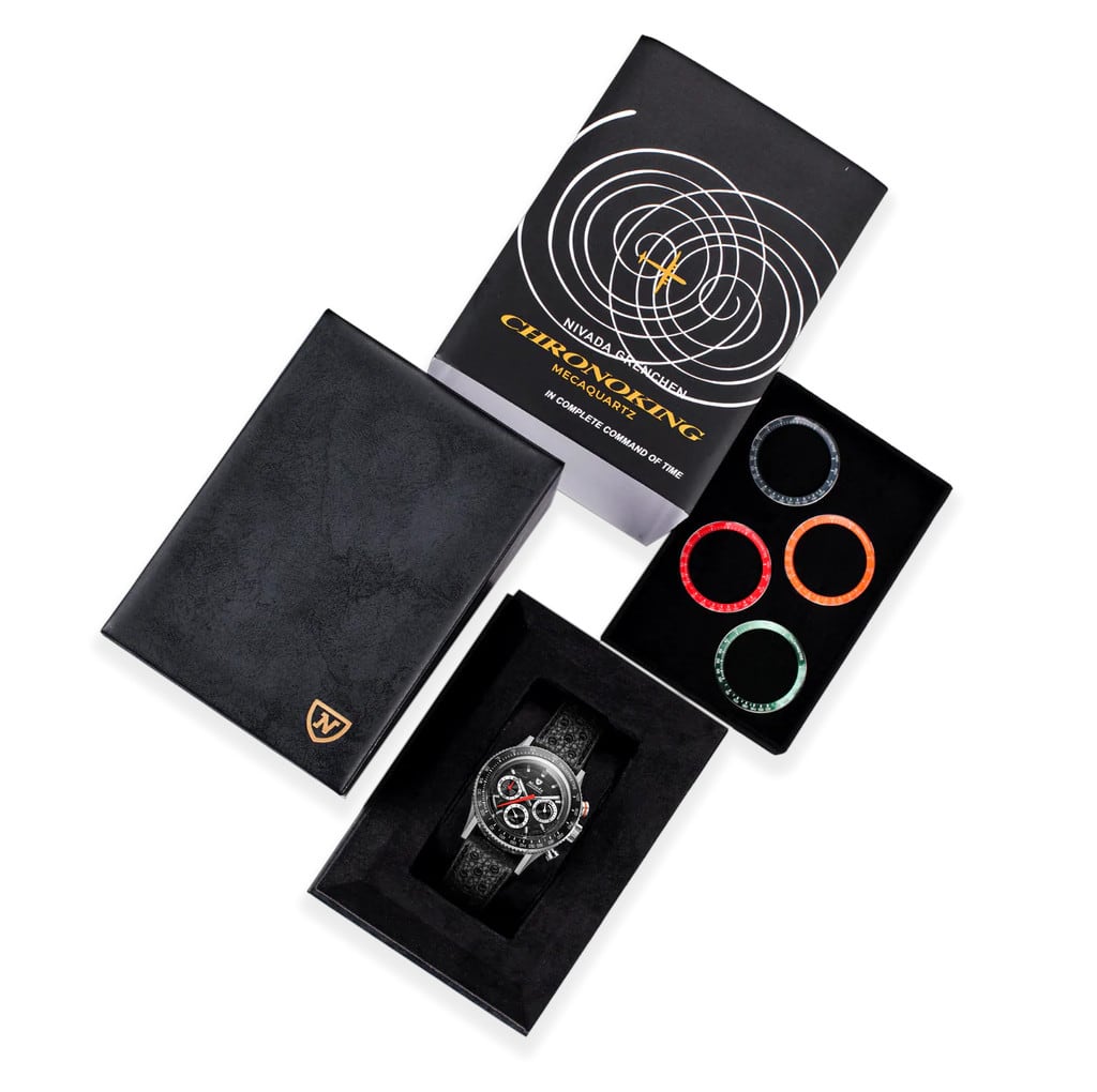 The bezel is interchangeable, equipped with 120 clicks, and housed in a striking 38mm case topped with a domed crystal.The twist? A vibrant dial lineup available in black, blue, green, grey and black carbon. On the caseback, the engraved Chronoking signature anchors the watch to its legacy.The carbon-fiber dial version is limited to 500 pieces, each individually numbered (001/500). All other dial variants are also numbered.
