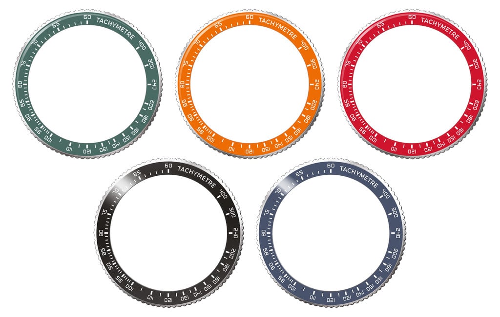 Available in vibrant shades; Blue, orange, red, black, and green.These bezels fuse racing function with bold visual identity.