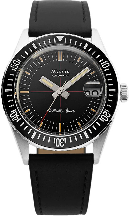 Experience the undeniable presence of the Nivada Grenchen Antarctic Diver 32038A17. With a solid 38mm case and vintage-inspired design, this watch exudes casual chic. The black dial, adorned with patinaed "cream latte" hands and indexes, pays homage to its predecessor. Its durable black ceramic insert bezel and discreet "red cross hairs" add to its allure. Complete with the iconic Nivada Automatic logo and a penguin emblem on the caseback, this reissue is a true tribute to the original Antarctic collection.