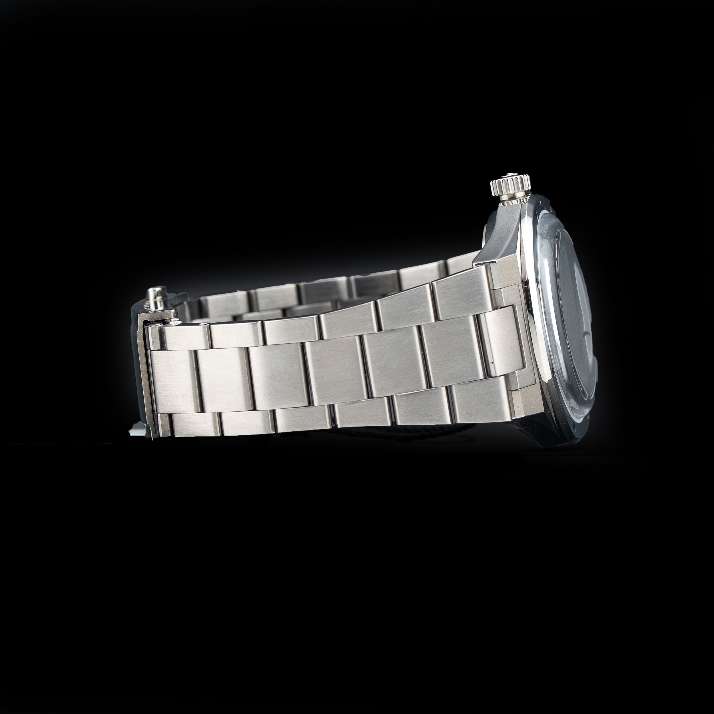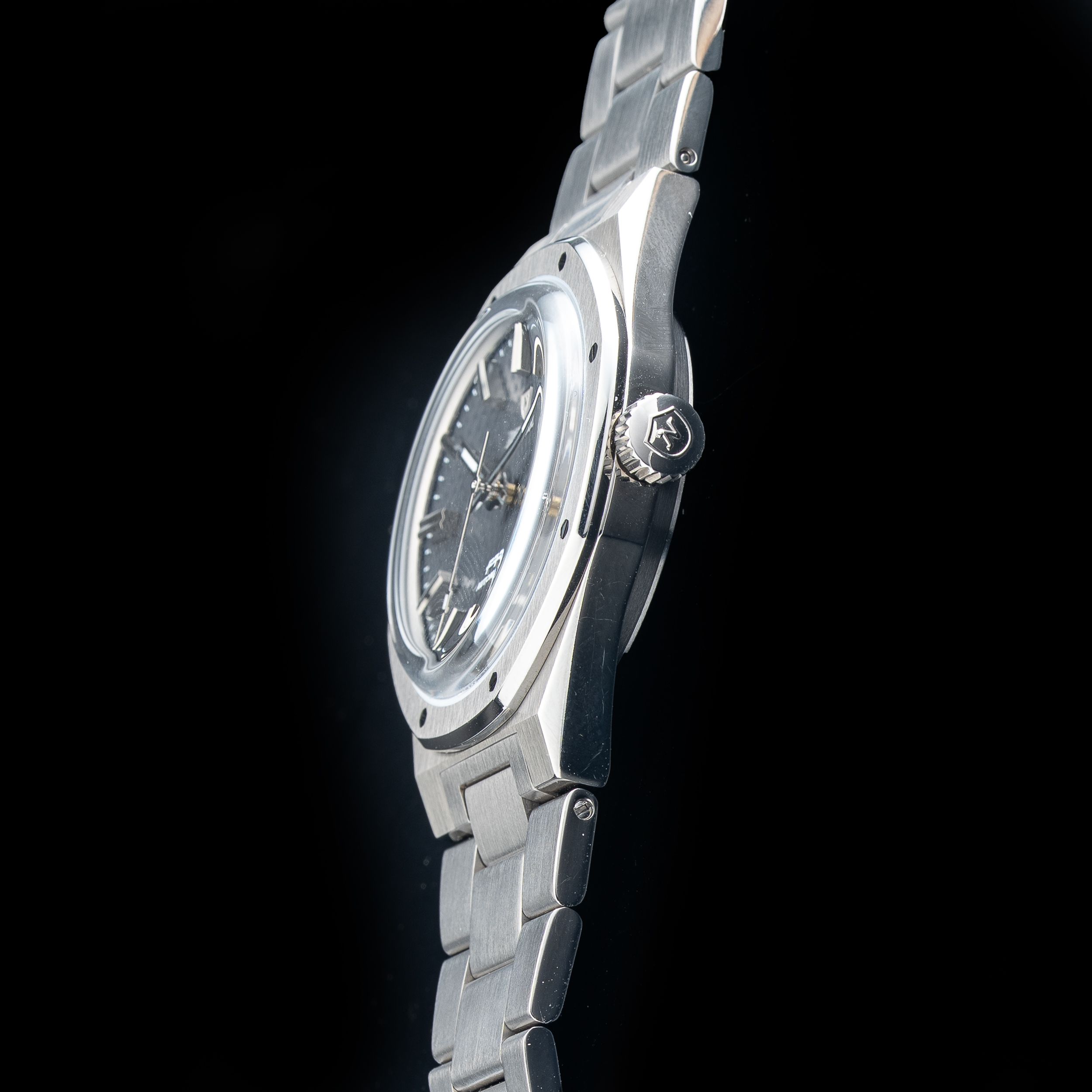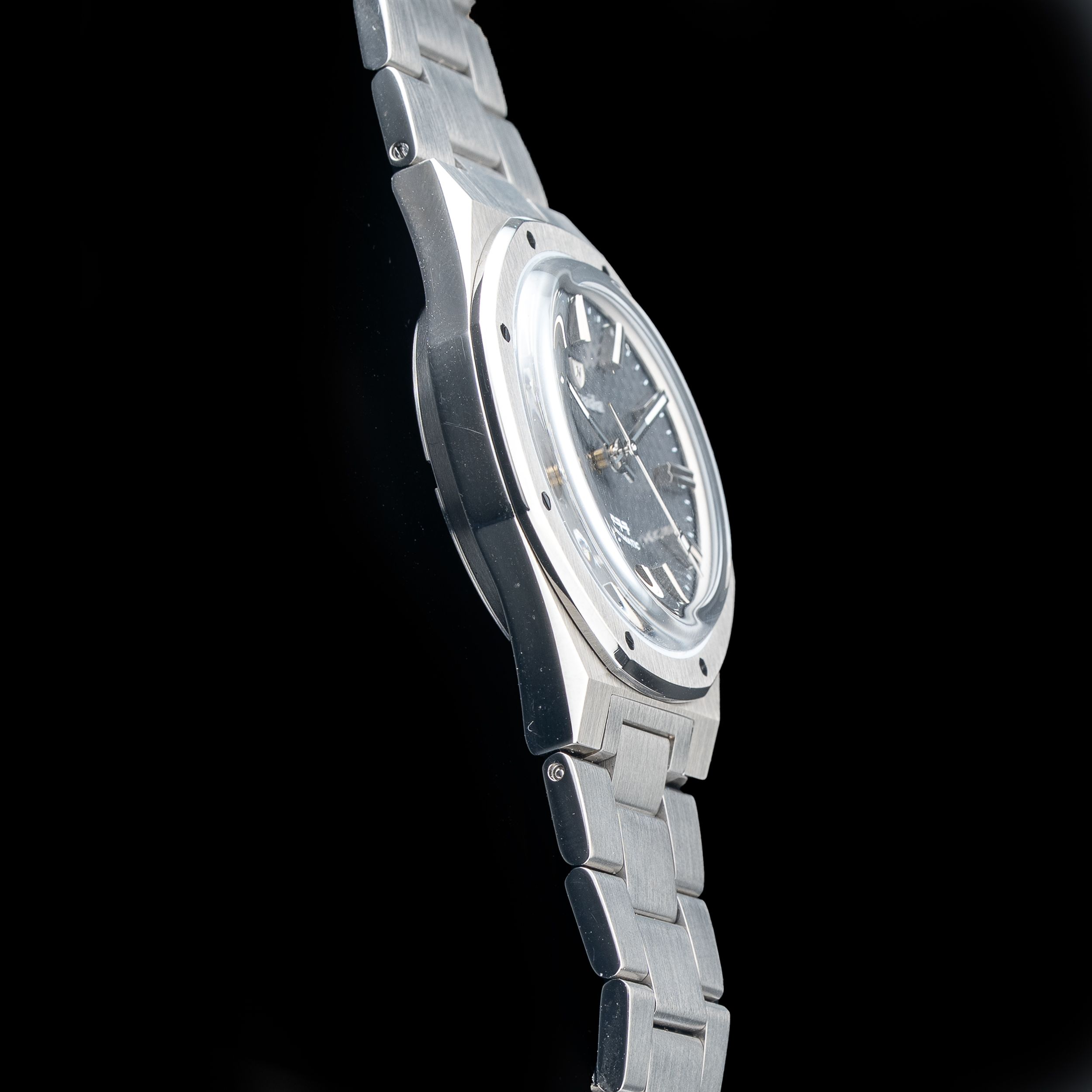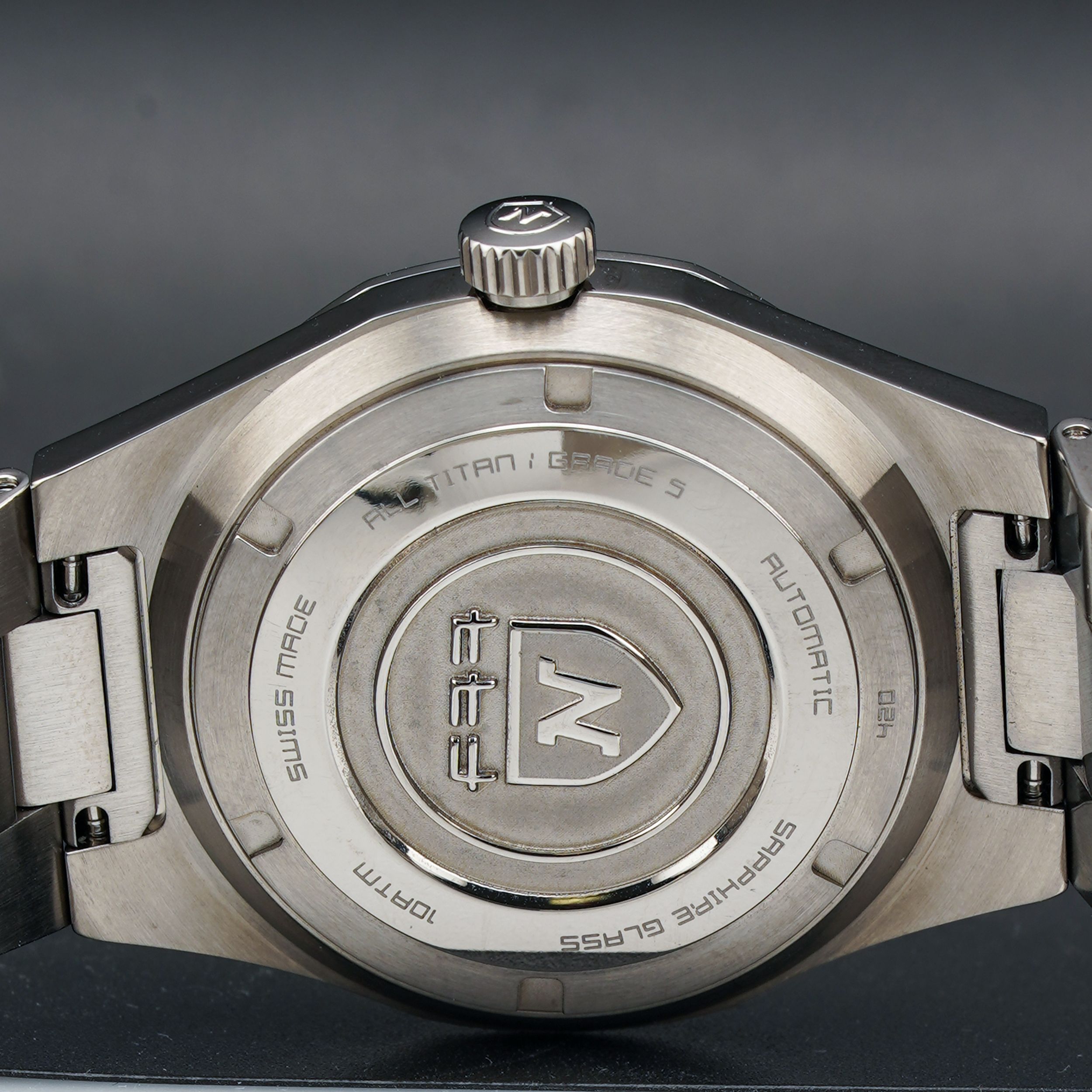 This watch features a 37mm titanium case on titanium bracelet. This watch also sports a anthracite dial. Powered by a mechanical automatic movement. Water resistance up to 100 meters.