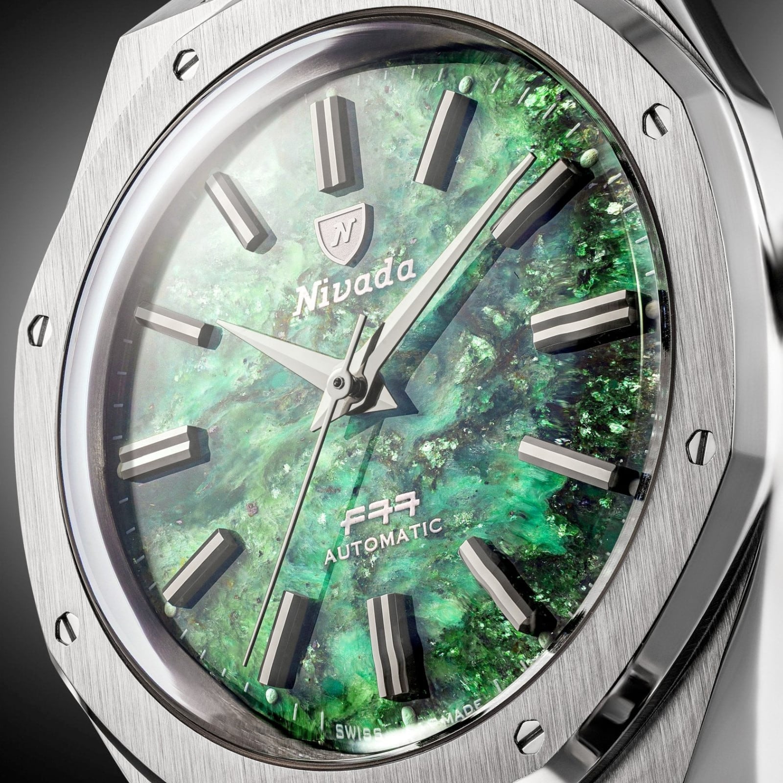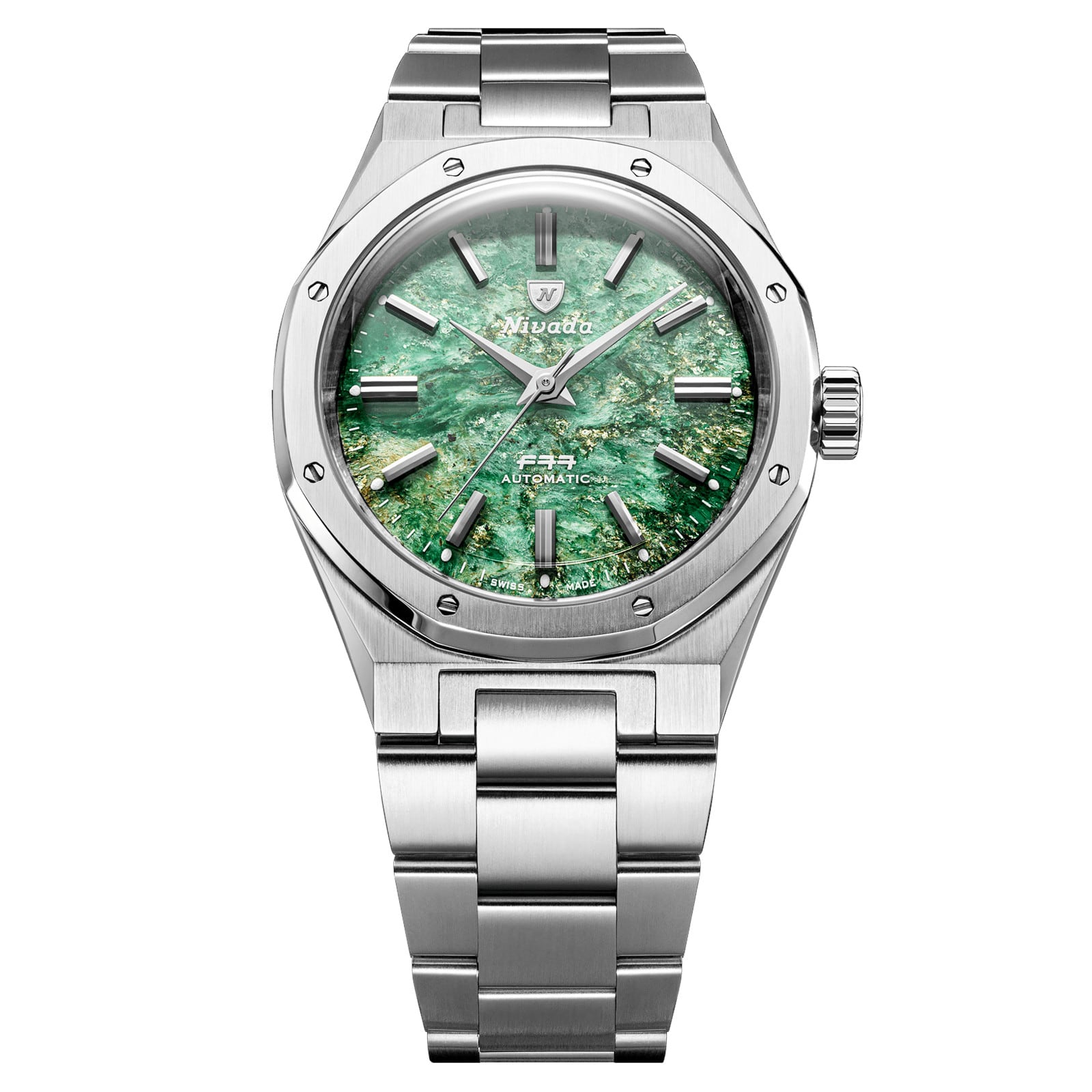 A natural green Aventurine dial offering organic depth within the refined F77 MKII steel case.