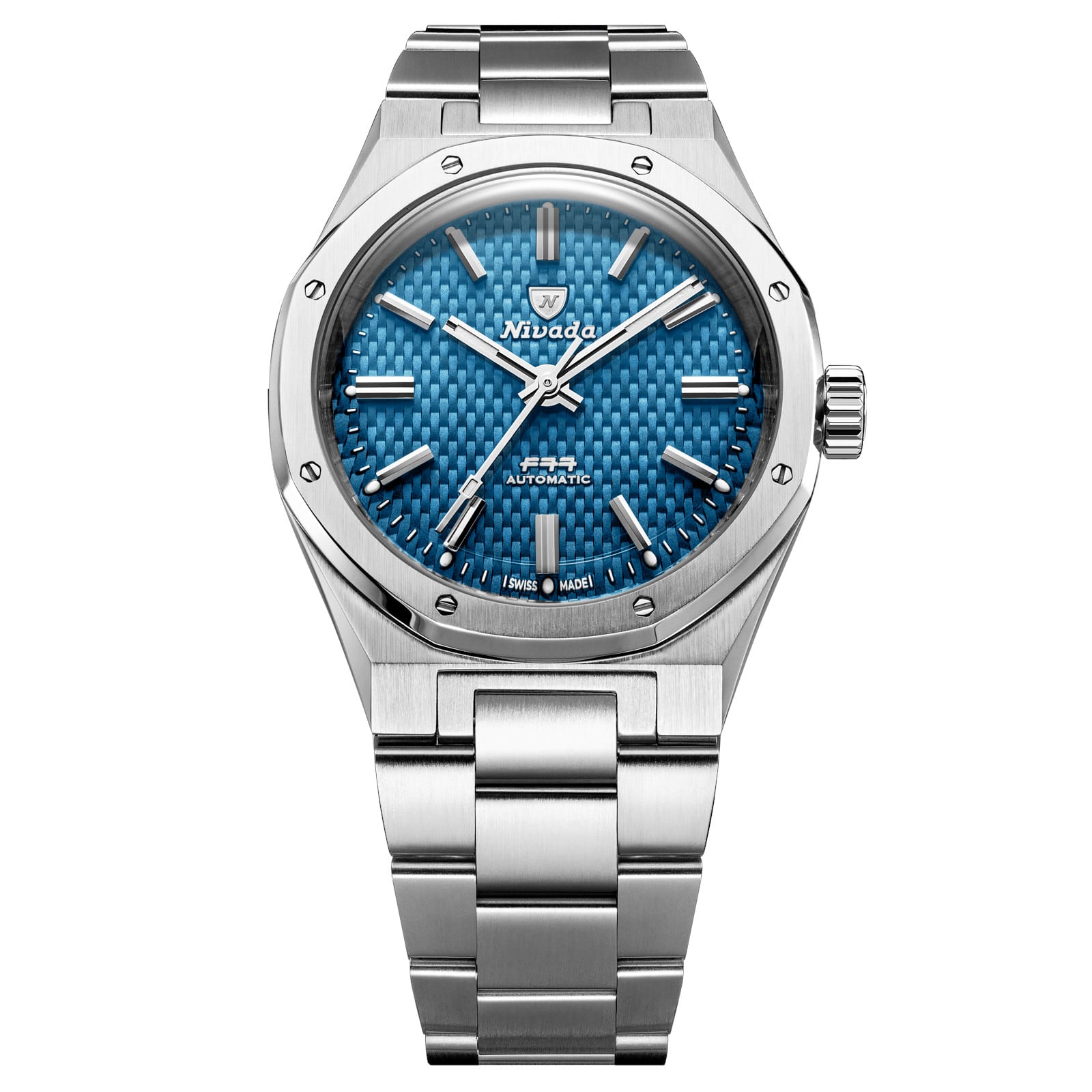 The F77 MKII Blue Tressed Dial enhances the classic integrated sports watch aesthetic with texture and contrast. Its embossed pattern creates subtle movement under light, while the applied indexes and luminous accents ensure clarity. The 38mm steel case remains faithful to the original proportions while benefiting from MKII ergonomic refinements. Powered by the Swiss automatic SOPROD P024 movement with 42-hour reserve. Sport-luxury, distilled.