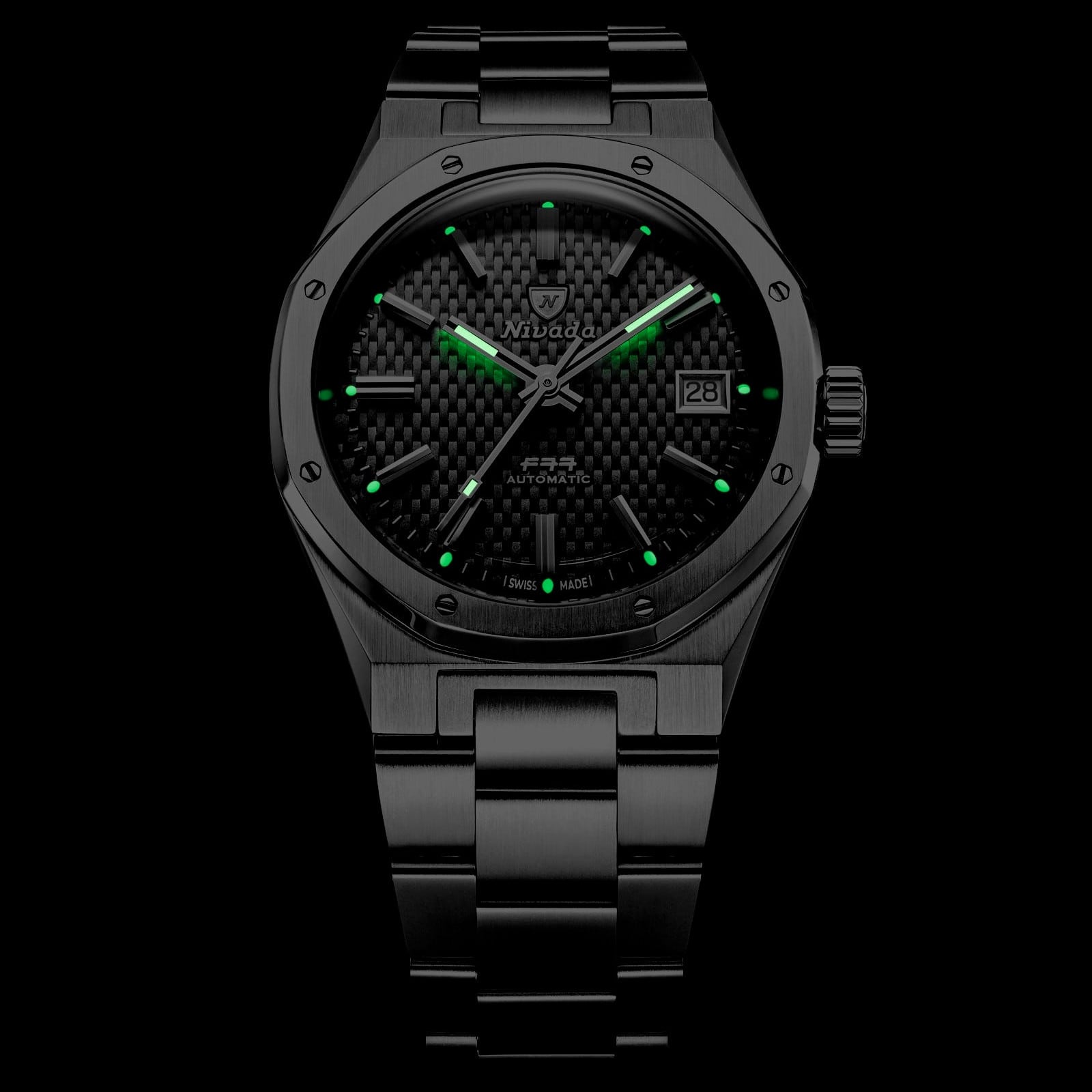 The F77 MKII Tressed Dial Black preserves the DNA of the original 1977 F77. Its embossed basket-weave dial creates depth and texture while maintaining perfect legibility. The interplay of light across the patterned surface enhances the applied indexes and faceted hands, reinforcing the architectural strength of the case. Housed in a 38mm stainless steel case with alternating brushed and polished finishes, the MKII refinement improves ergonomics while preserving the iconic octagonal bezel secured by eight visible screws. Inside, the Swiss automatic SOPROD P024 movement delivers precision and a 42-hour power reserve, with or without date display.