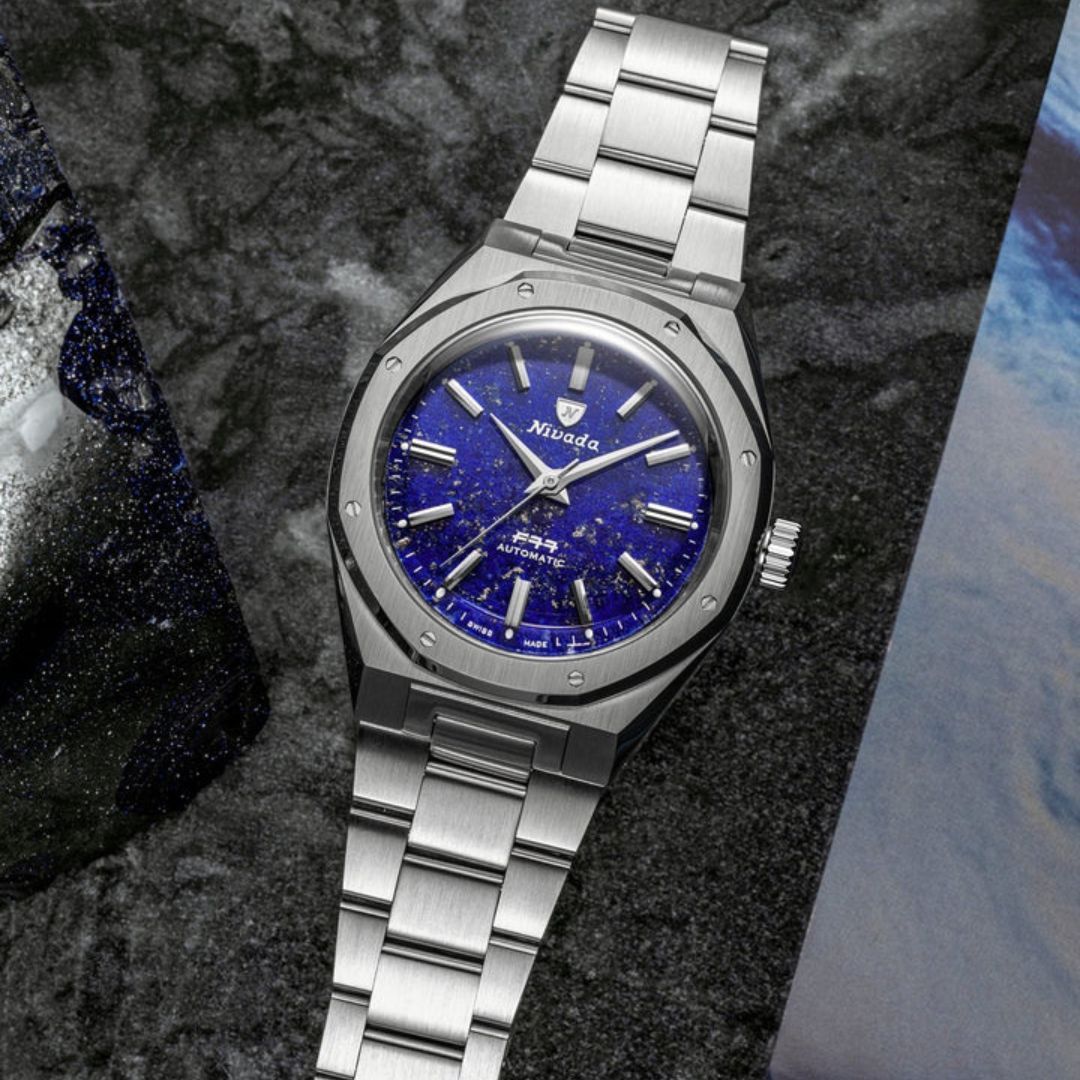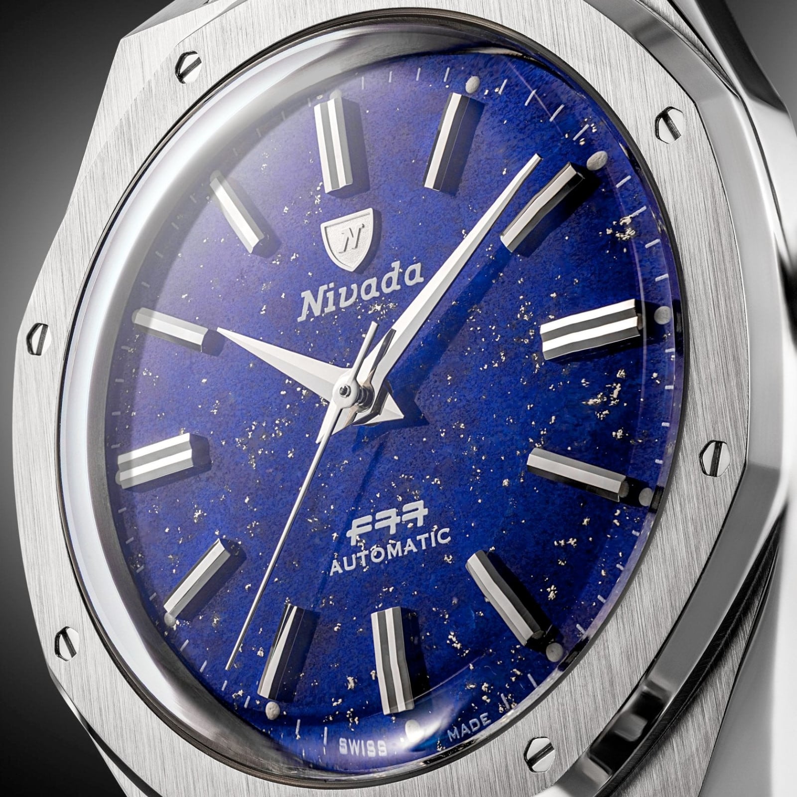 The F77 Stainless Steel Lapis Lazuli features a dial crafted from genuine lapis lazuli, a deep blue semi-precious stone prized for its rich color and natural golden flecks. Each dial is unique, with patterns reminiscent of a starry night sky, offering a dynamic visual experience that changes with the lighting. This natural stone dial, combined with applied silver indexes and baton-style hands, pays homage to the minimalist aesthetic of the original 1977 model.